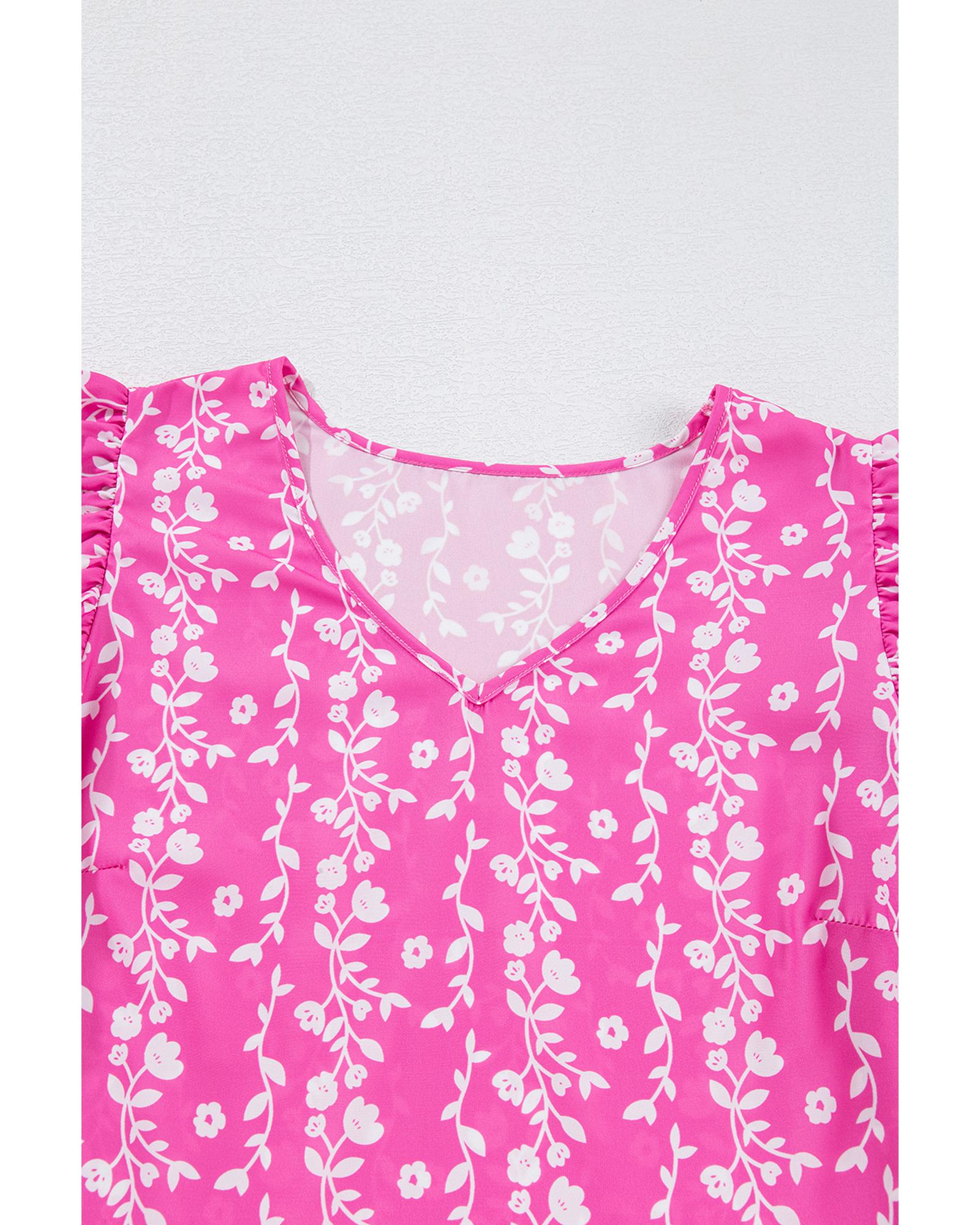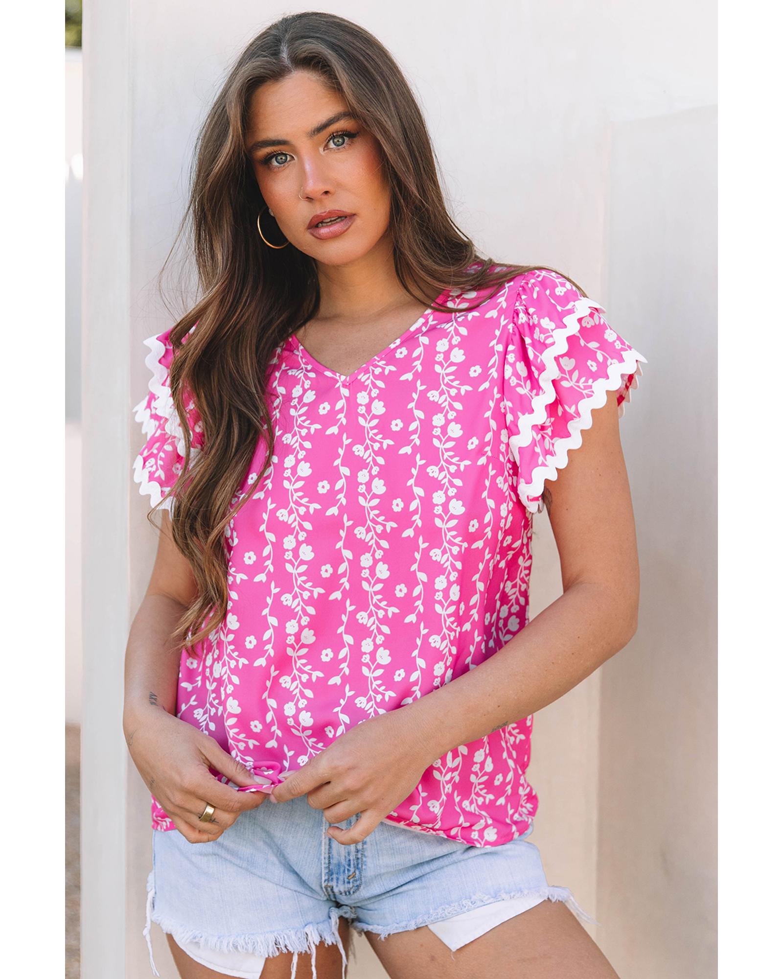 Pink Floral Print Ric-rac Tiered Ruffled V Neck Blouse – L