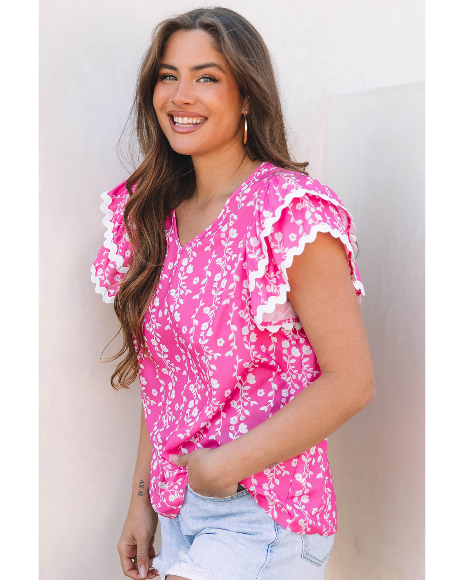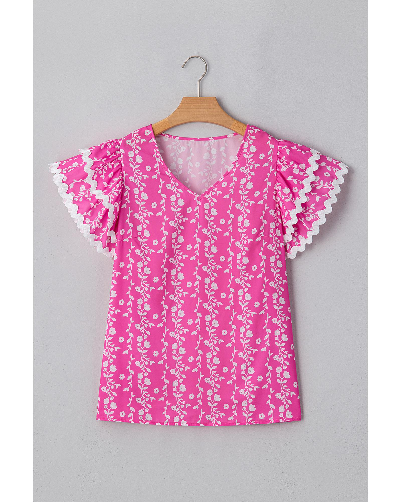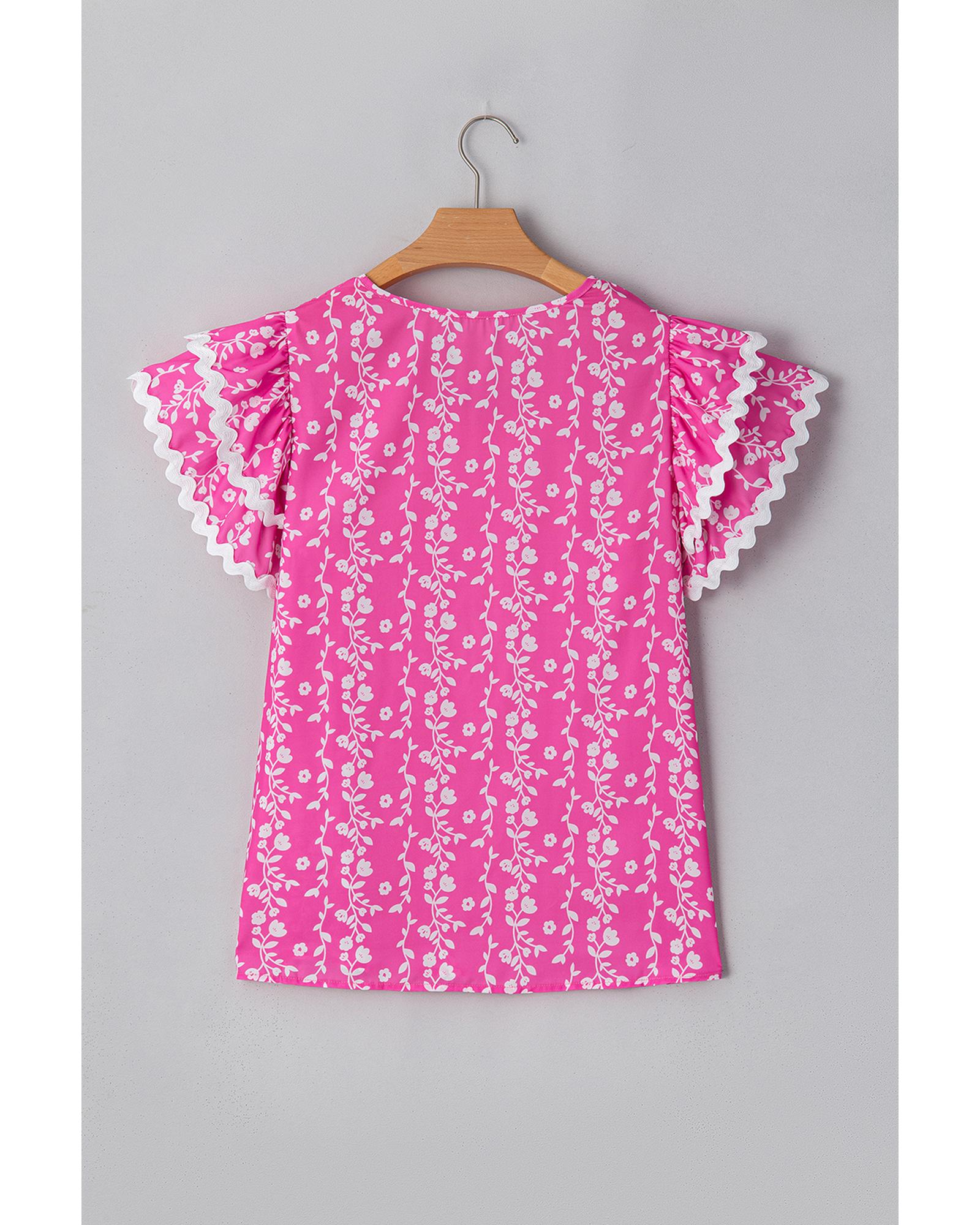 Pink Floral Print Ric-rac Tiered Ruffled V Neck Blouse – M