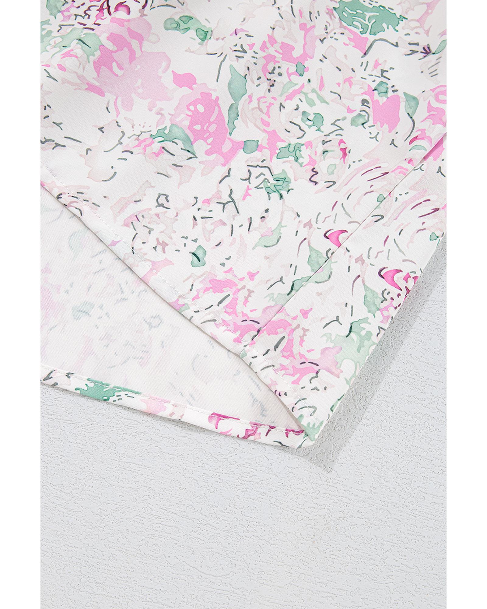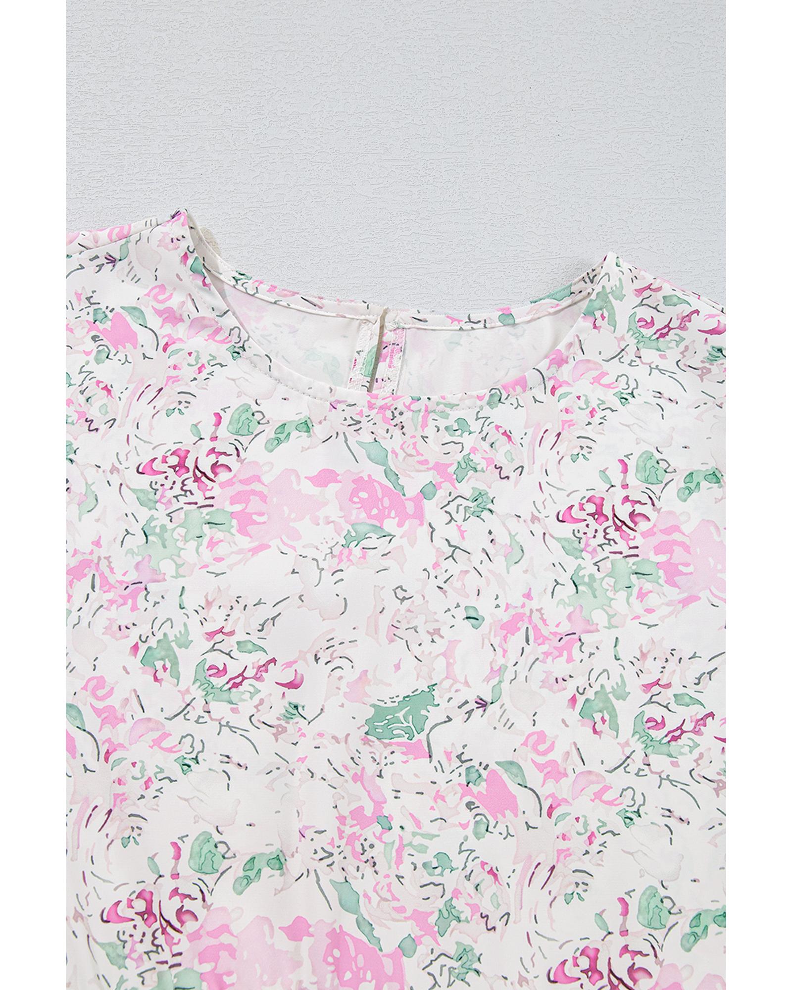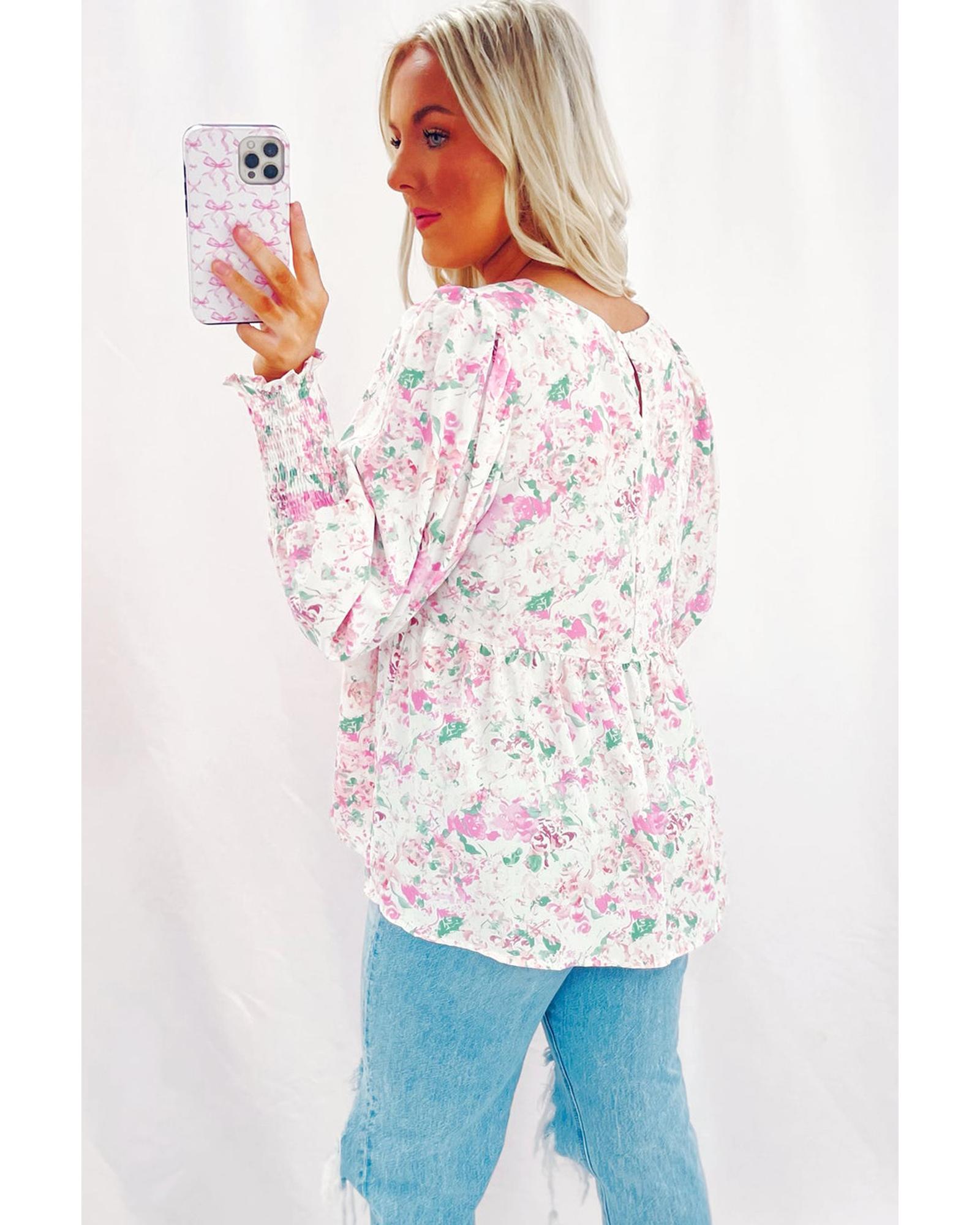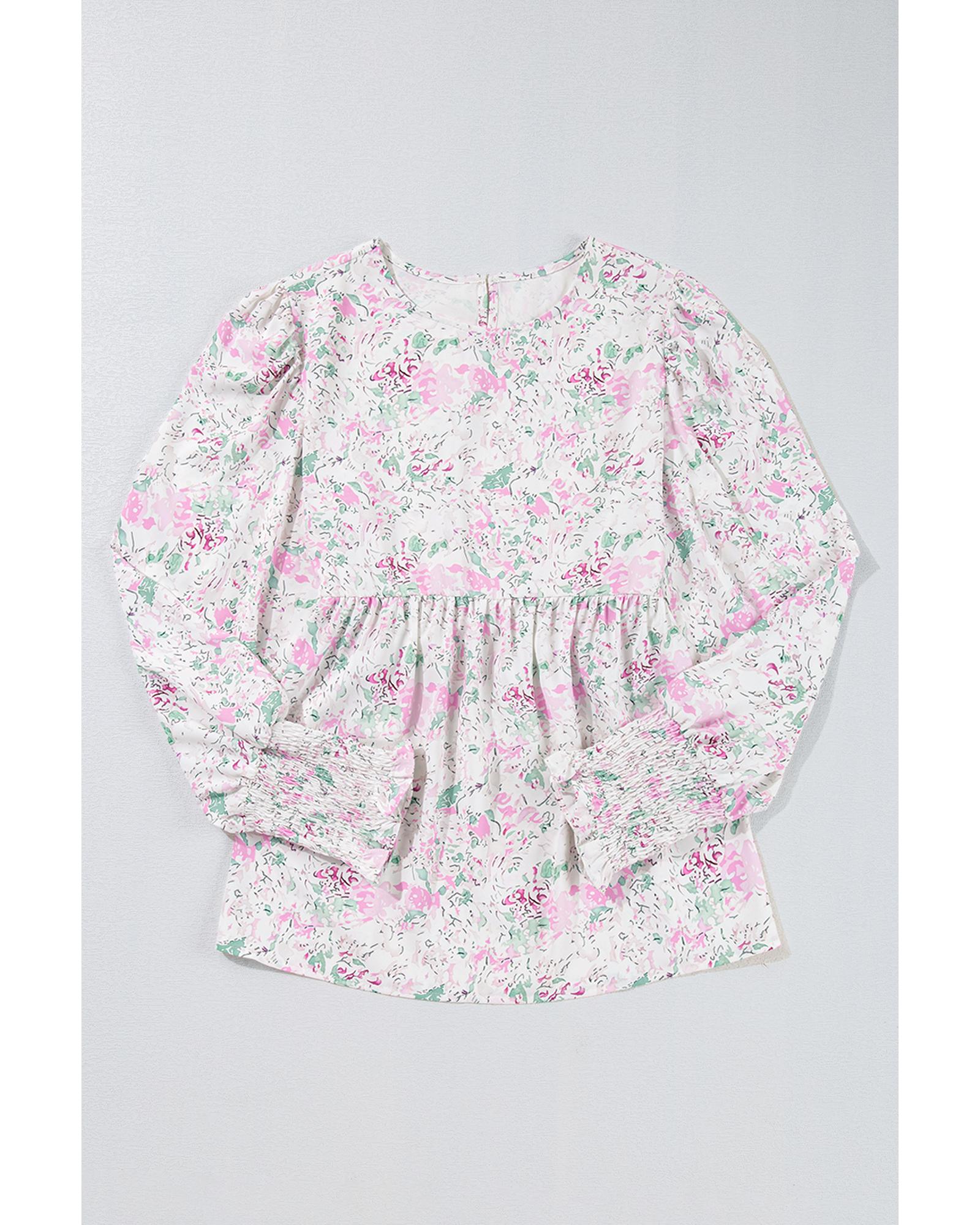 Pink Floral Print Shirred Balloon Sleeve Keyhole Back Babydoll Blouse – M