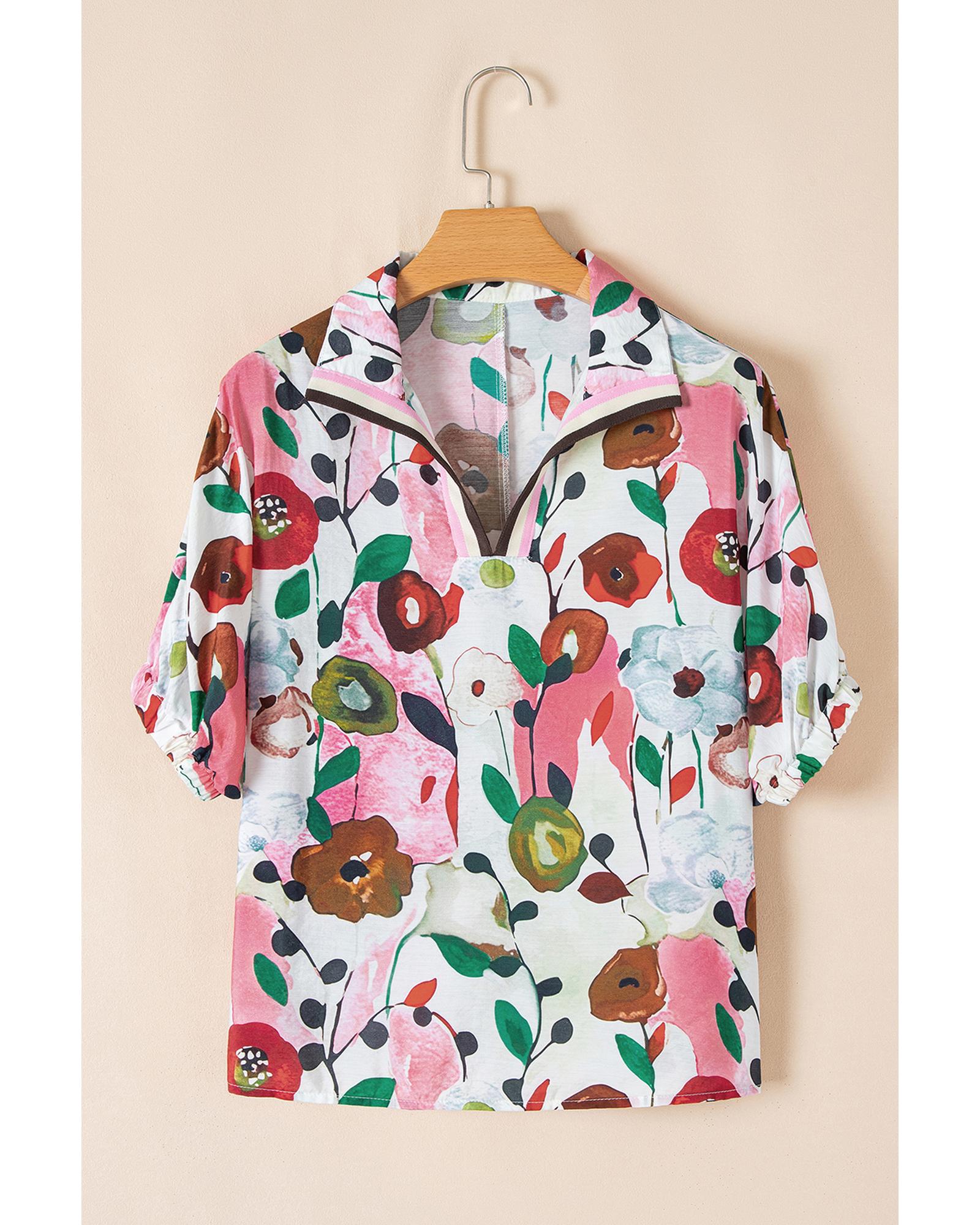 Pink Floral Print Slit V Neck Short Sleeve Blouse – M