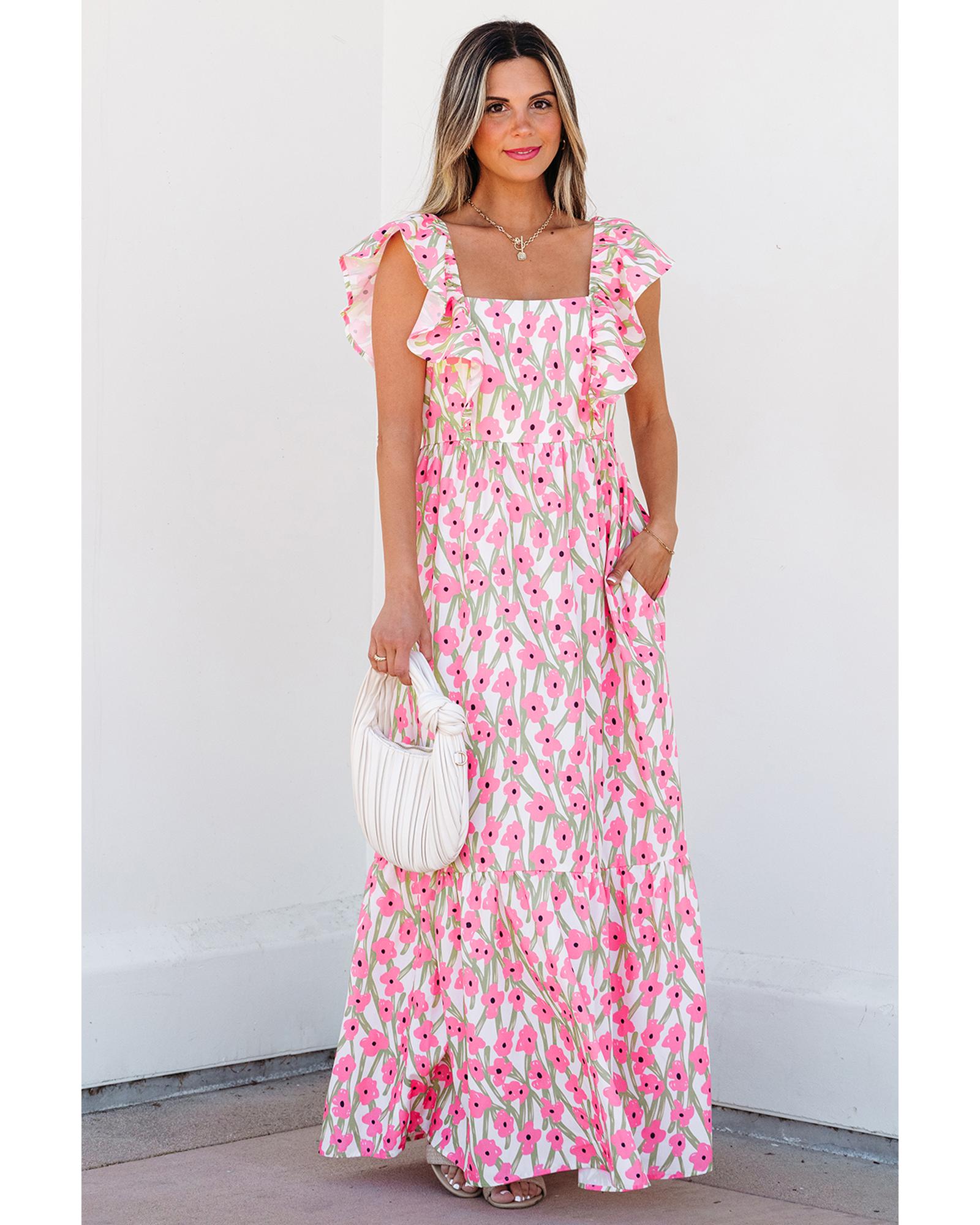 Pink Floral Print Square Neck Ruffled Strap Maxi Dress - 2XL