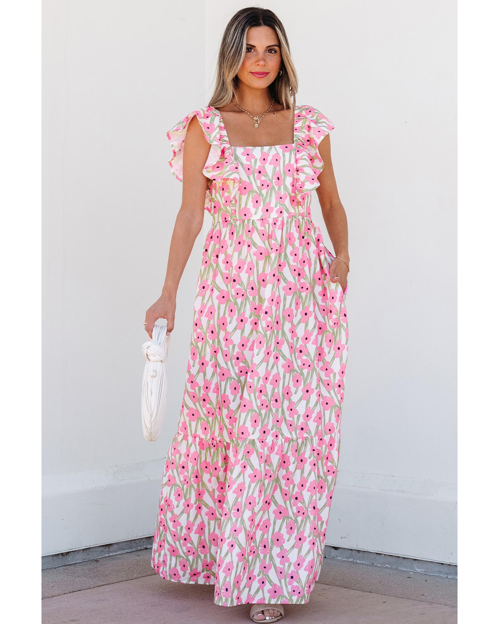 Pink Floral Print Square Neck Ruffled Strap Maxi Dress – XL
