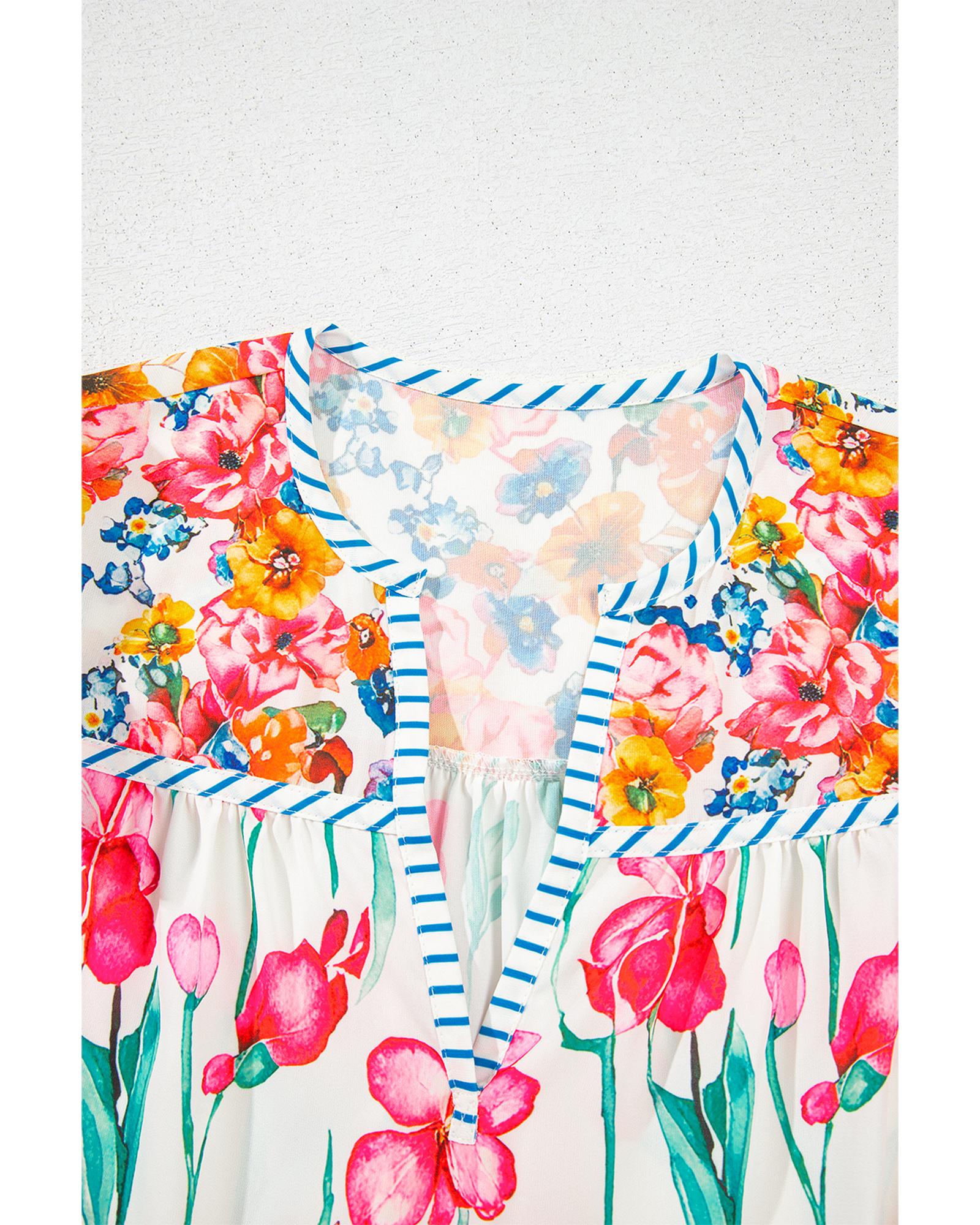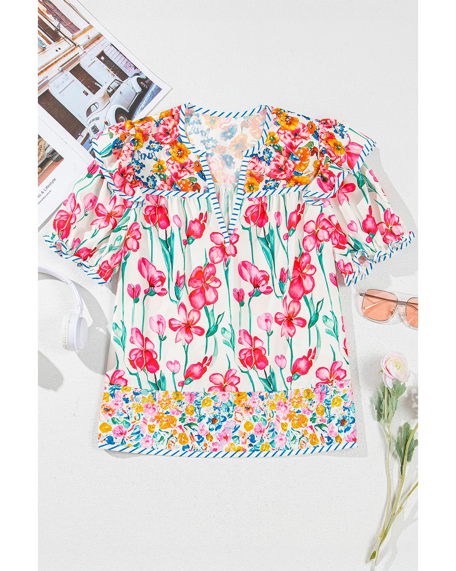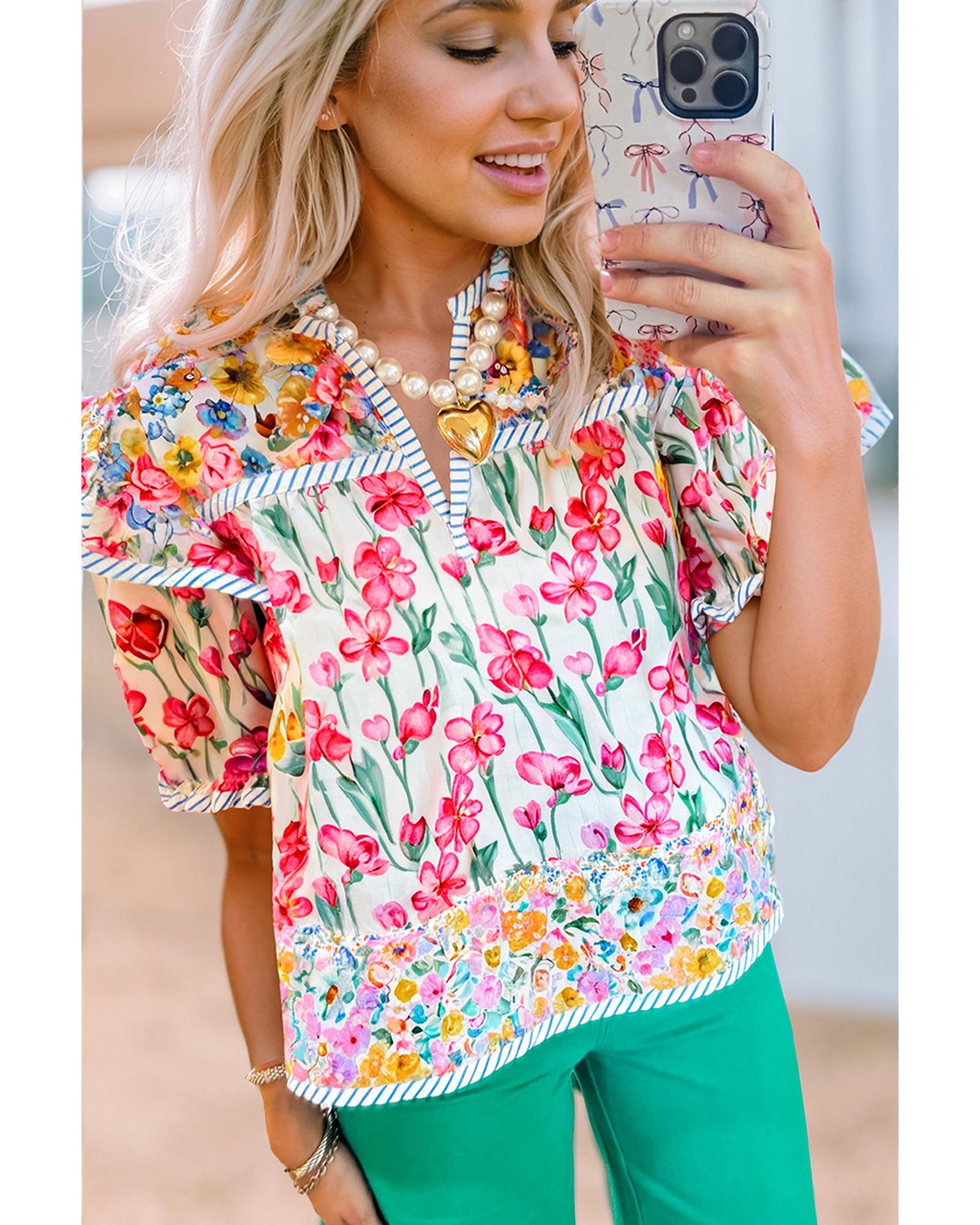Pink Floral Print Striped Detail Split Neck Short Sleeve Blouse – L