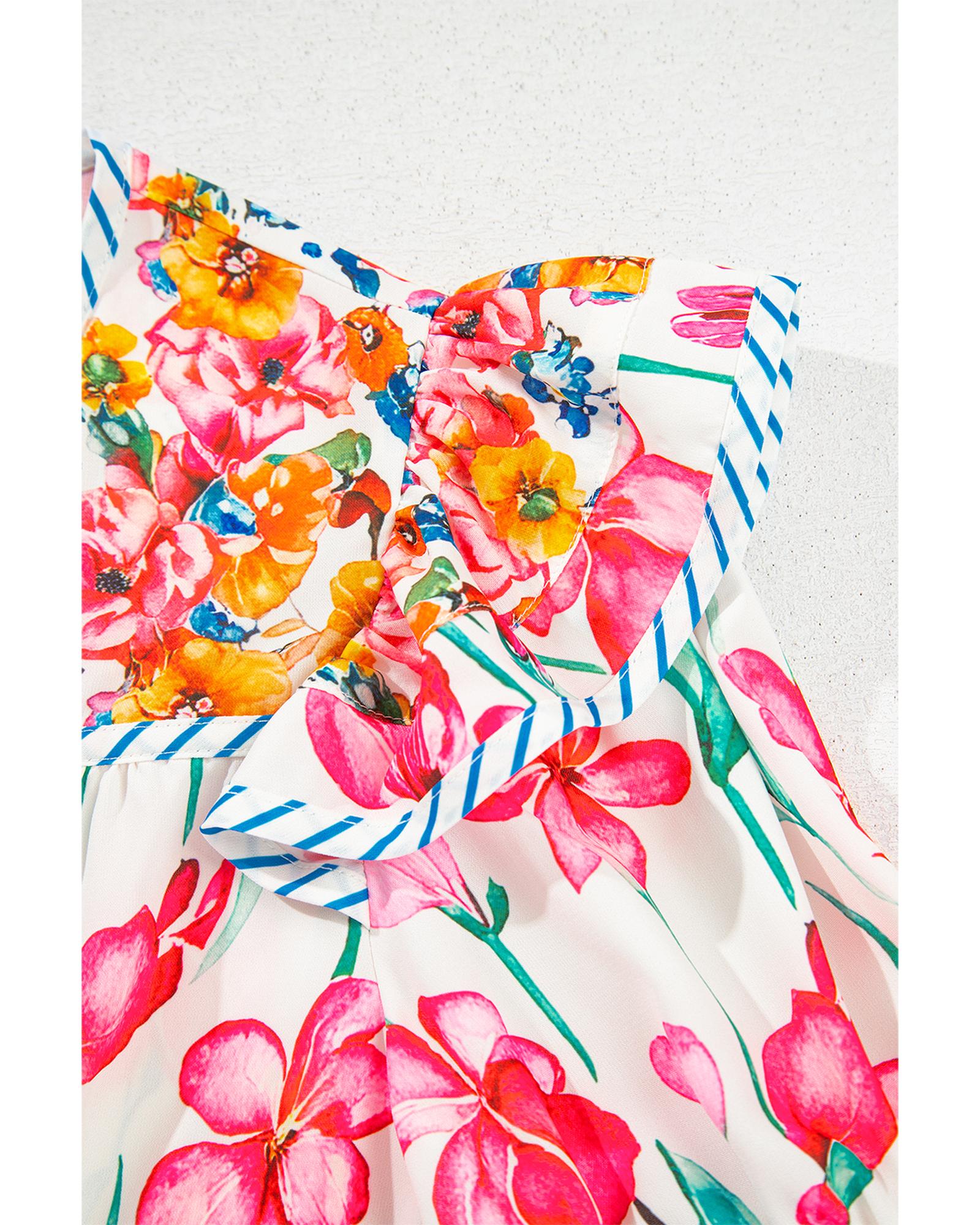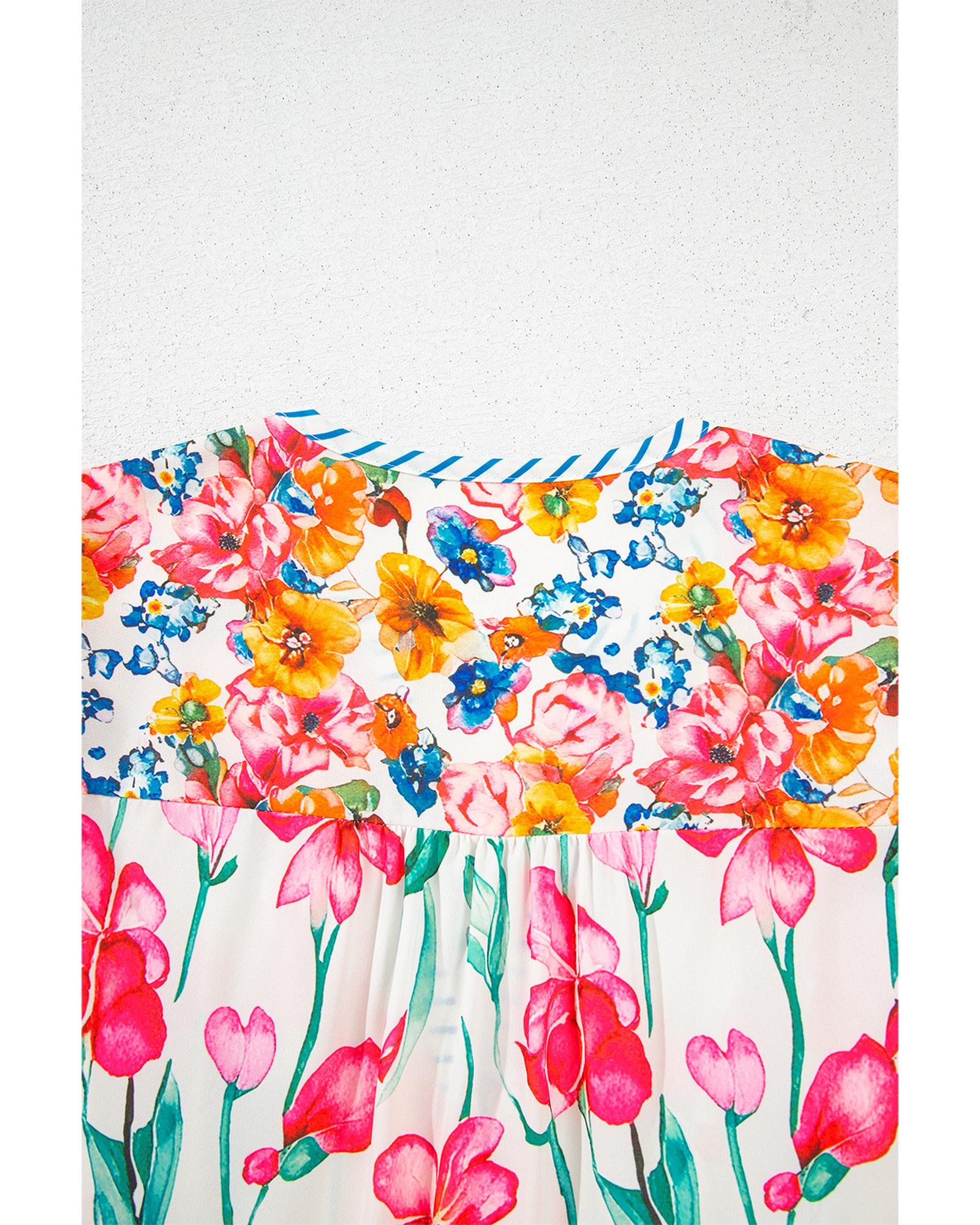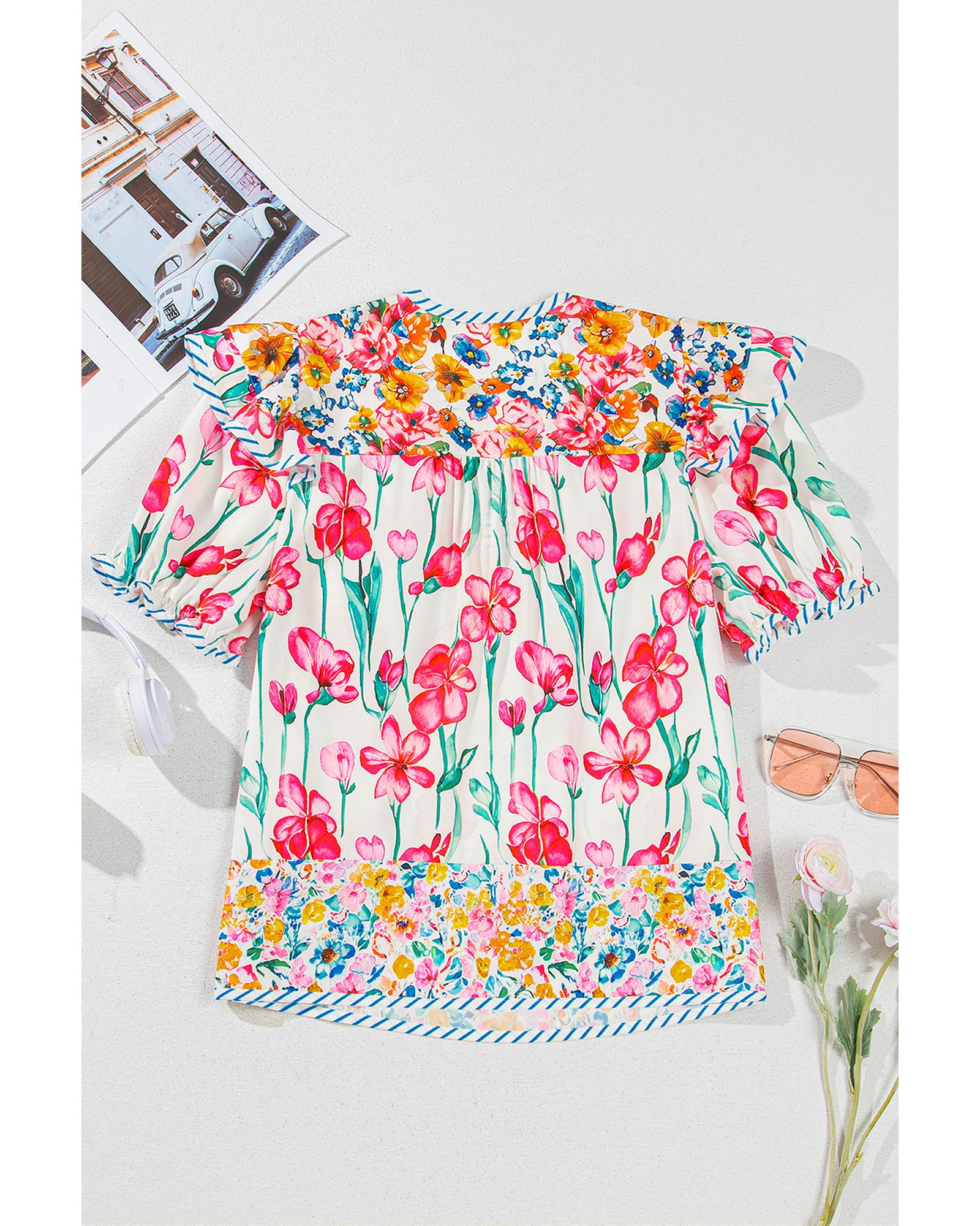 Pink Floral Print Striped Detail Split Neck Short Sleeve Blouse – L