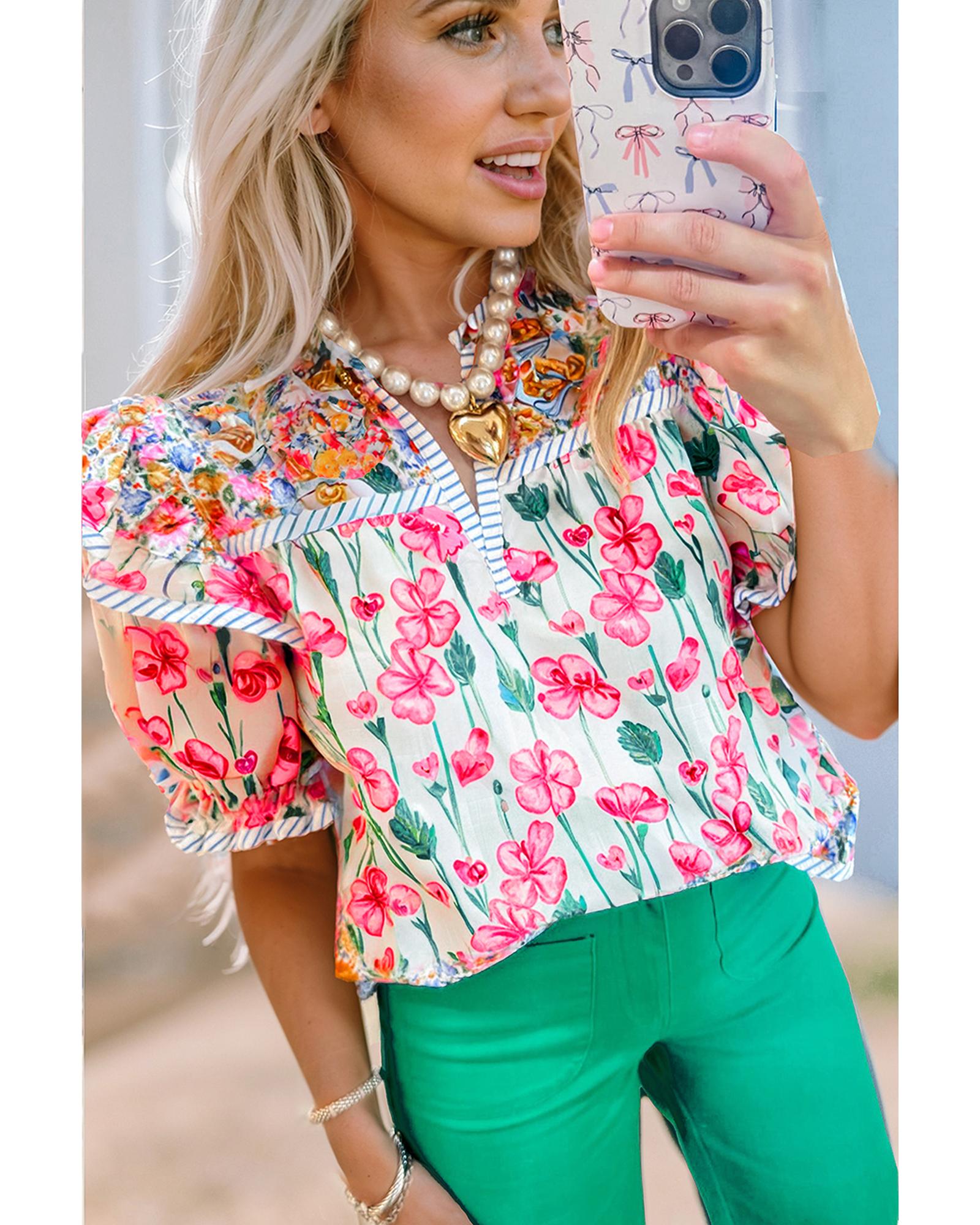Pink Floral Print Striped Detail Split Neck Short Sleeve Blouse – XL