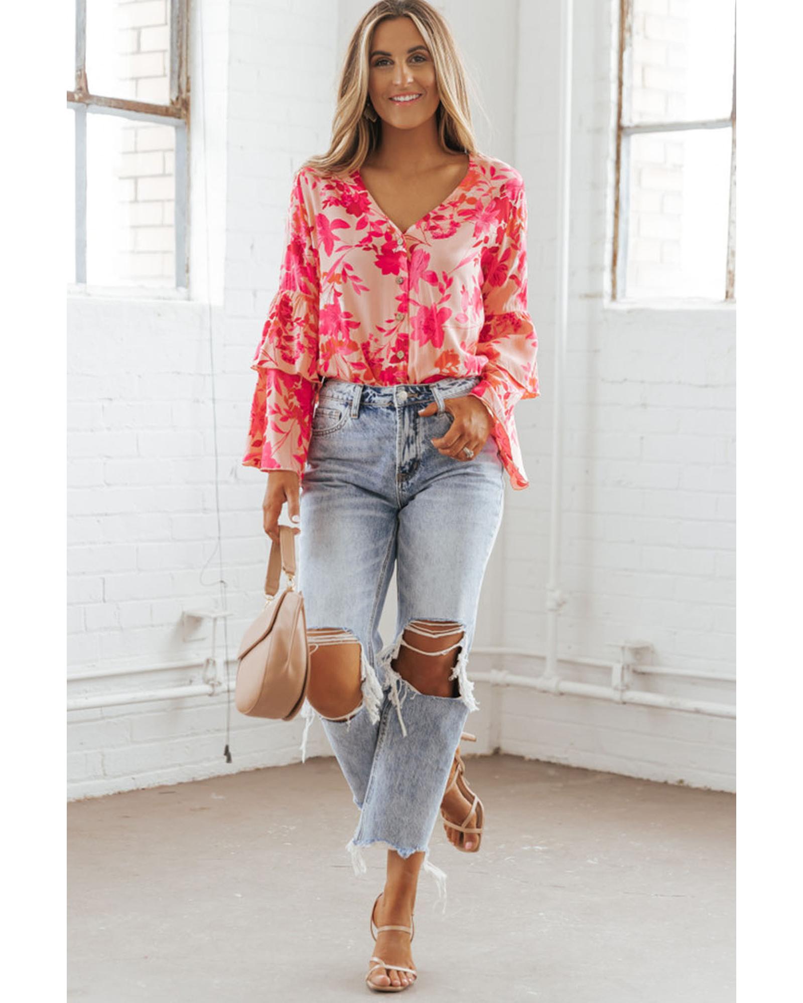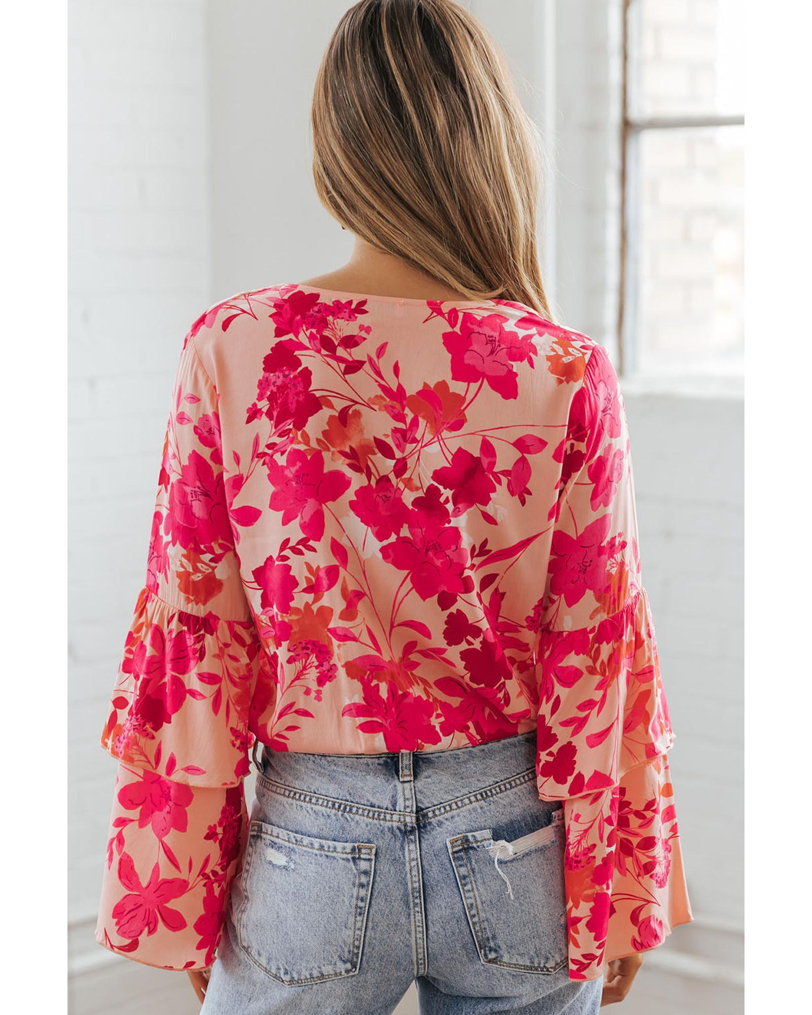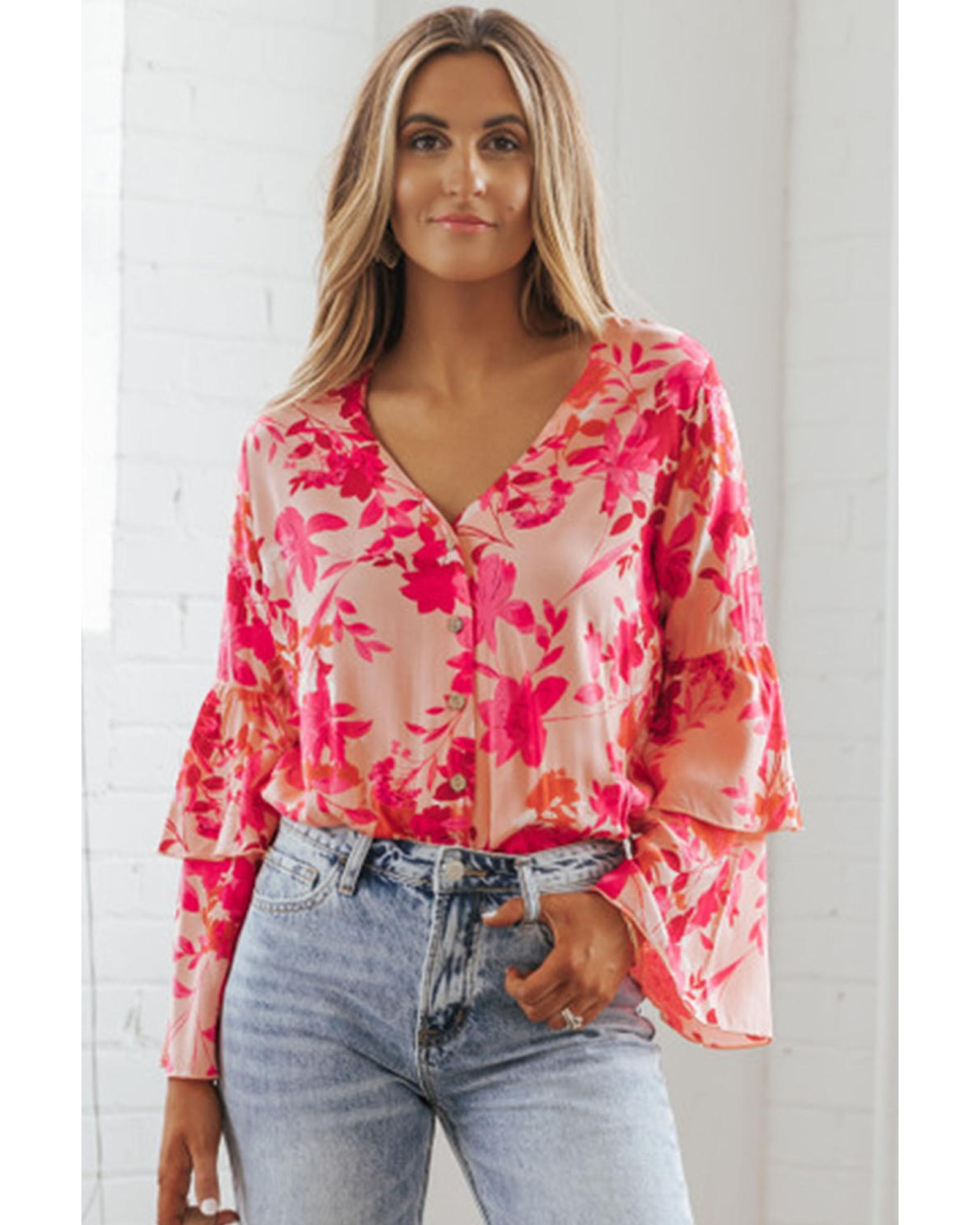 Pink Floral Print Tiered Bell Long Sleeve Buttoned Bodysuit – L