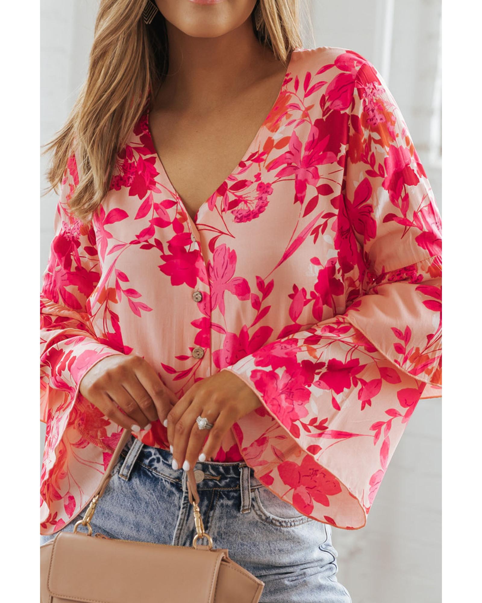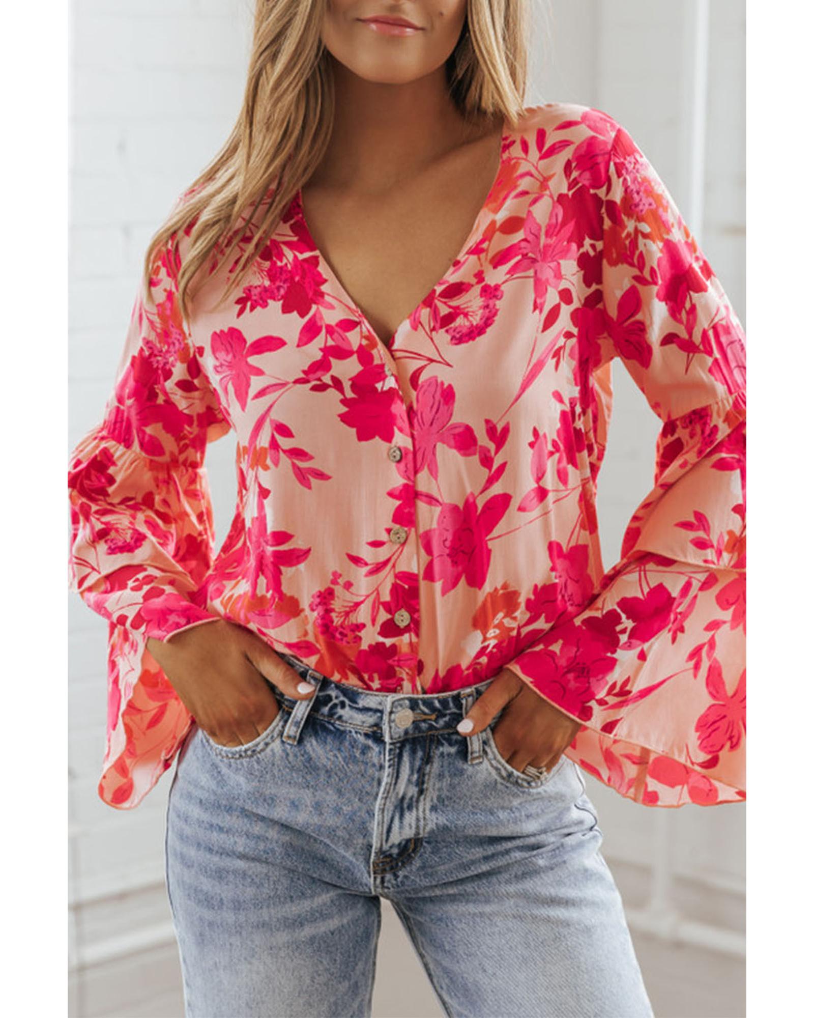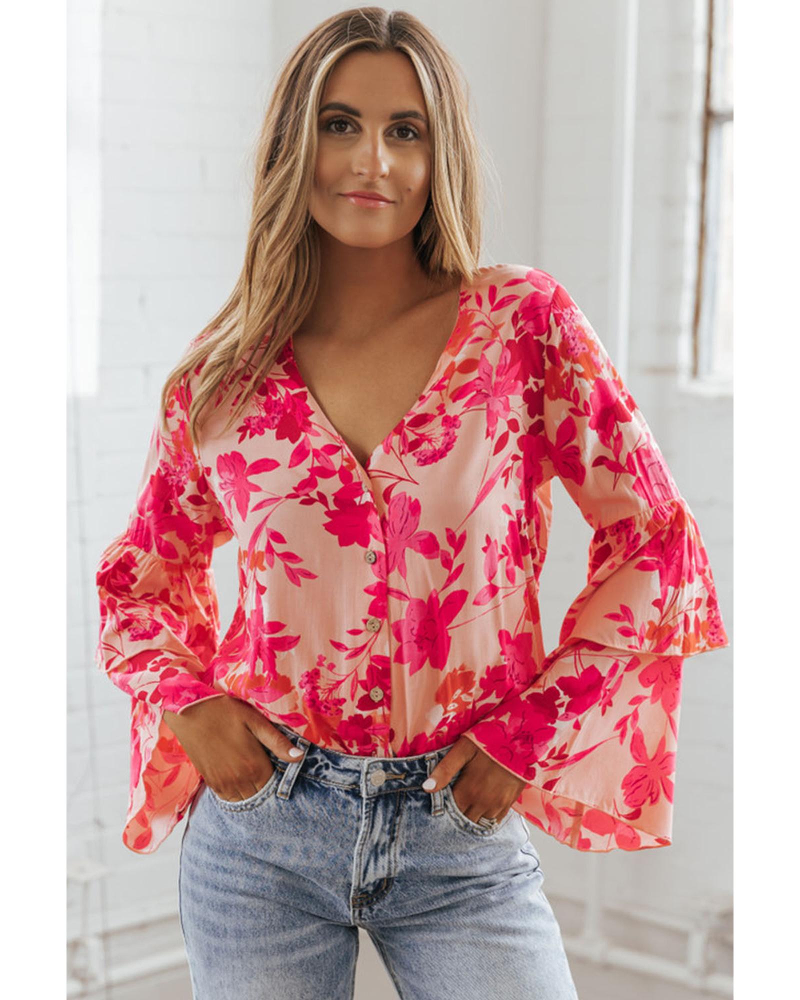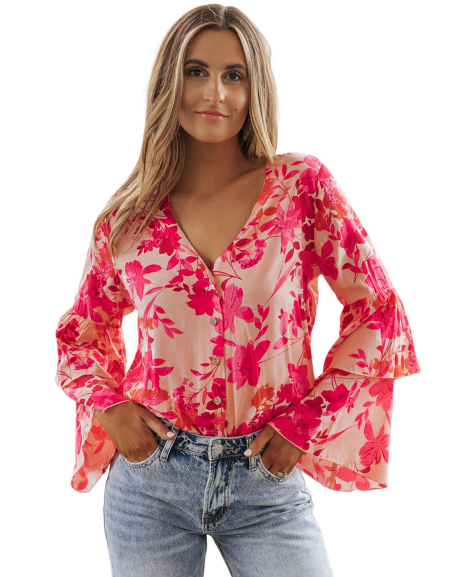 Pink Floral Print Tiered Bell Long Sleeve Buttoned Bodysuit – L