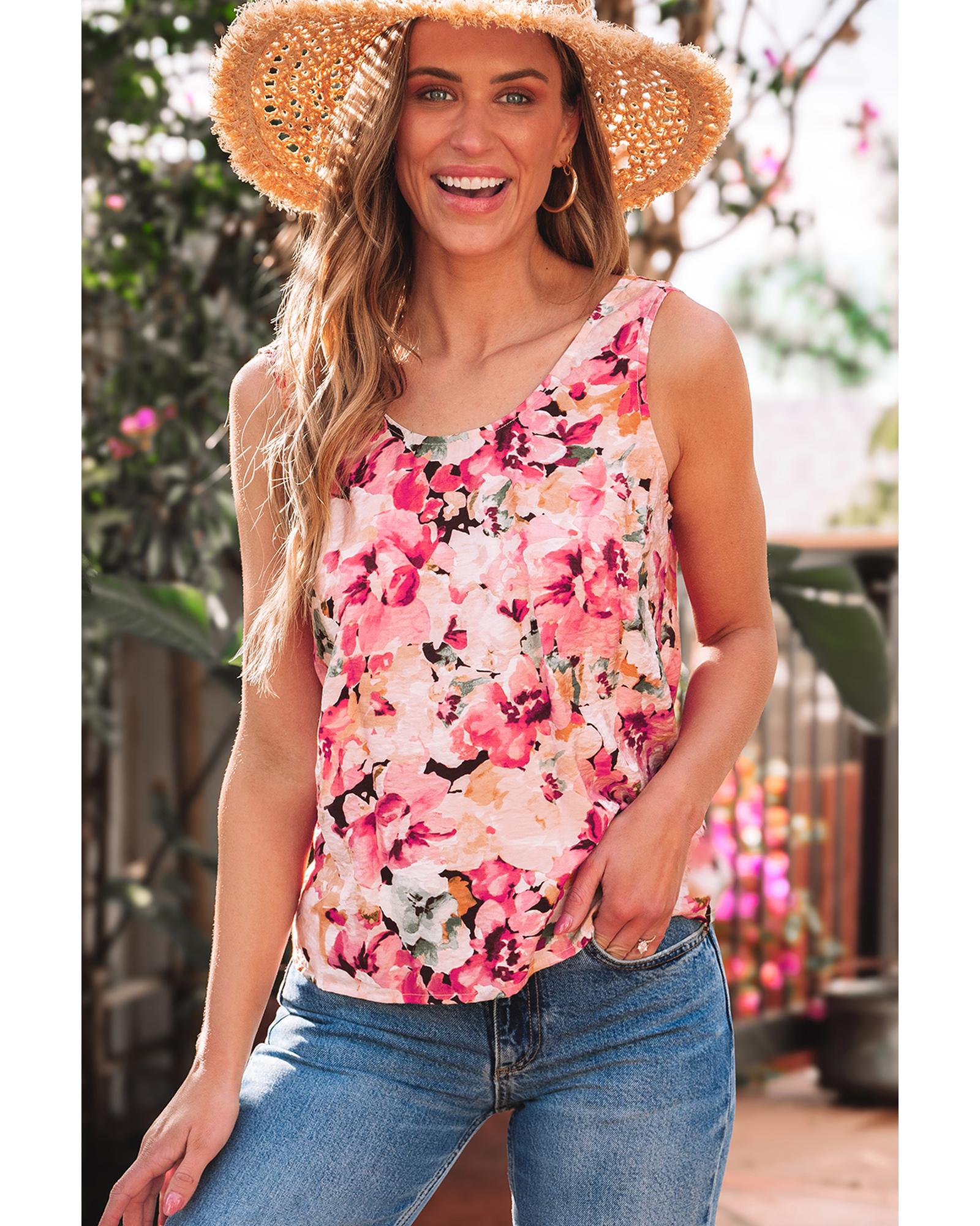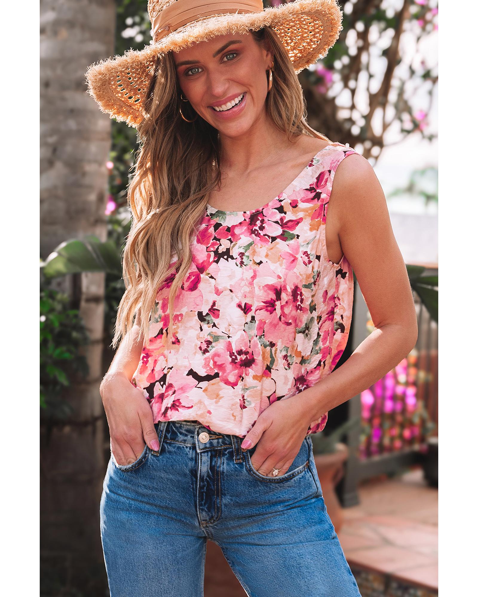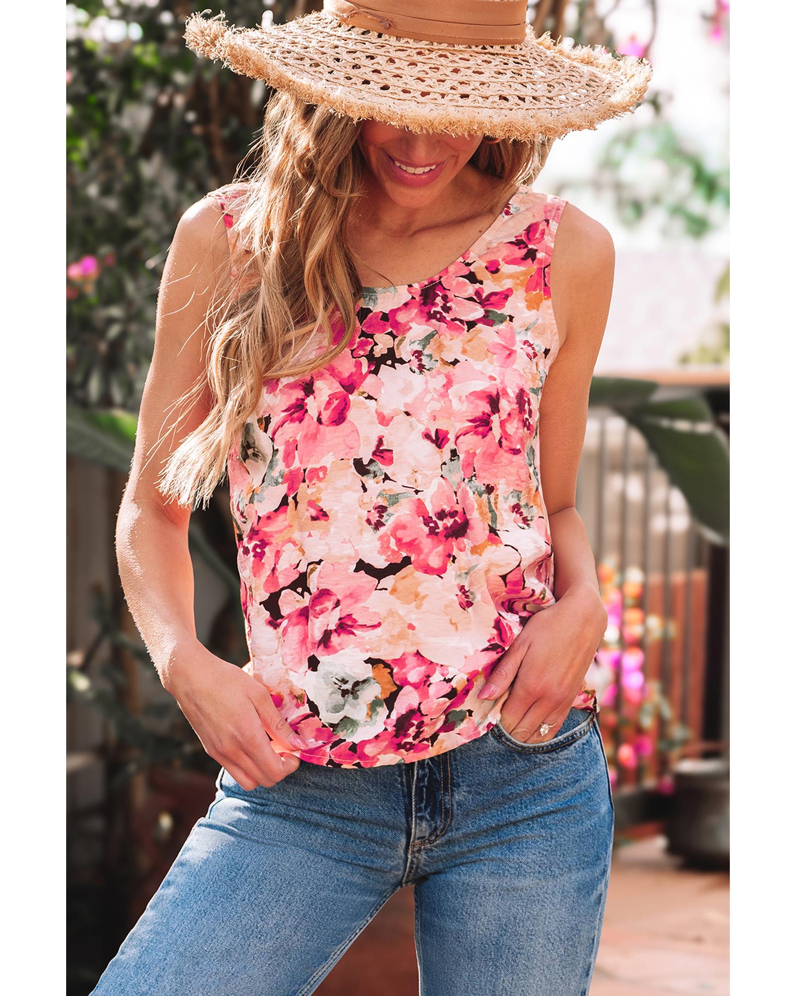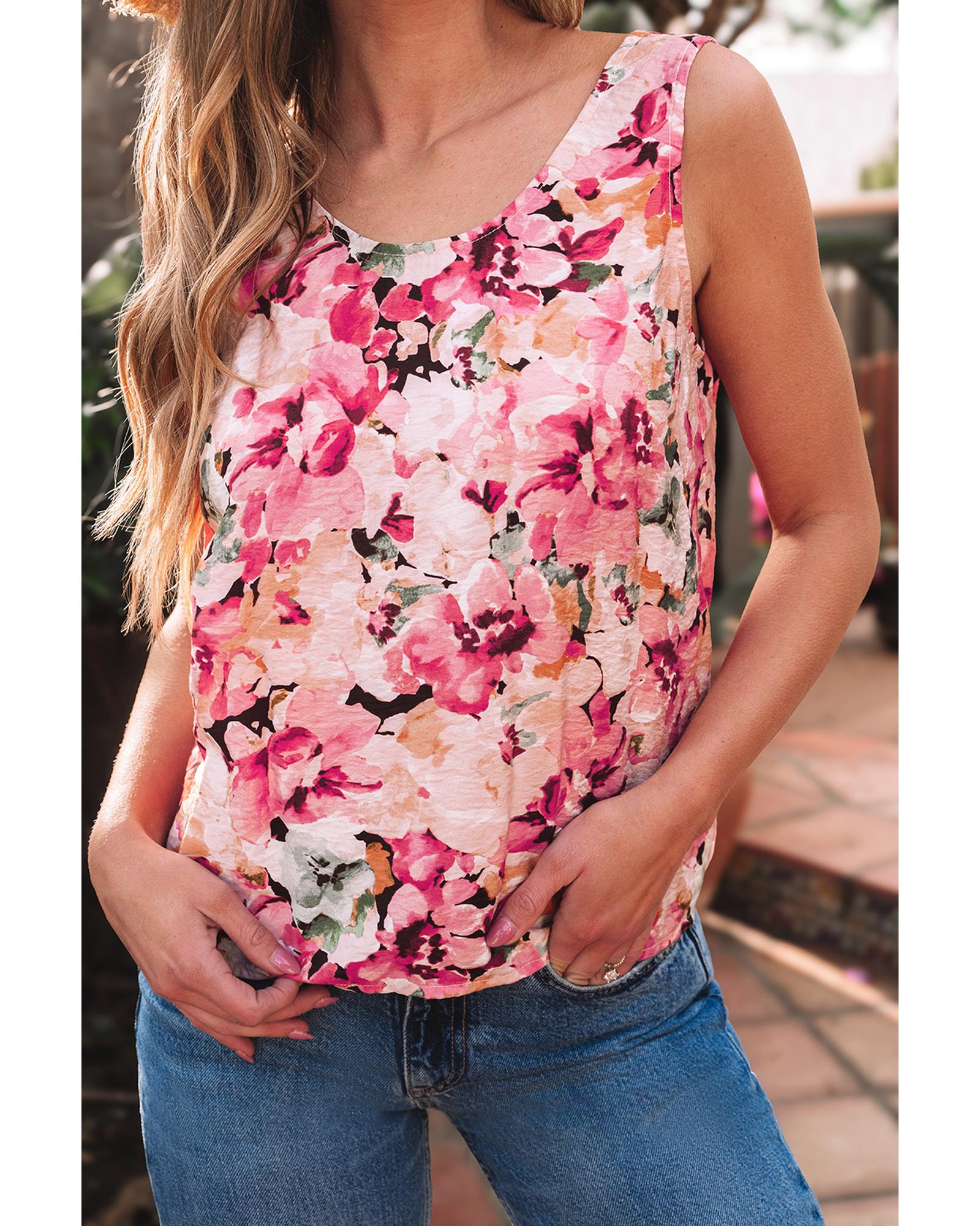 Pink Floral Round Neck Twisted Cut Out Back Tank Top – L