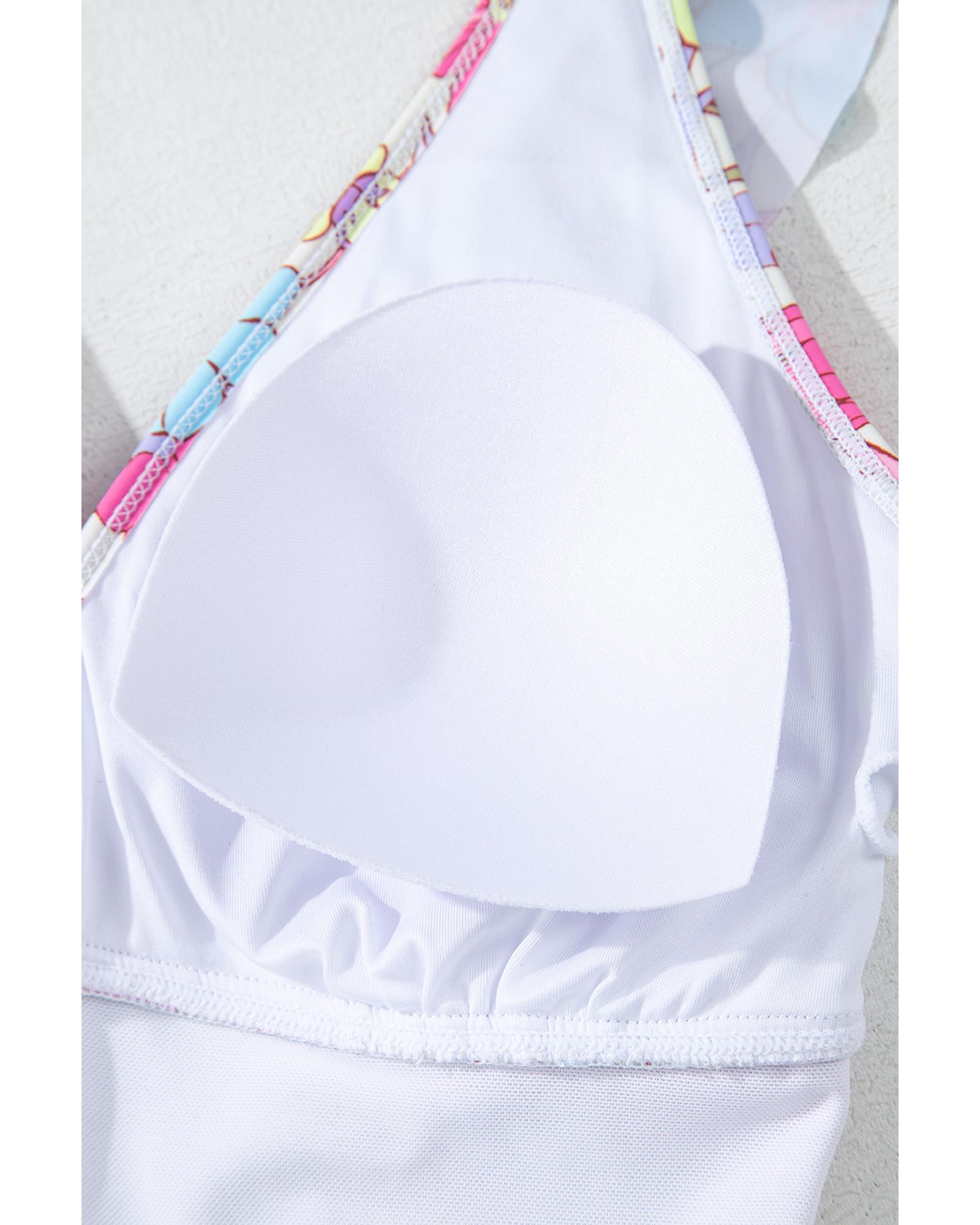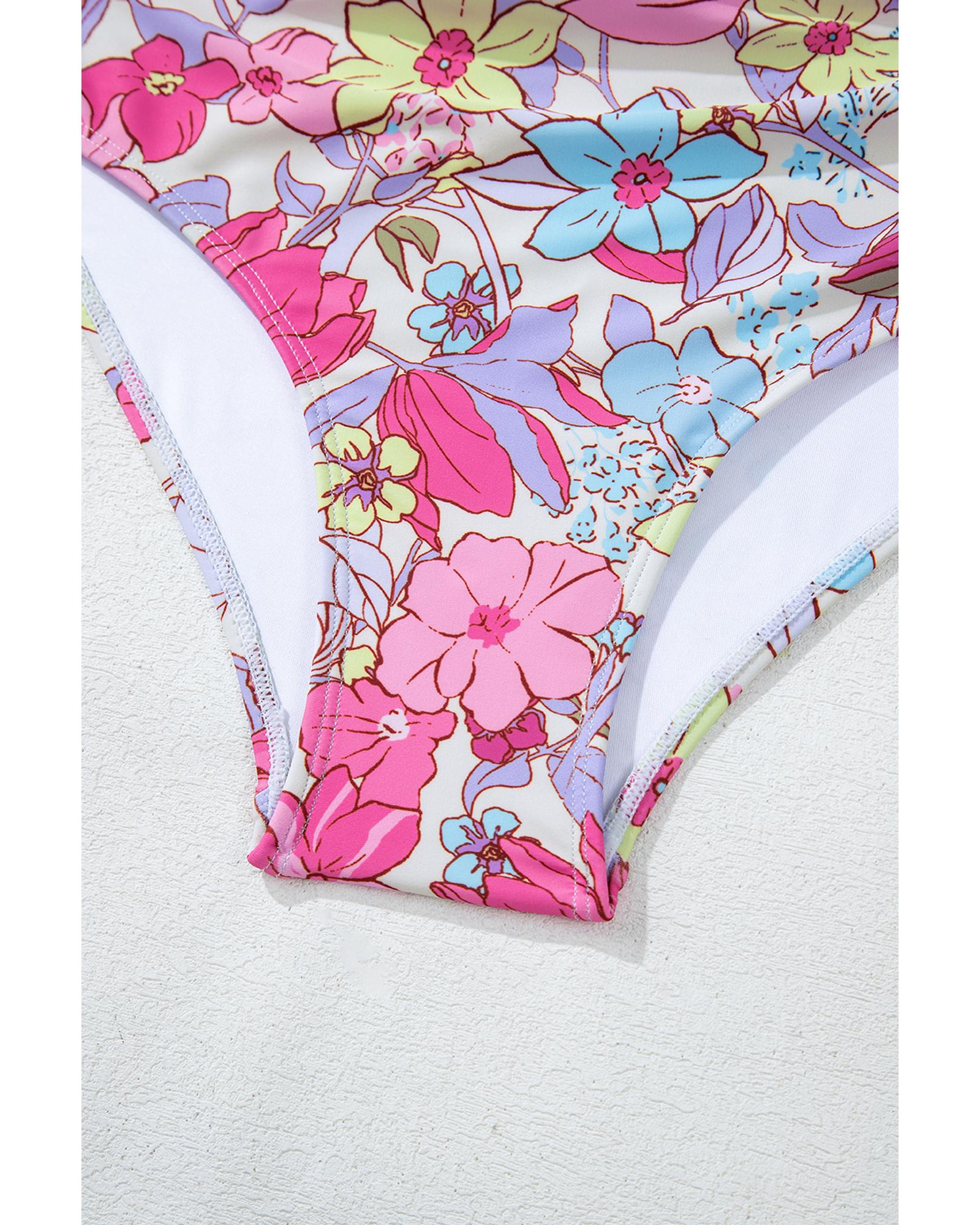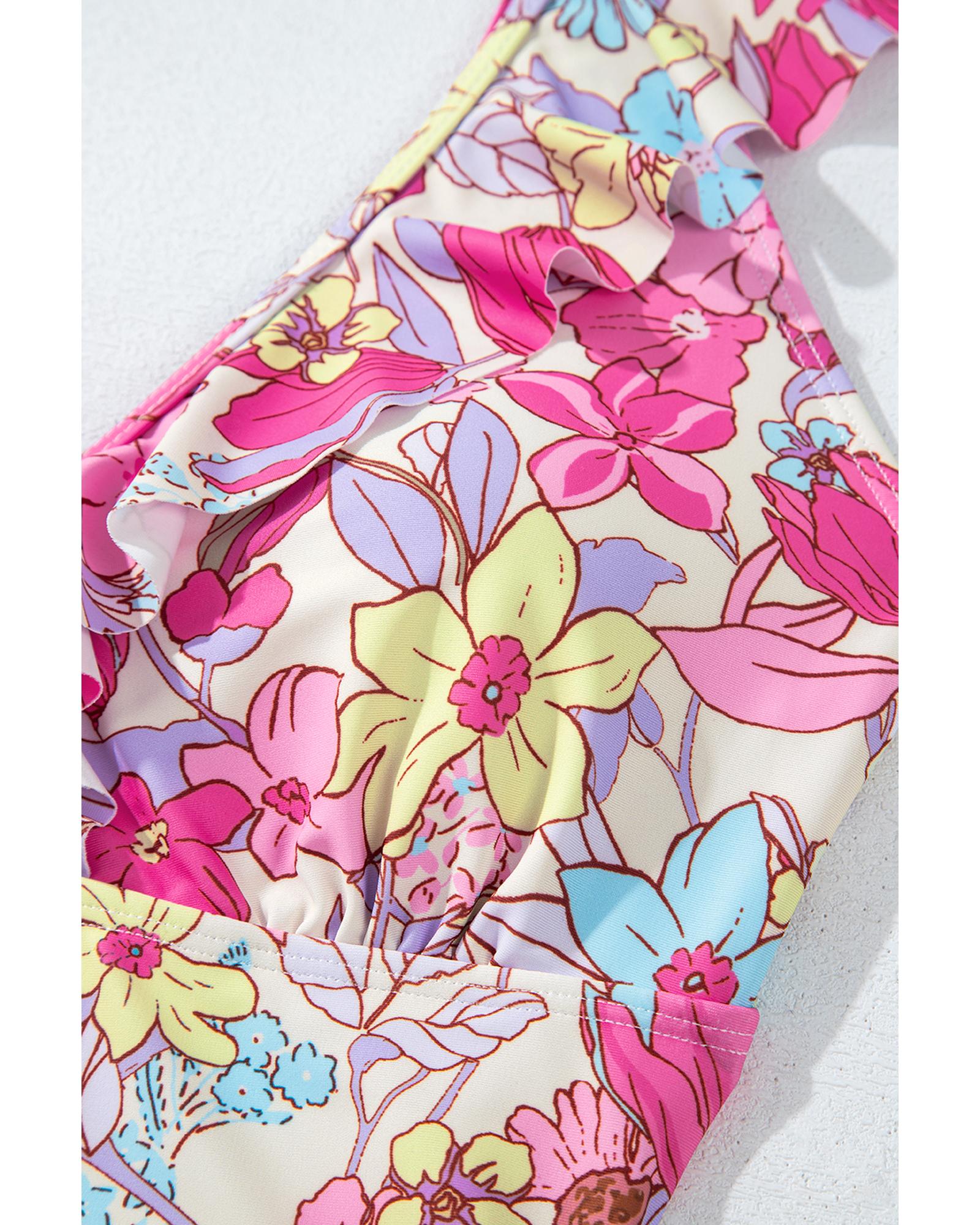 Pink Floral Ruffle Trim V Neck Lace-up Back Tummy Control One Piece Swimsuit – L