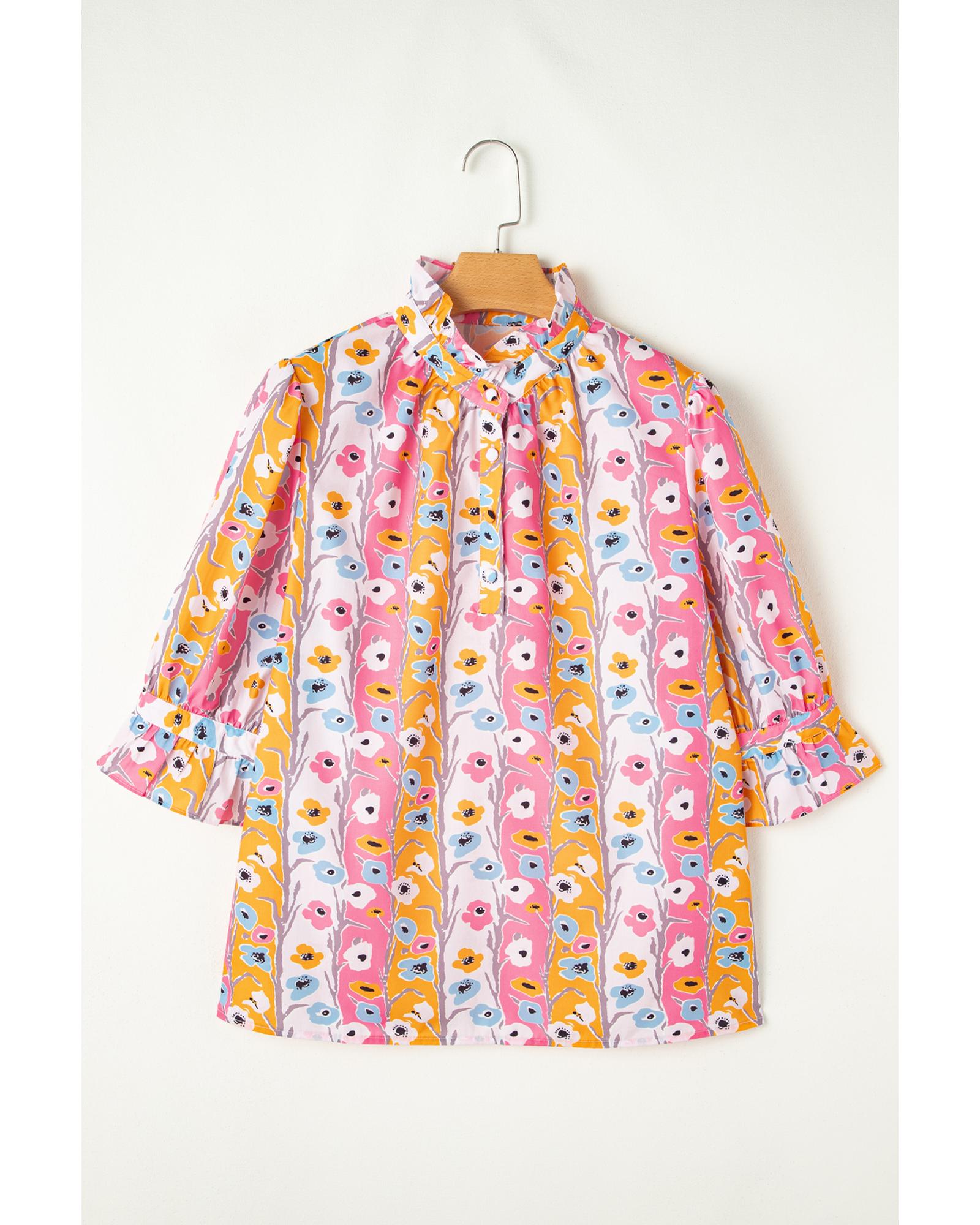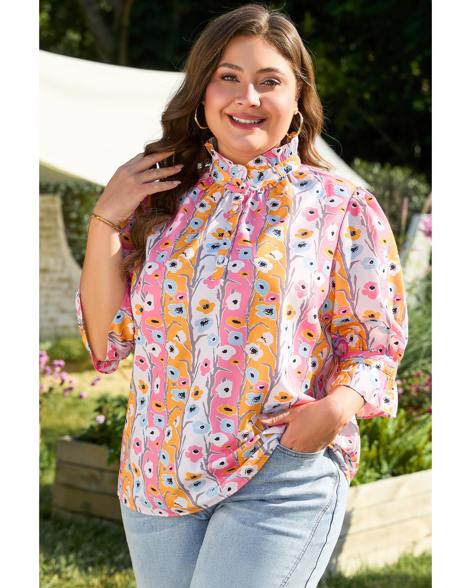 Pink Floral Ruffled Collar Bracelet Sleeve Plus Size Blouse Top – 2X