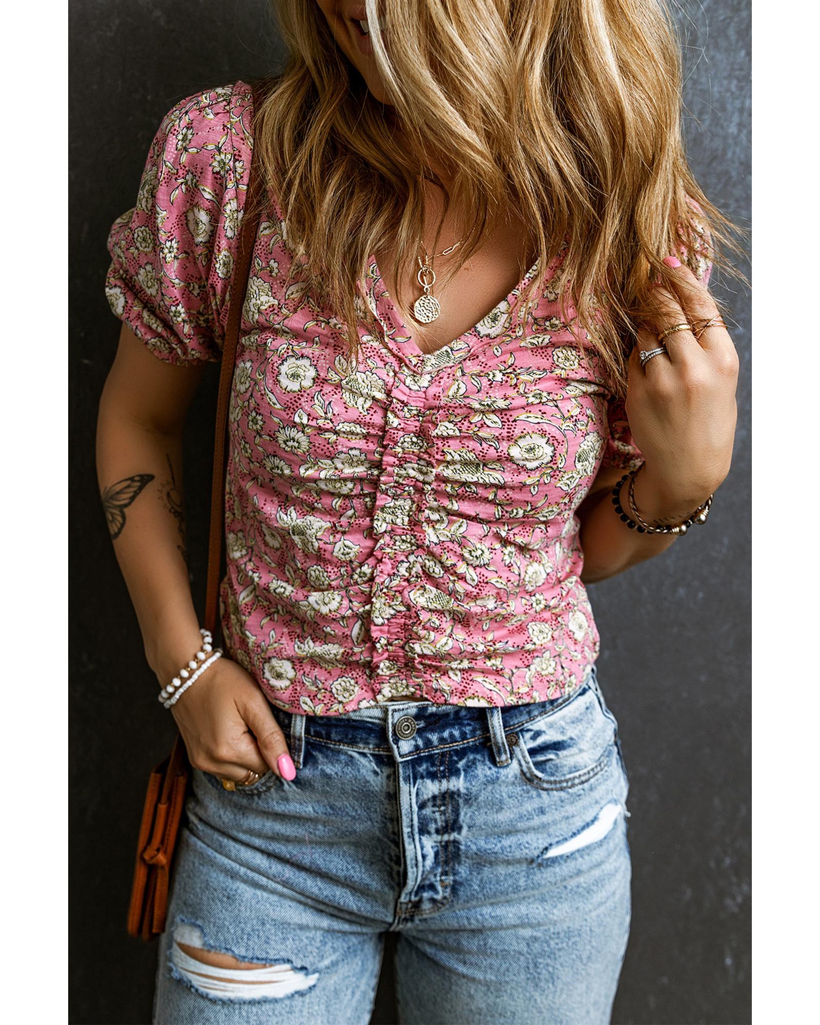 • Pink Floral Short Puff Sleeve V Neck Ruched Blouse