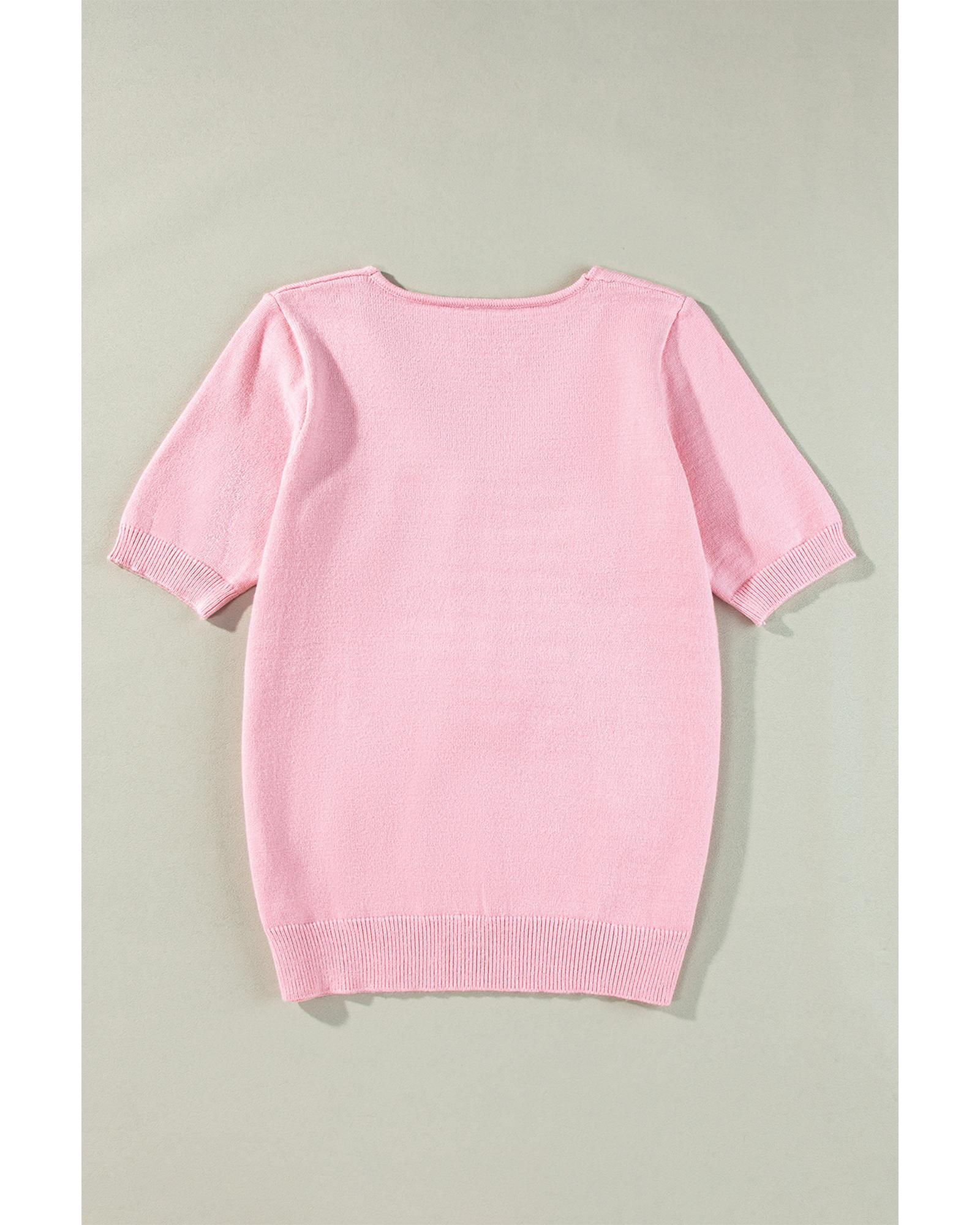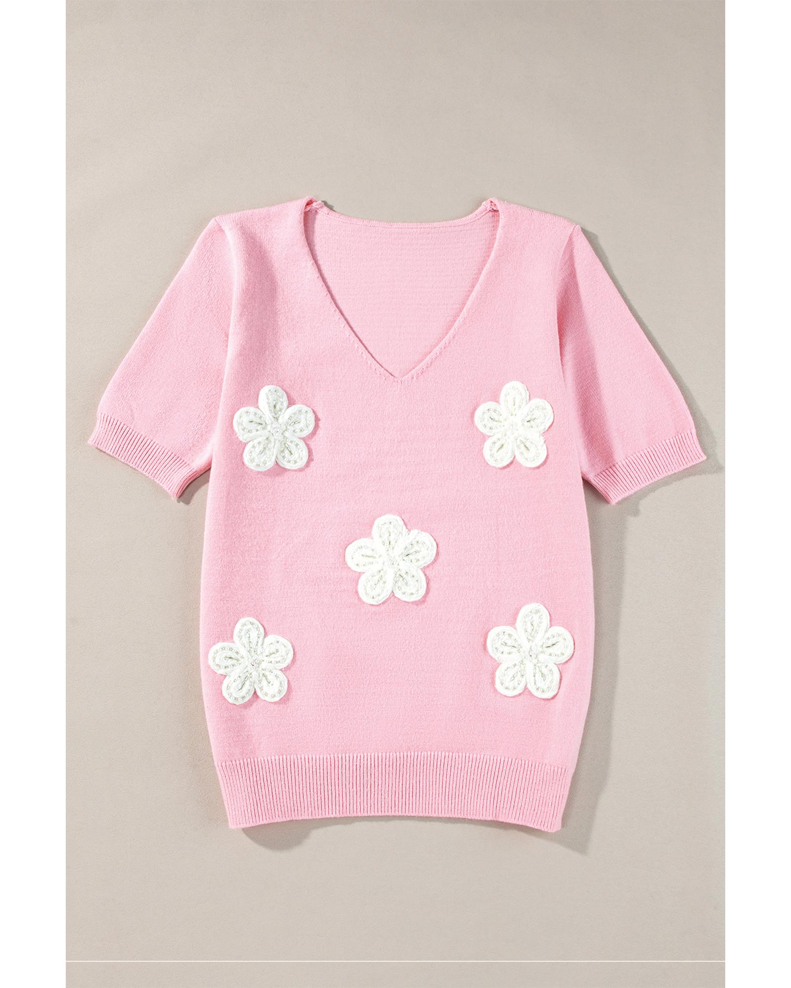 • Pink Flower Crochet V Neck Short Sleeve Sweater