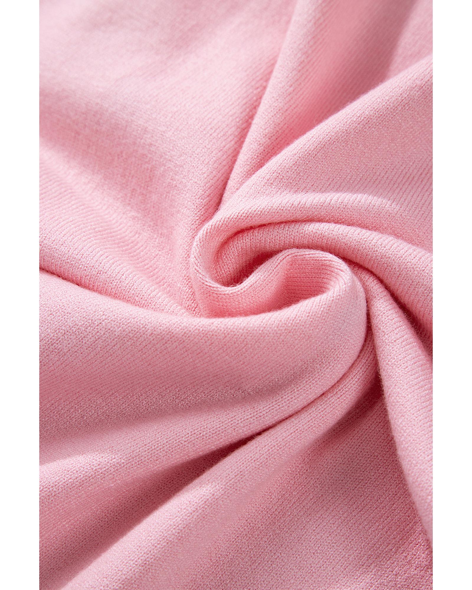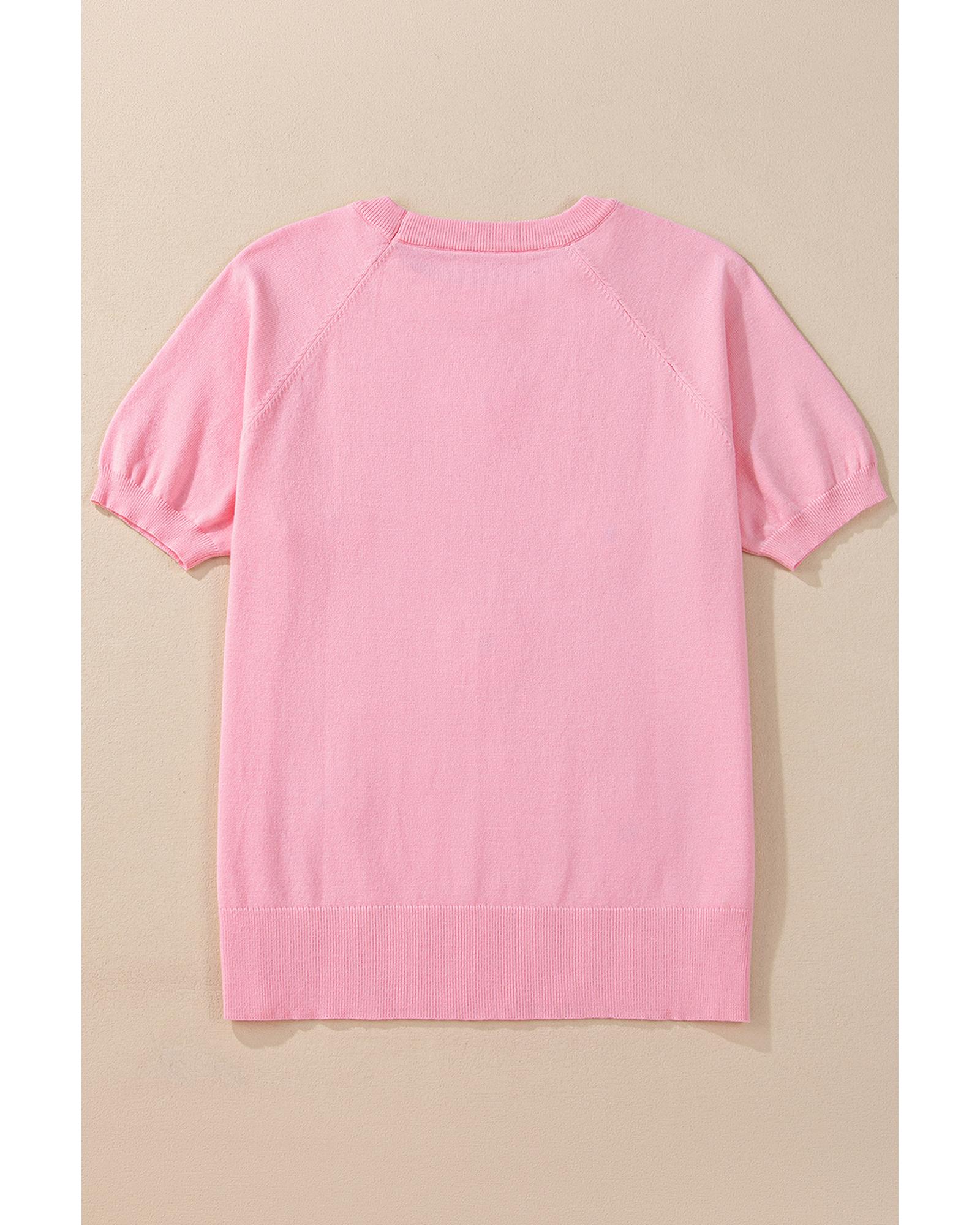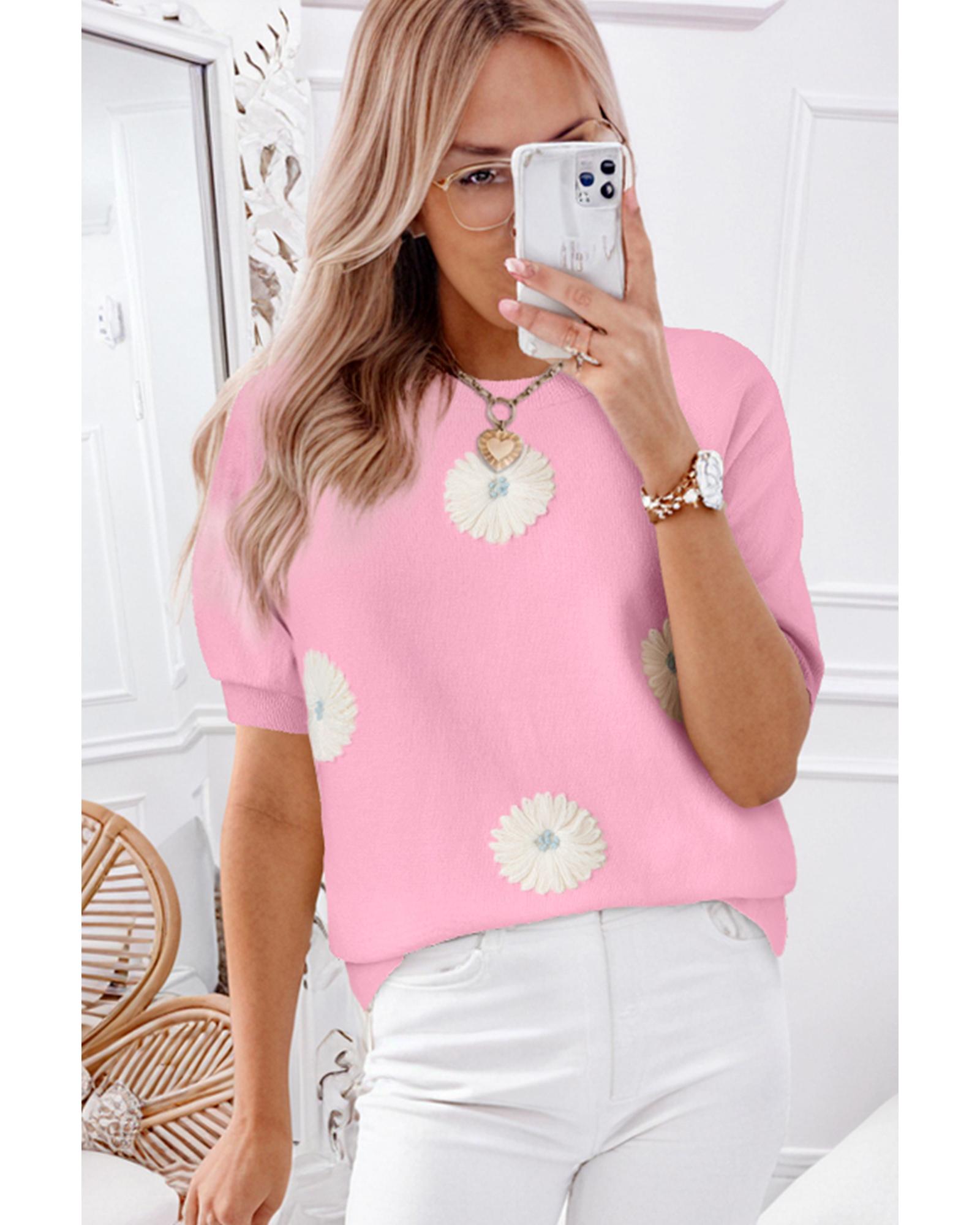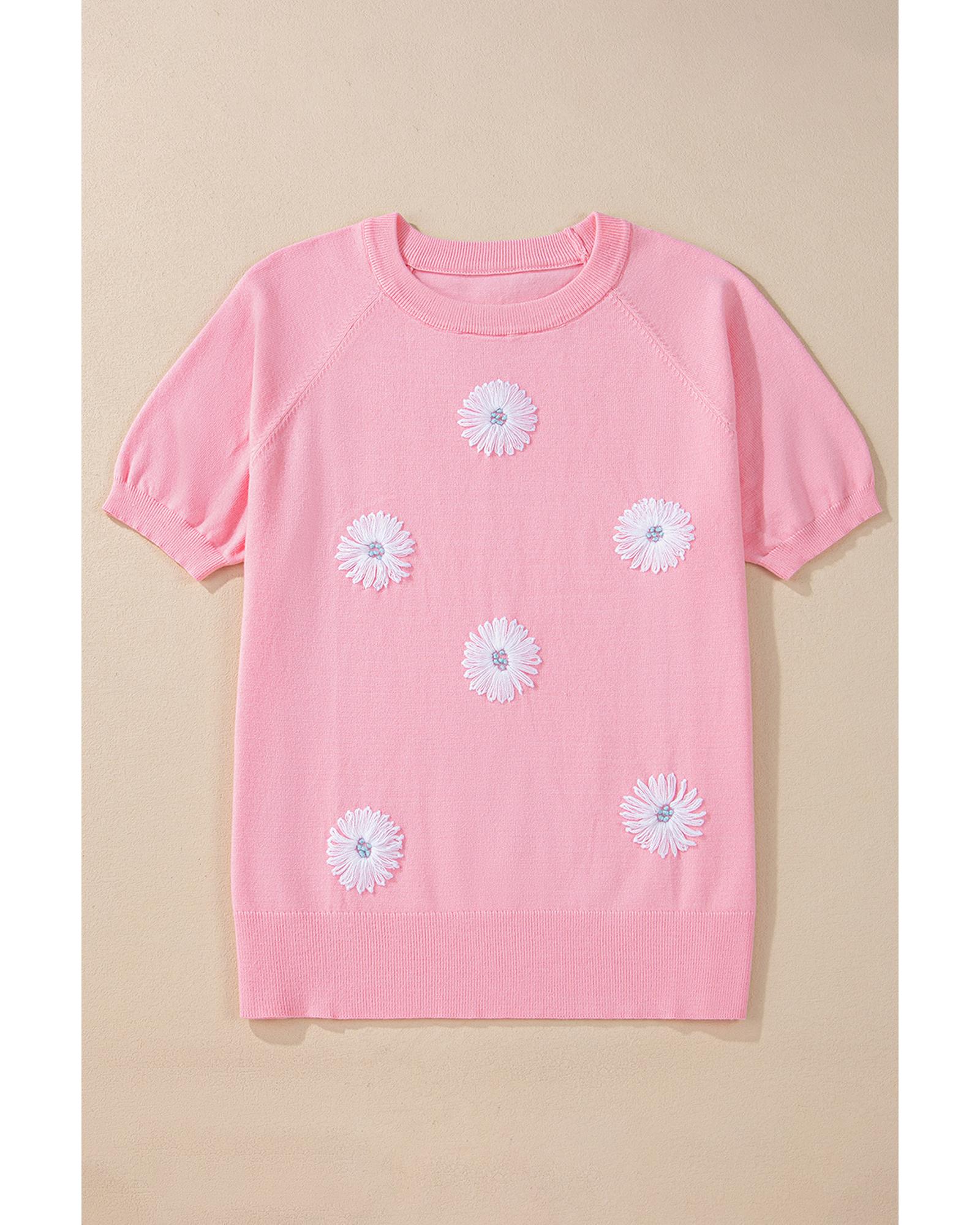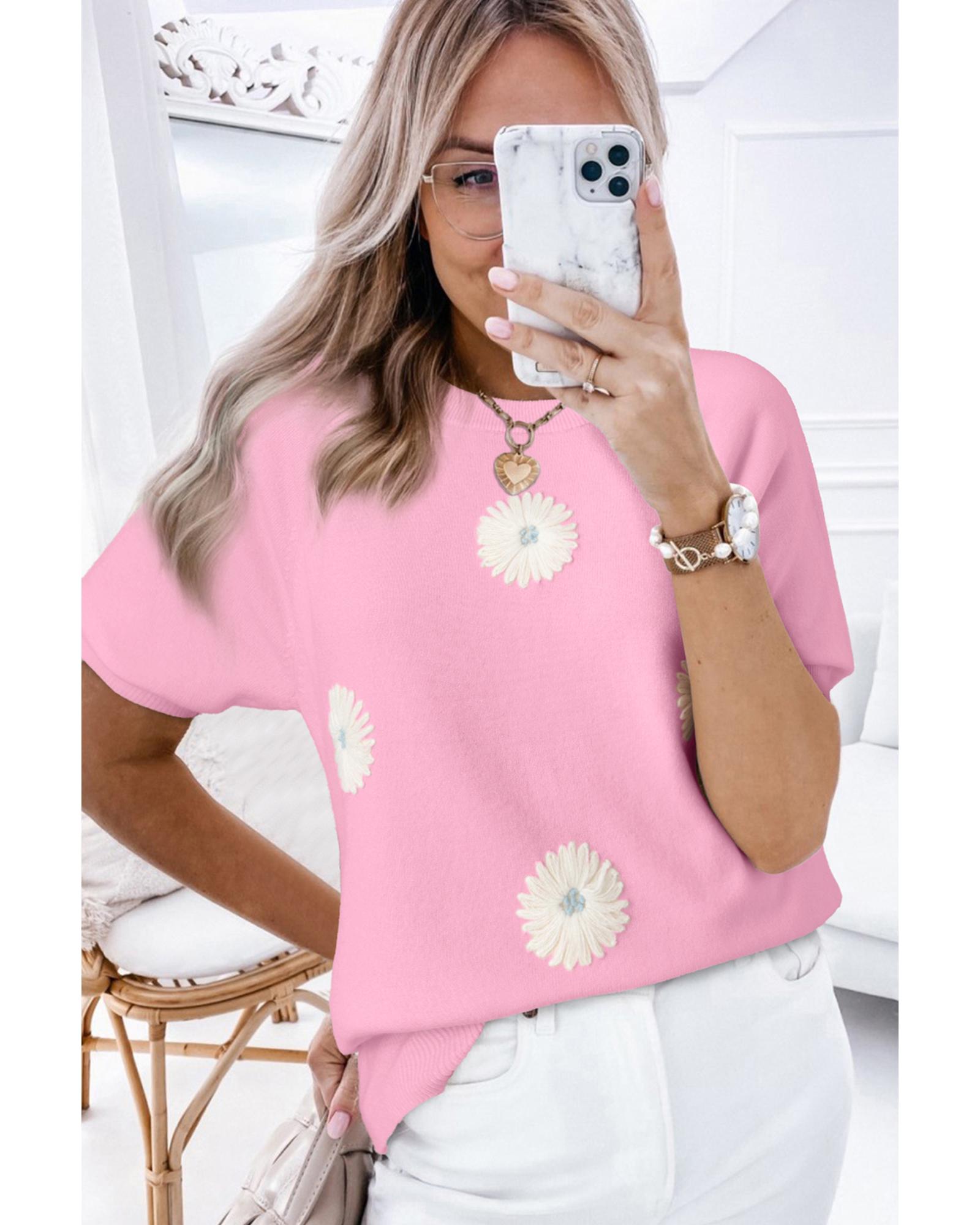 Pink Flower Pattern Short Sleeve Knitted Top – XL