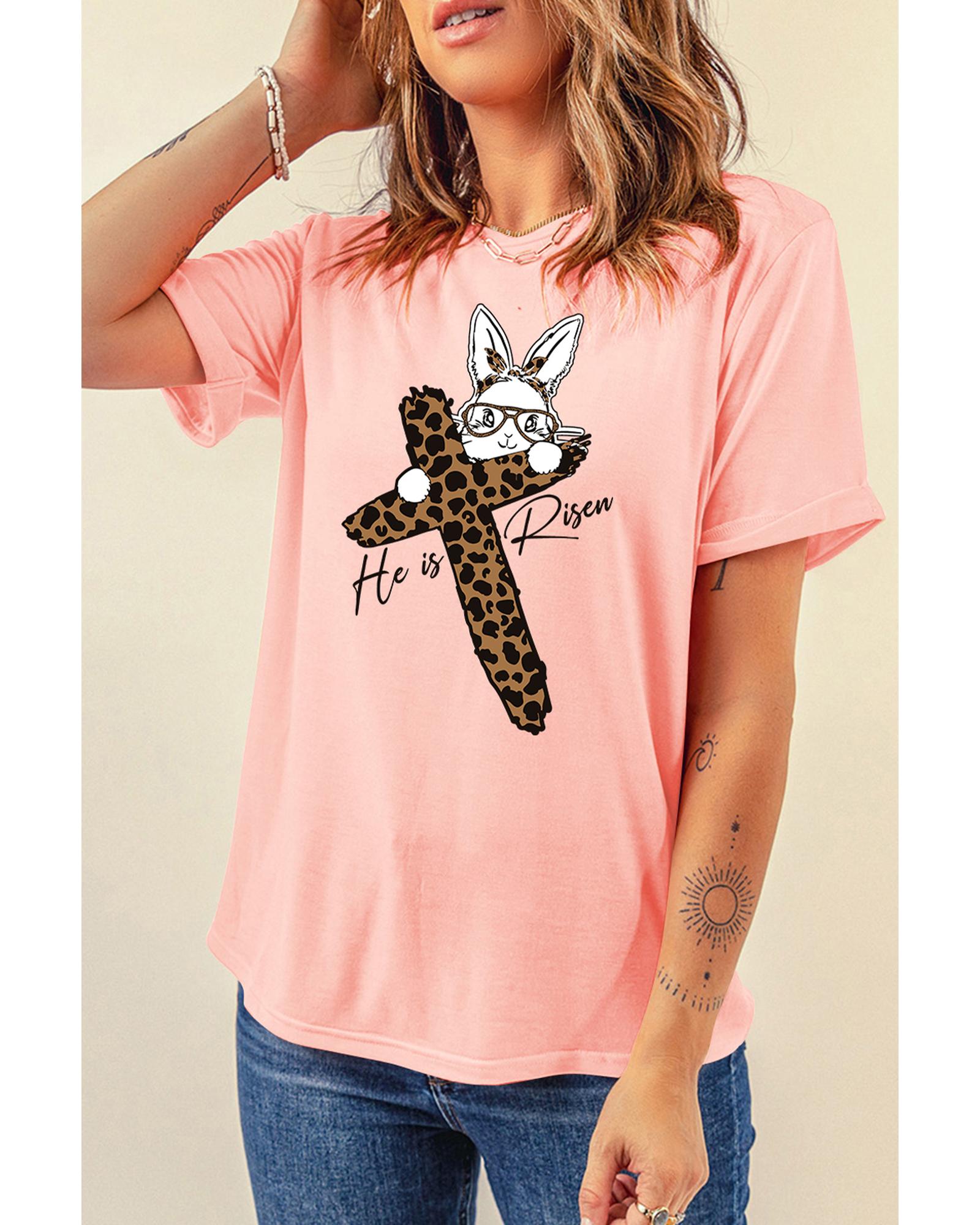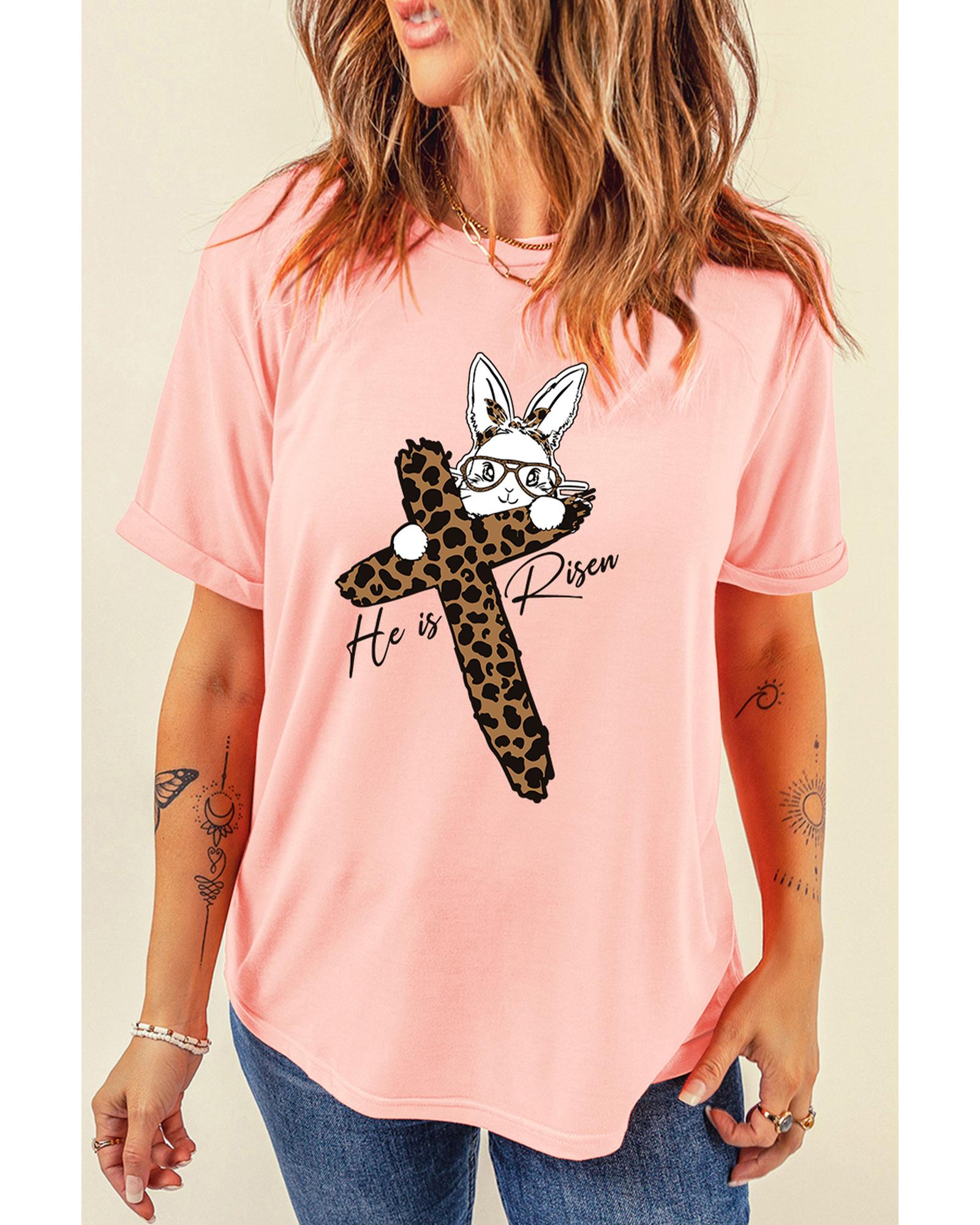 Pink He is Risen Easter Bunny Leopard Cross Graphic Tee - M