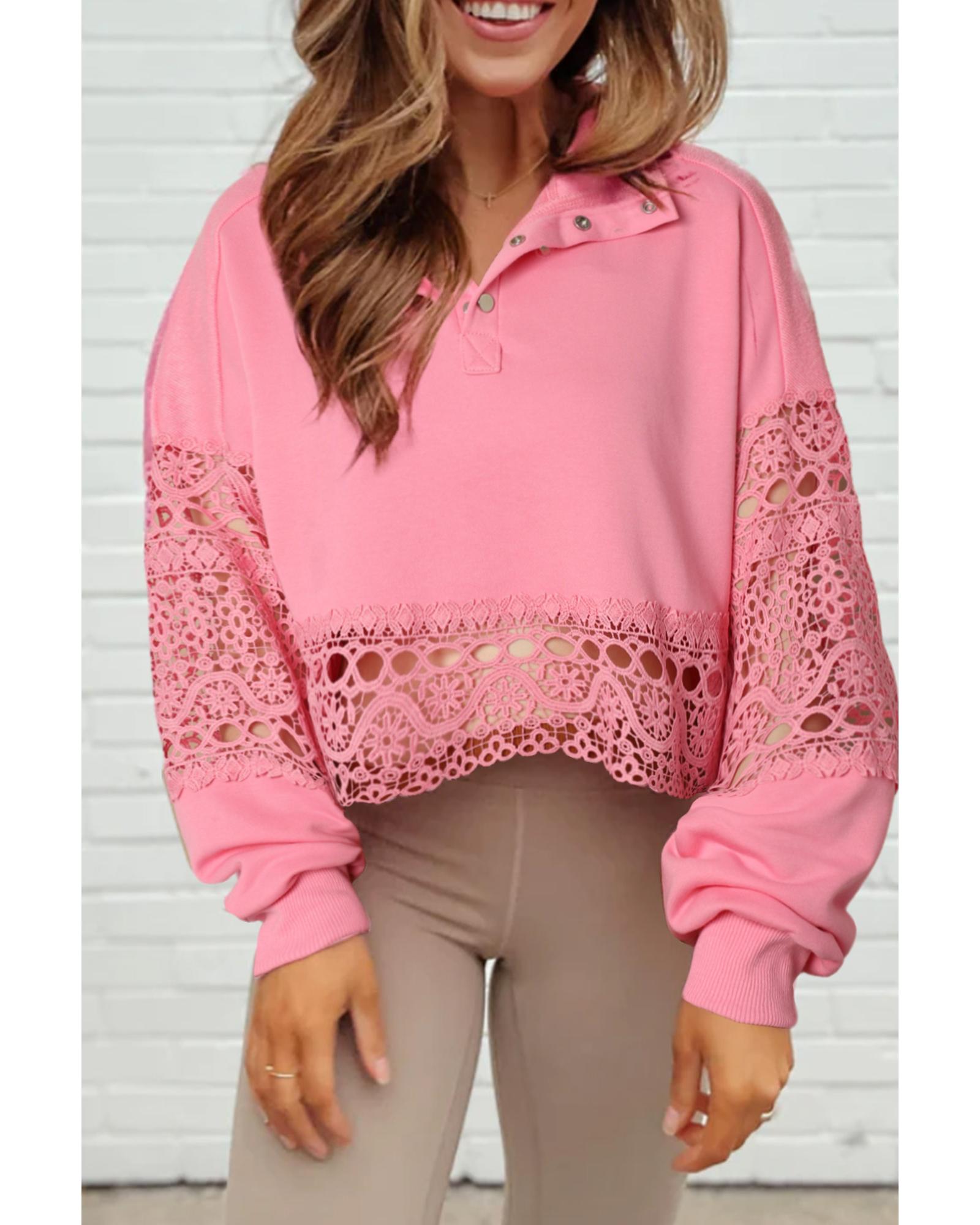• Pink Hollowed Lace Splicing Cropped Sweatshirt
