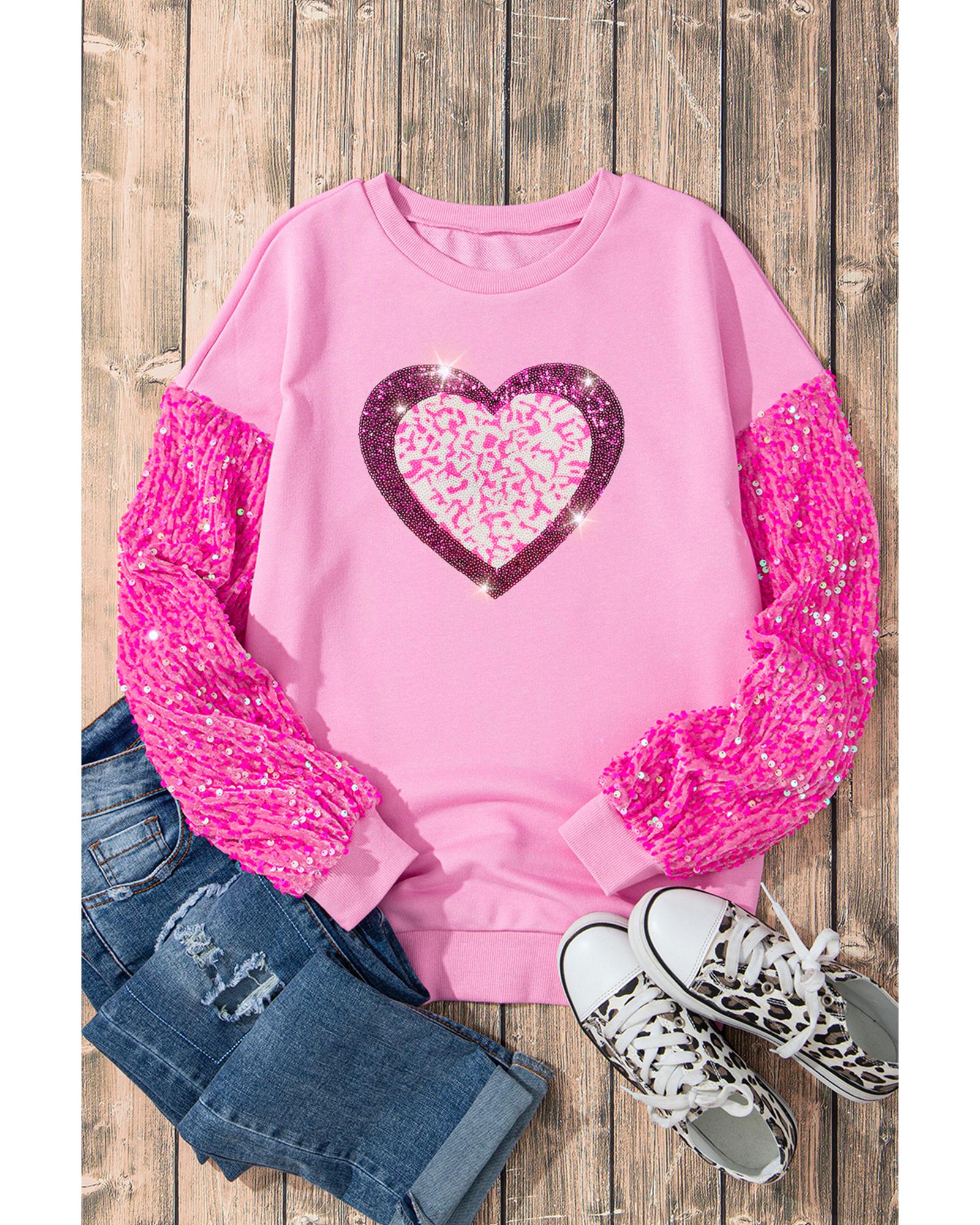 - Pink Leopard Heart Graphic Sequin Patchwork Long Sleeve Valentines Top