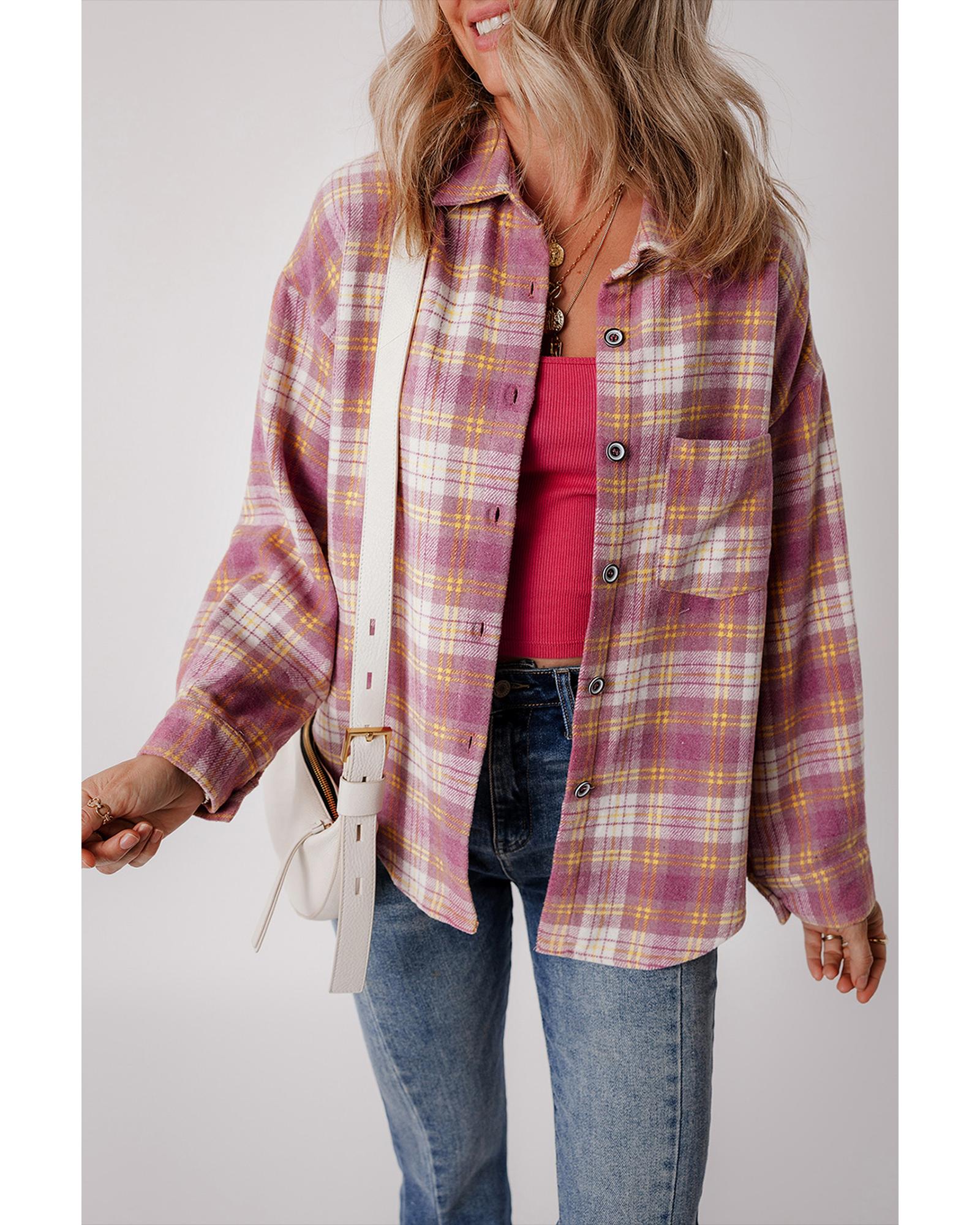 Pink Plaid Print Chest Pocket Long Sleeve Shacket – XL