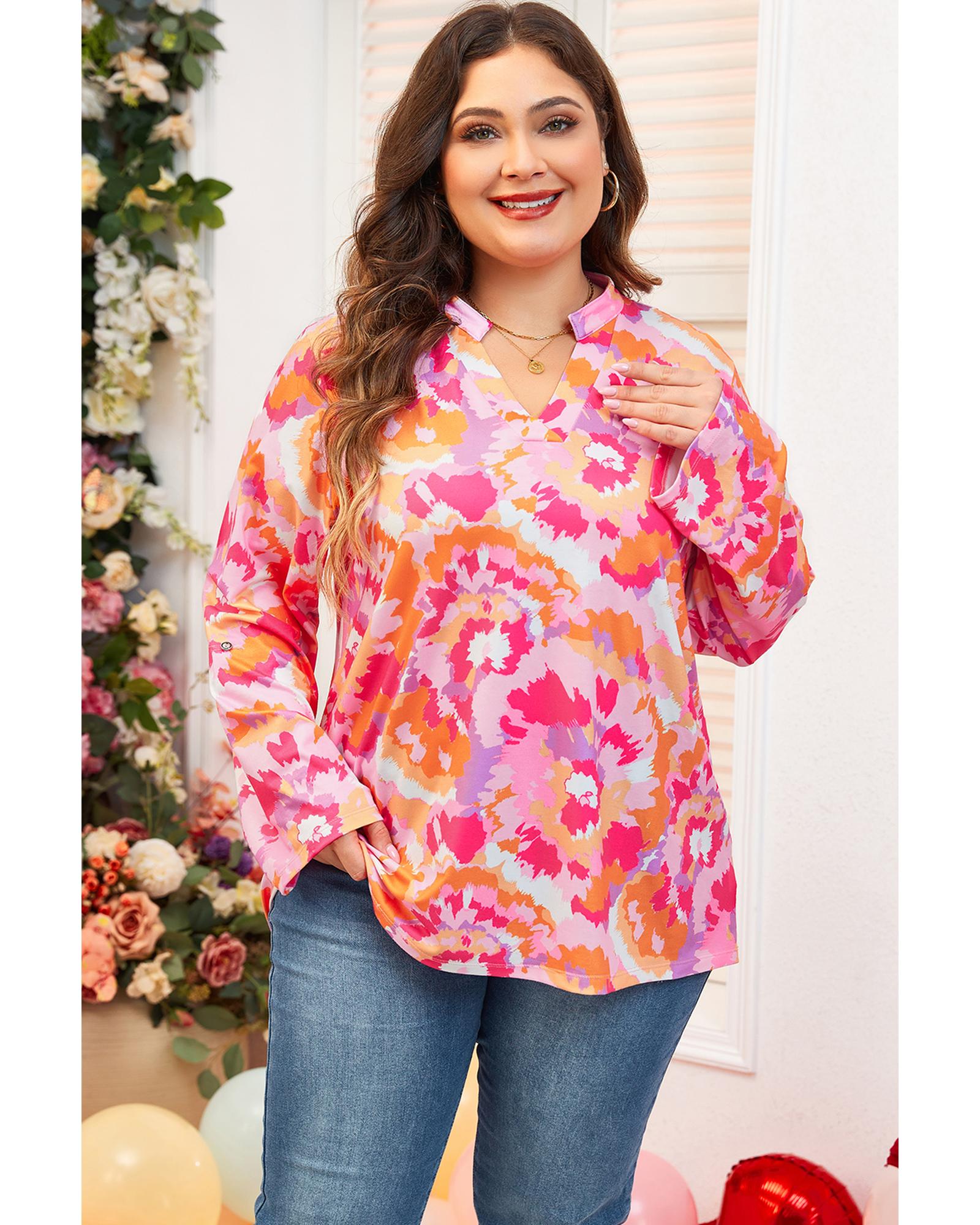 Pink Plus Size Abstract Floral Print V Neck Blouse – 2X