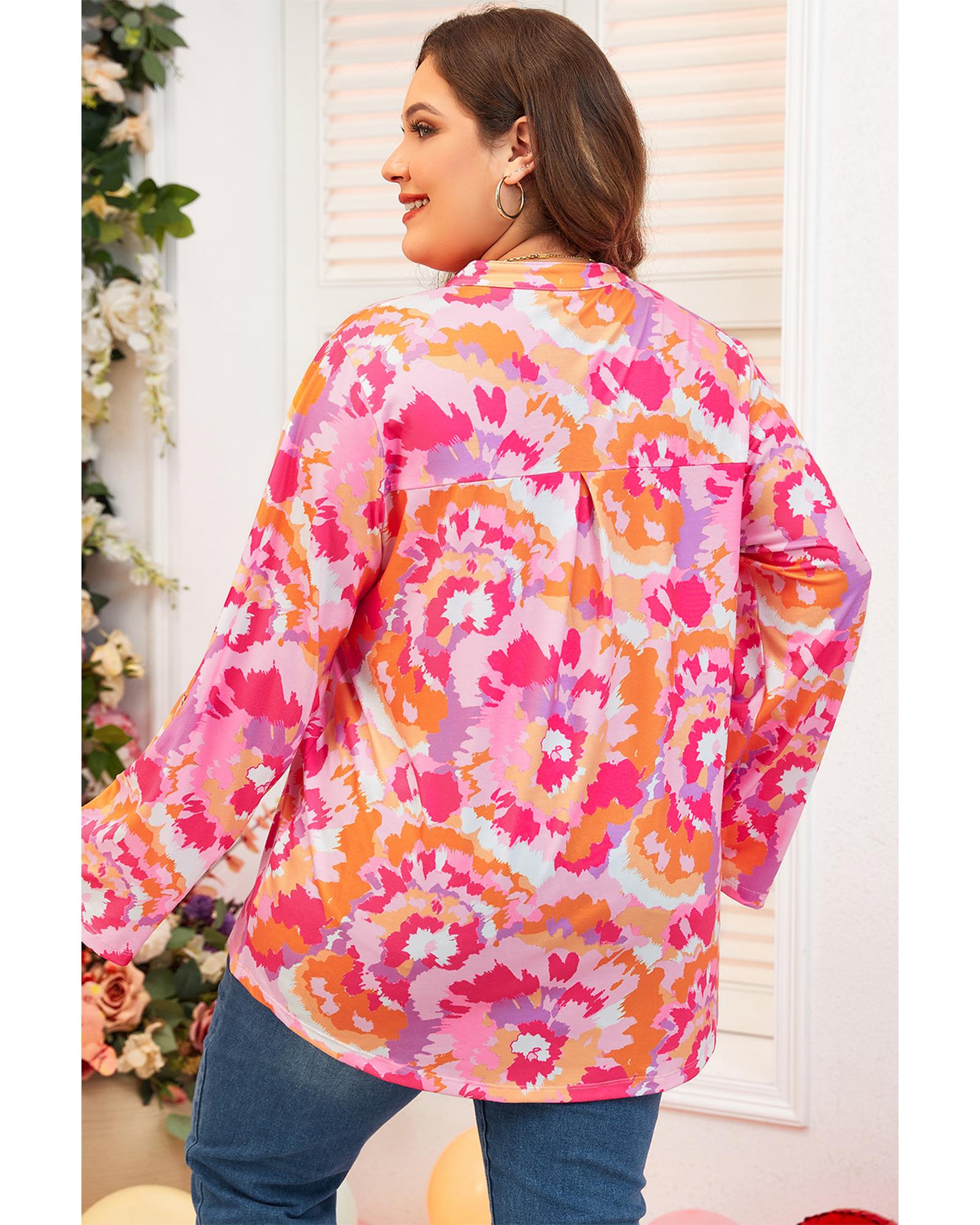 Pink Plus Size Abstract Floral Print V Neck Blouse - 3X