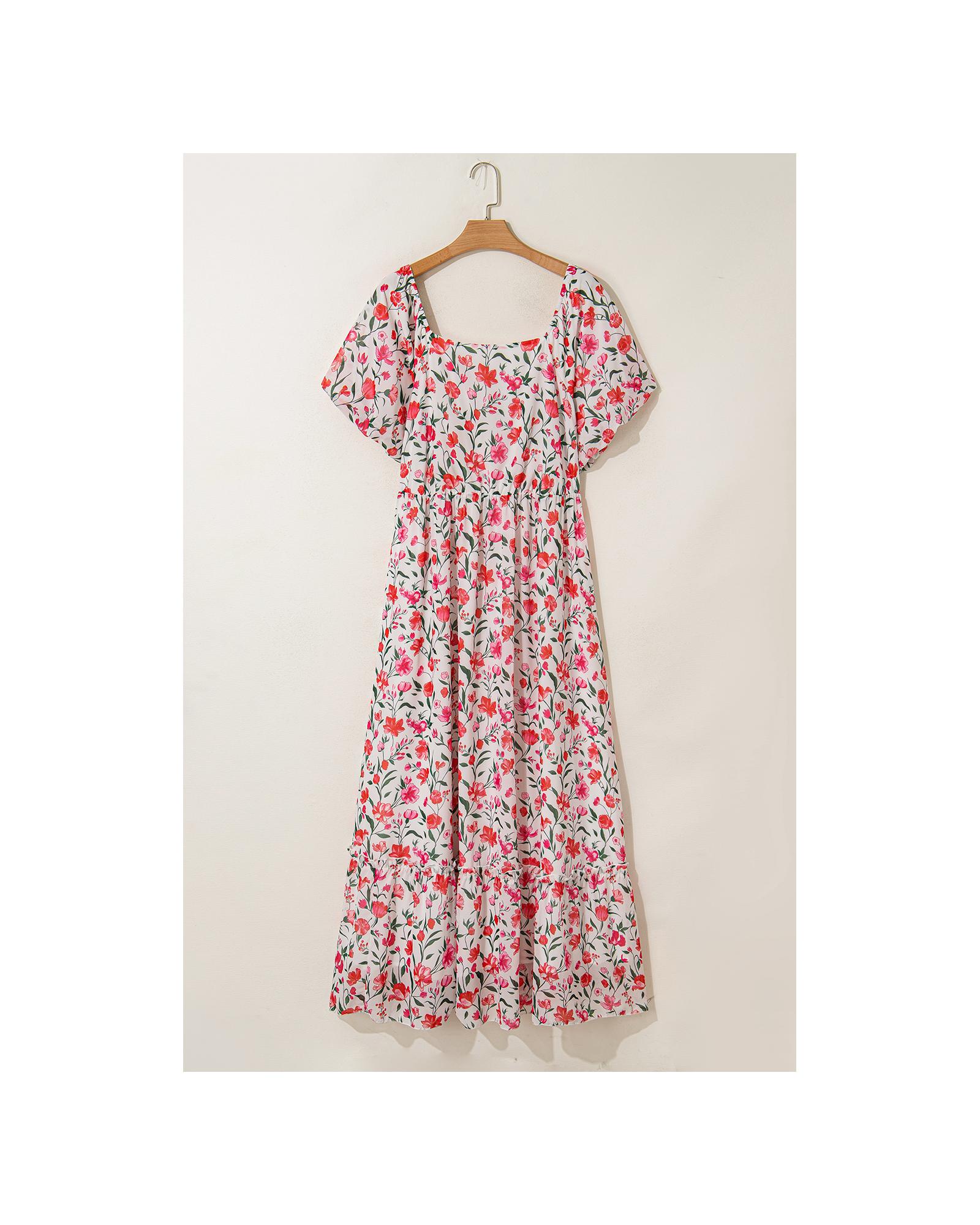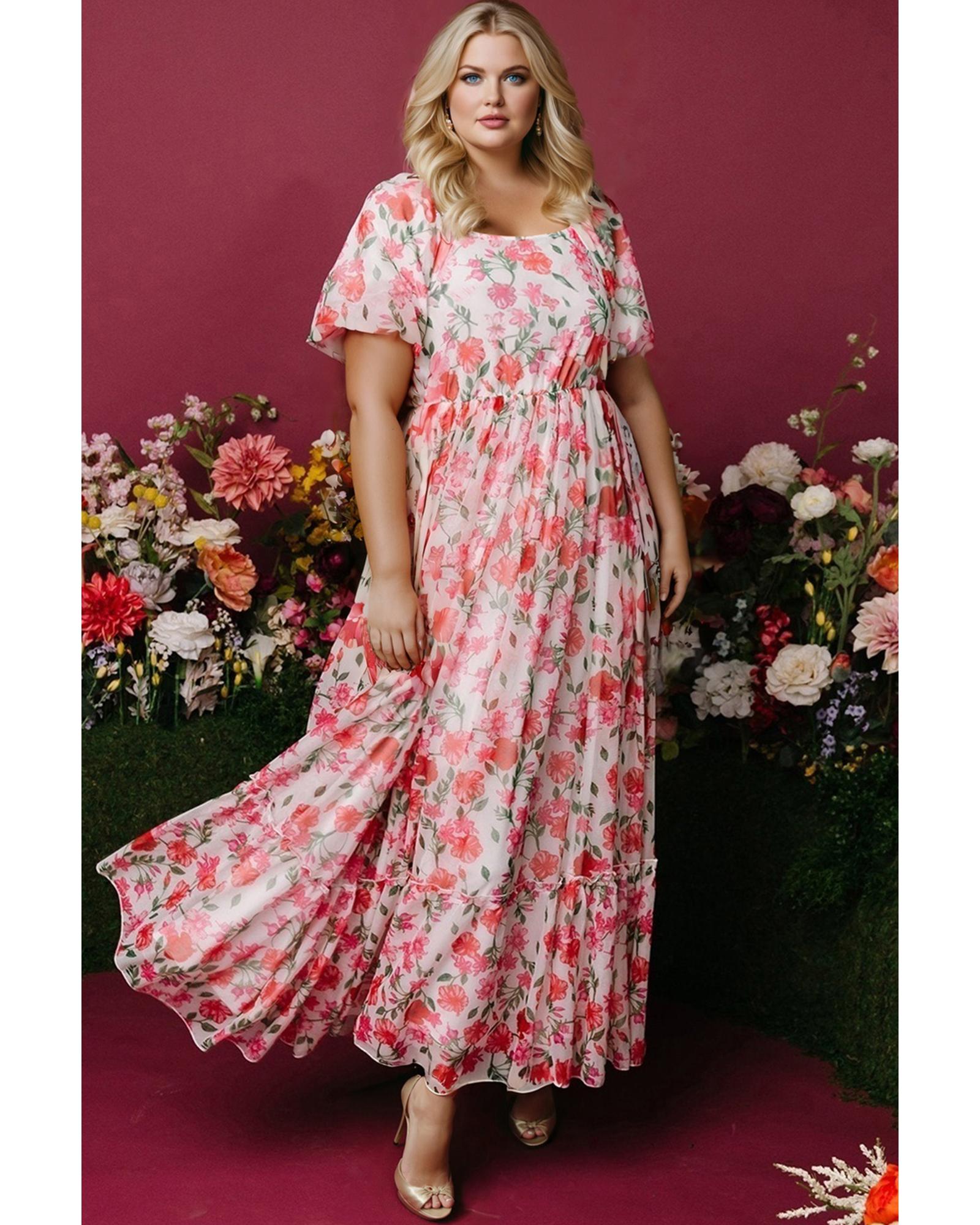 - Pink plus size floral square neck puff sleeve ruffle maxi dress