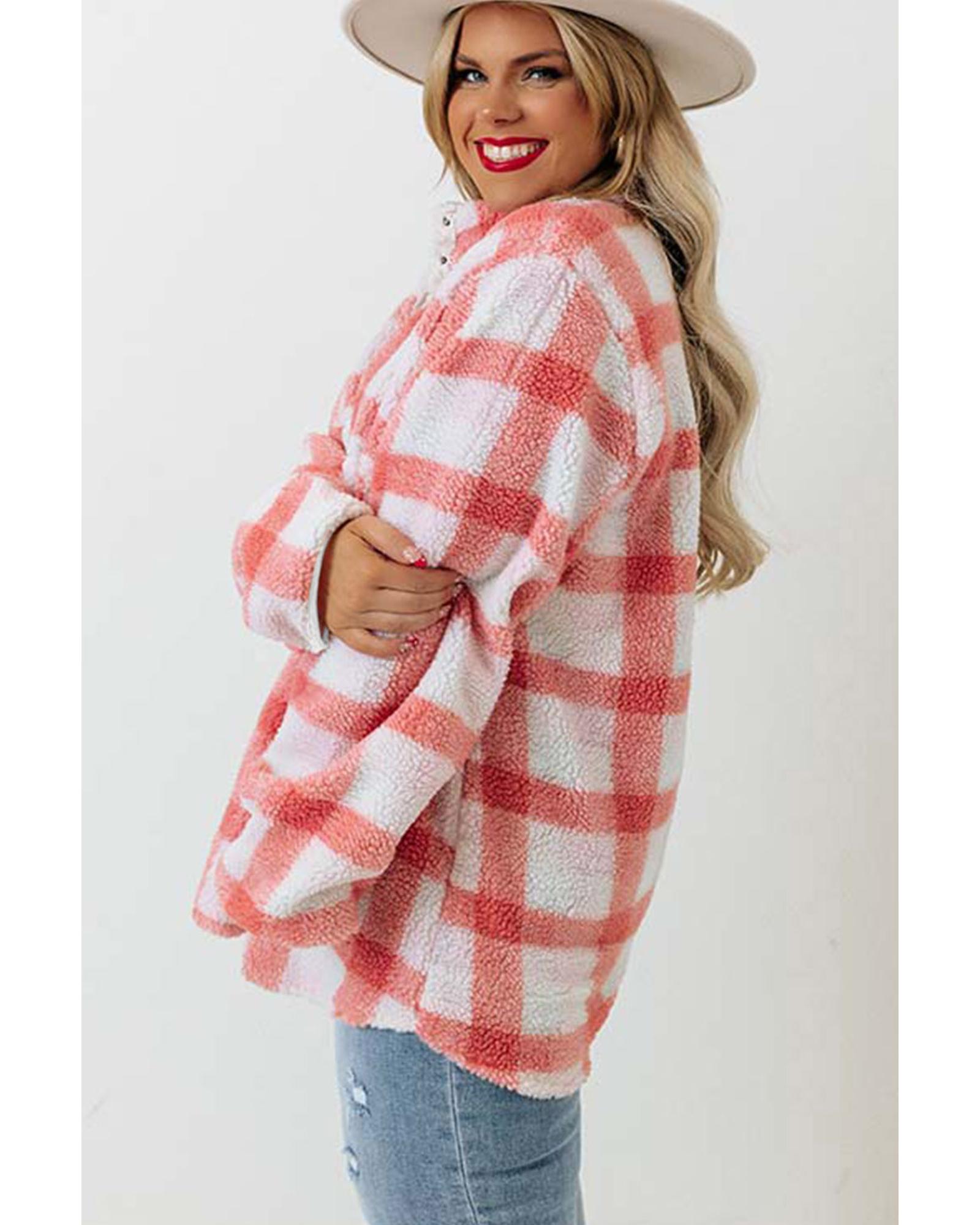 • Stay cozy and fashionable with our Pink Plus Size Tunic Plaid Sherpa Henley Sweatshirt