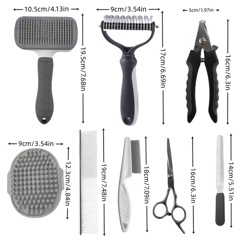 - All-In-One Grooming Solution: Nine essential tools cover all aspects of pet grooming from brushing and de-shedding to nail care and finishing.