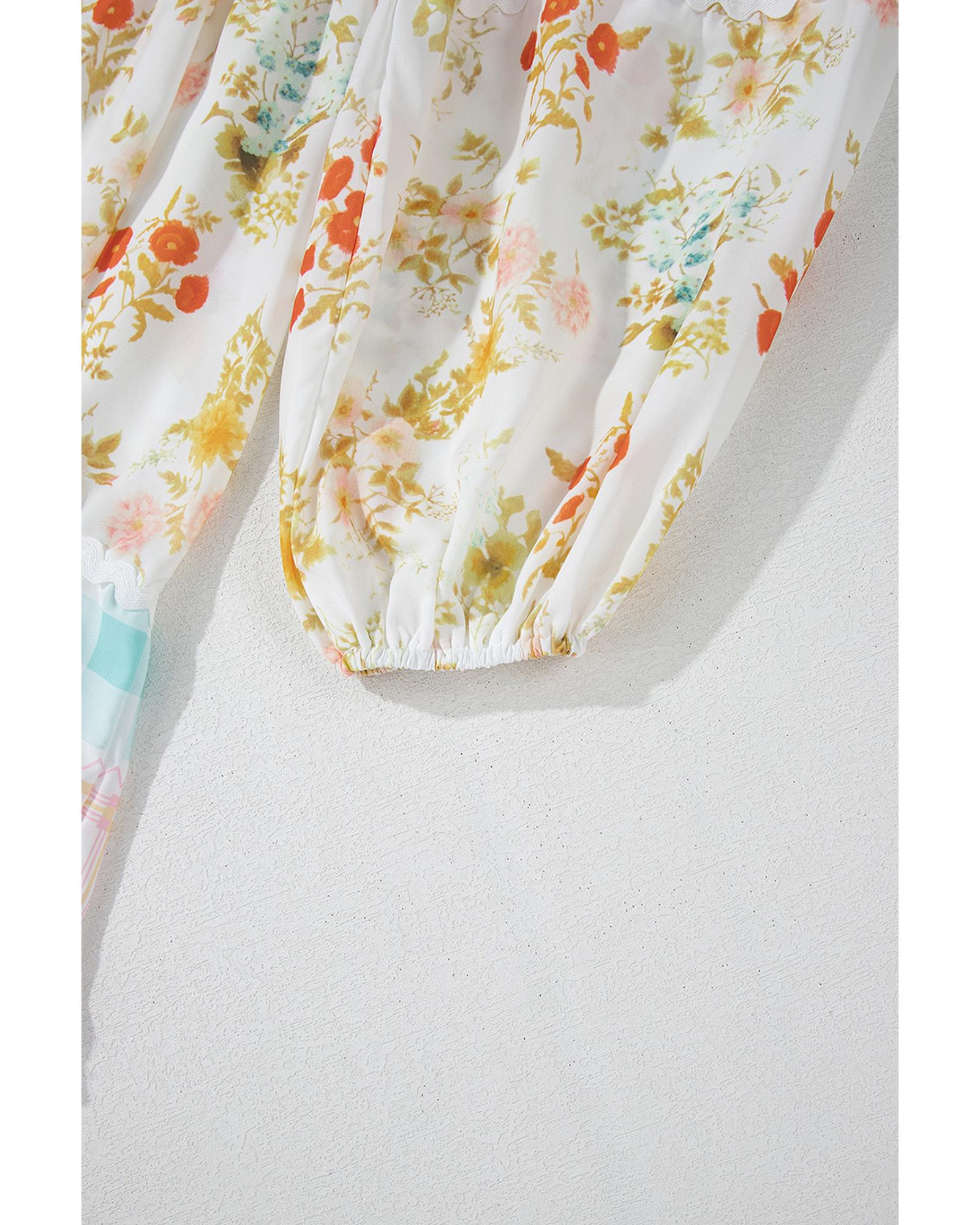 Pink Ric Rac Plaid Floral Print Patchwork Bubble Sleeve Dress – M