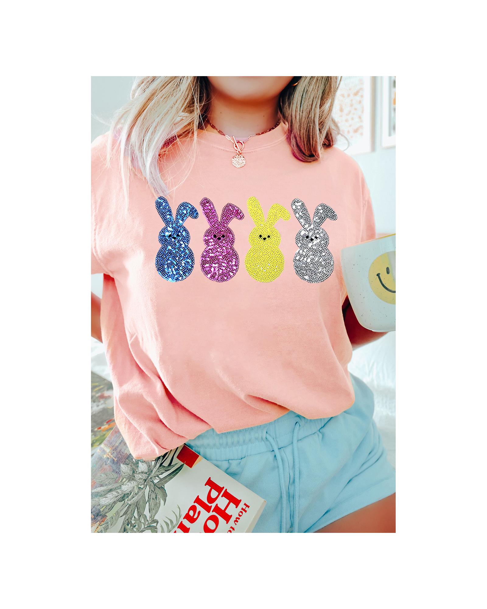 Pink Sequin Cute Bunny Graphic Easter Fashion Tee – M
