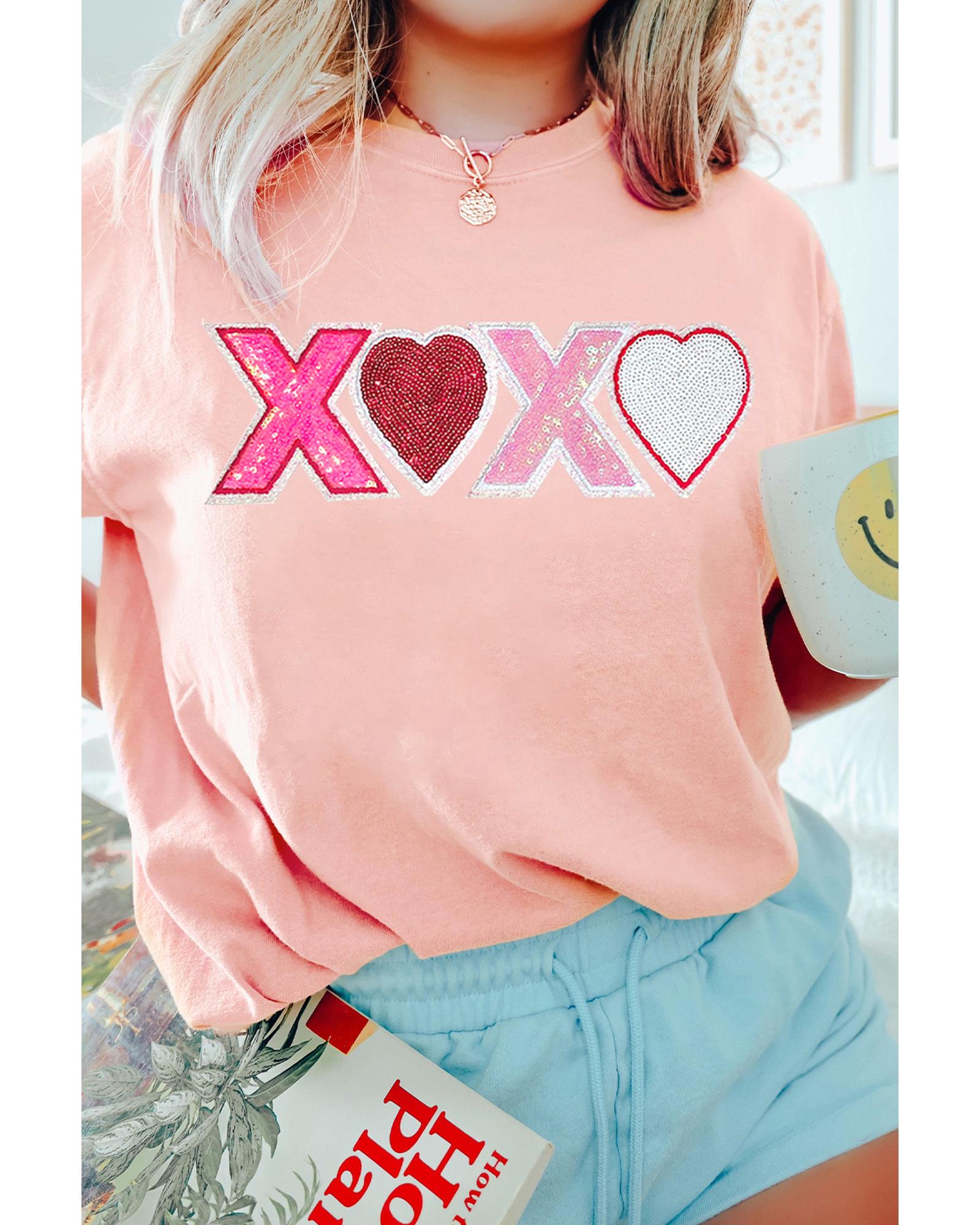 Pink Sequin Heart XOXO Patched Graphic Valentines T Shirt – M