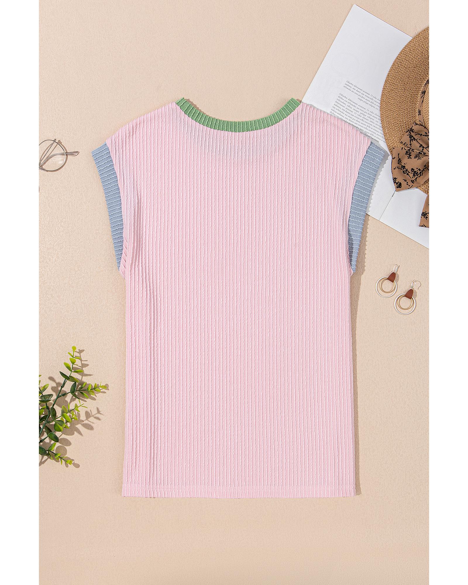 Pink Sequined MAMA Graphic Corded Rib Knit Colorblock T Shirt – S