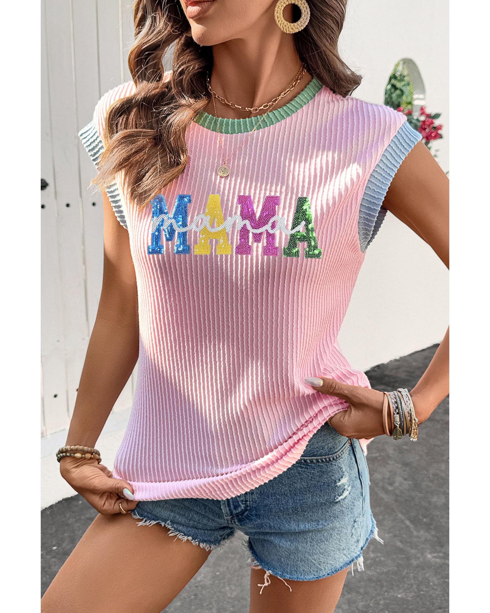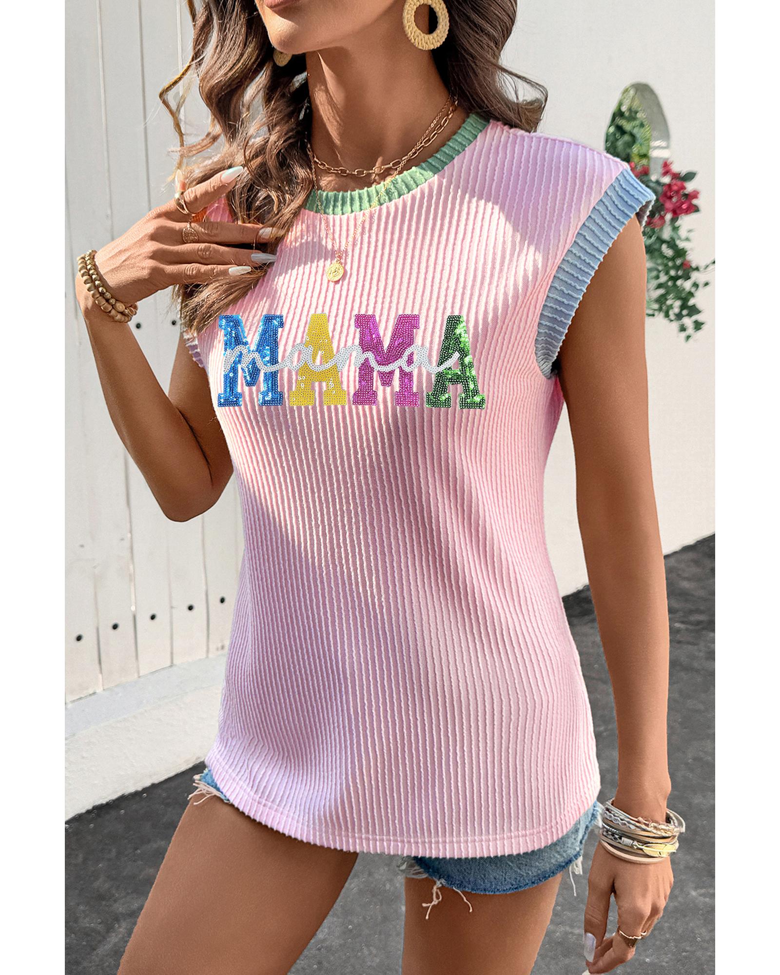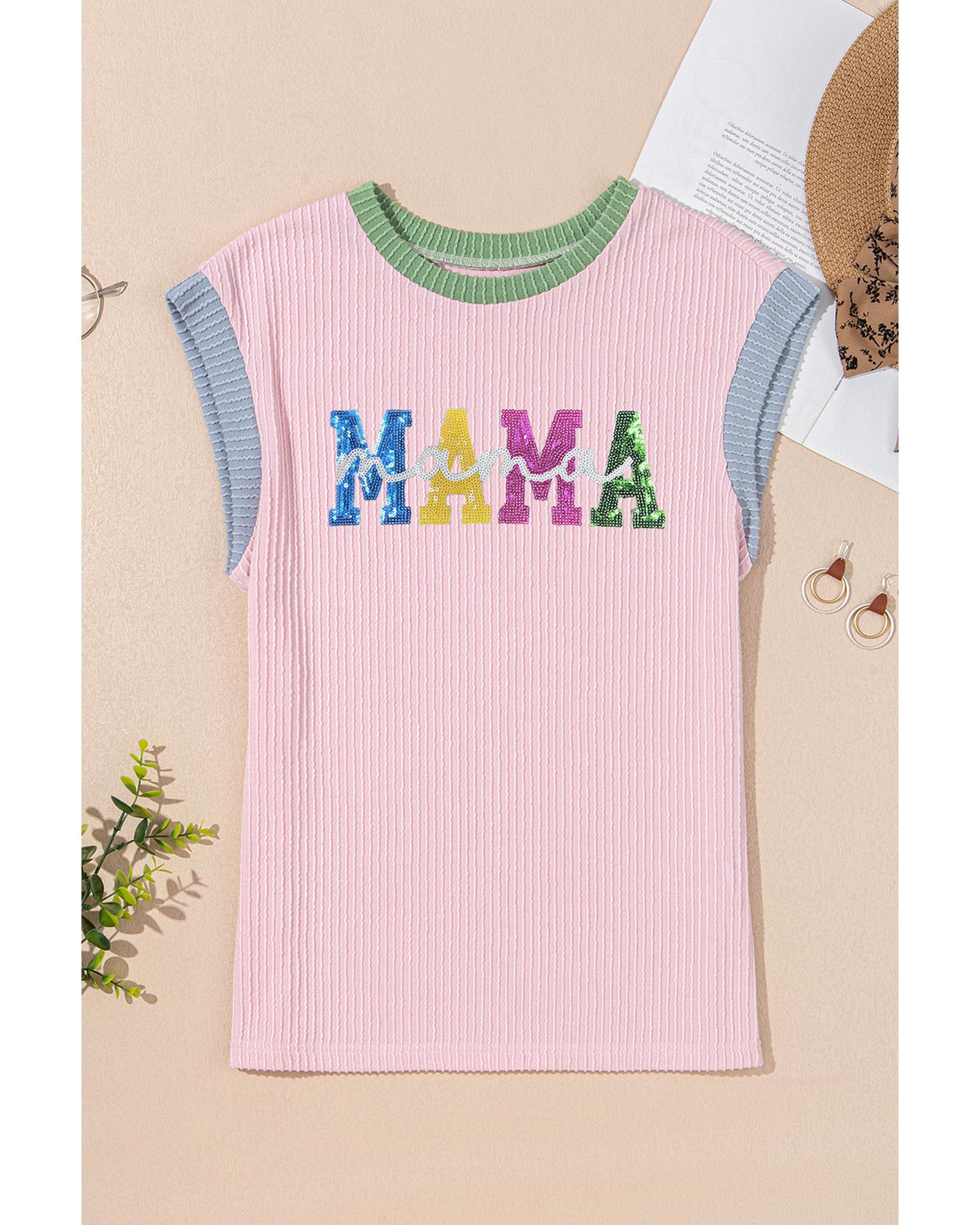 Pink Sequined MAMA Graphic Corded Rib Knit Colorblock T Shirt – XL