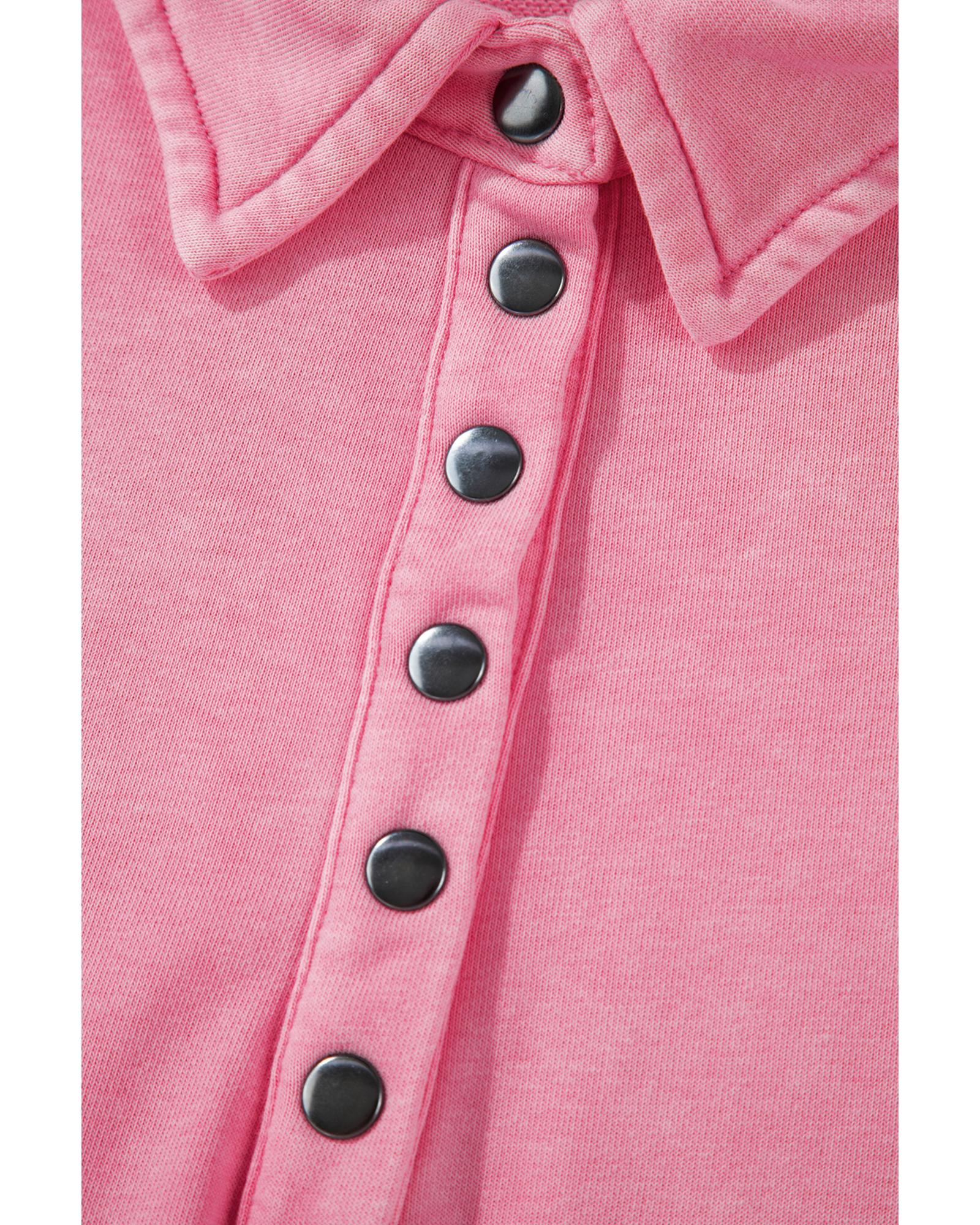 Pink Solid Snap Buttons Collared Balloon Sleeve Oversized Sweatshirt – S