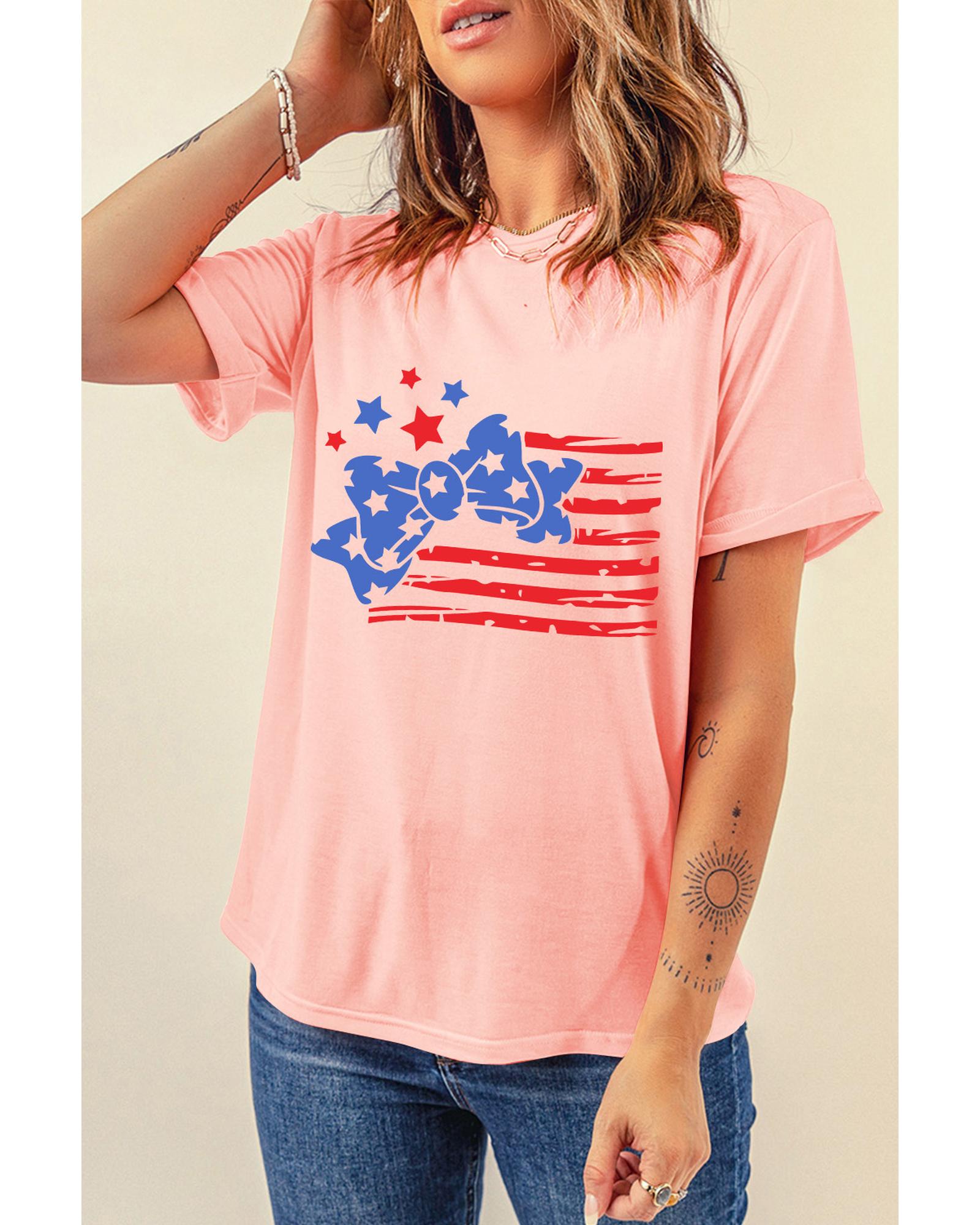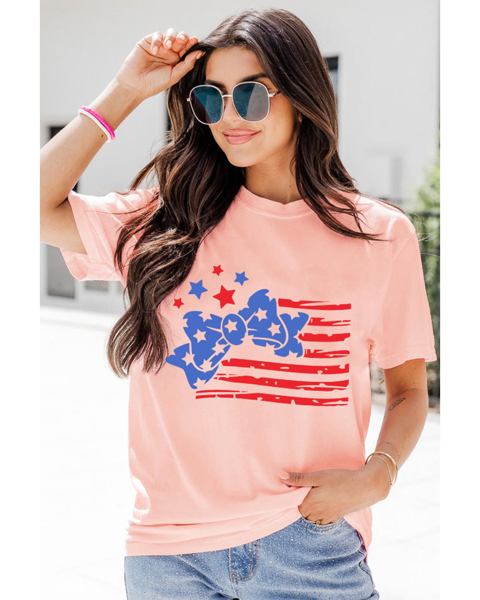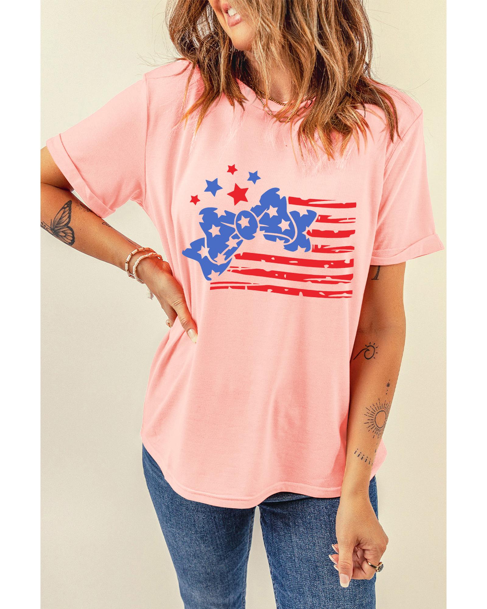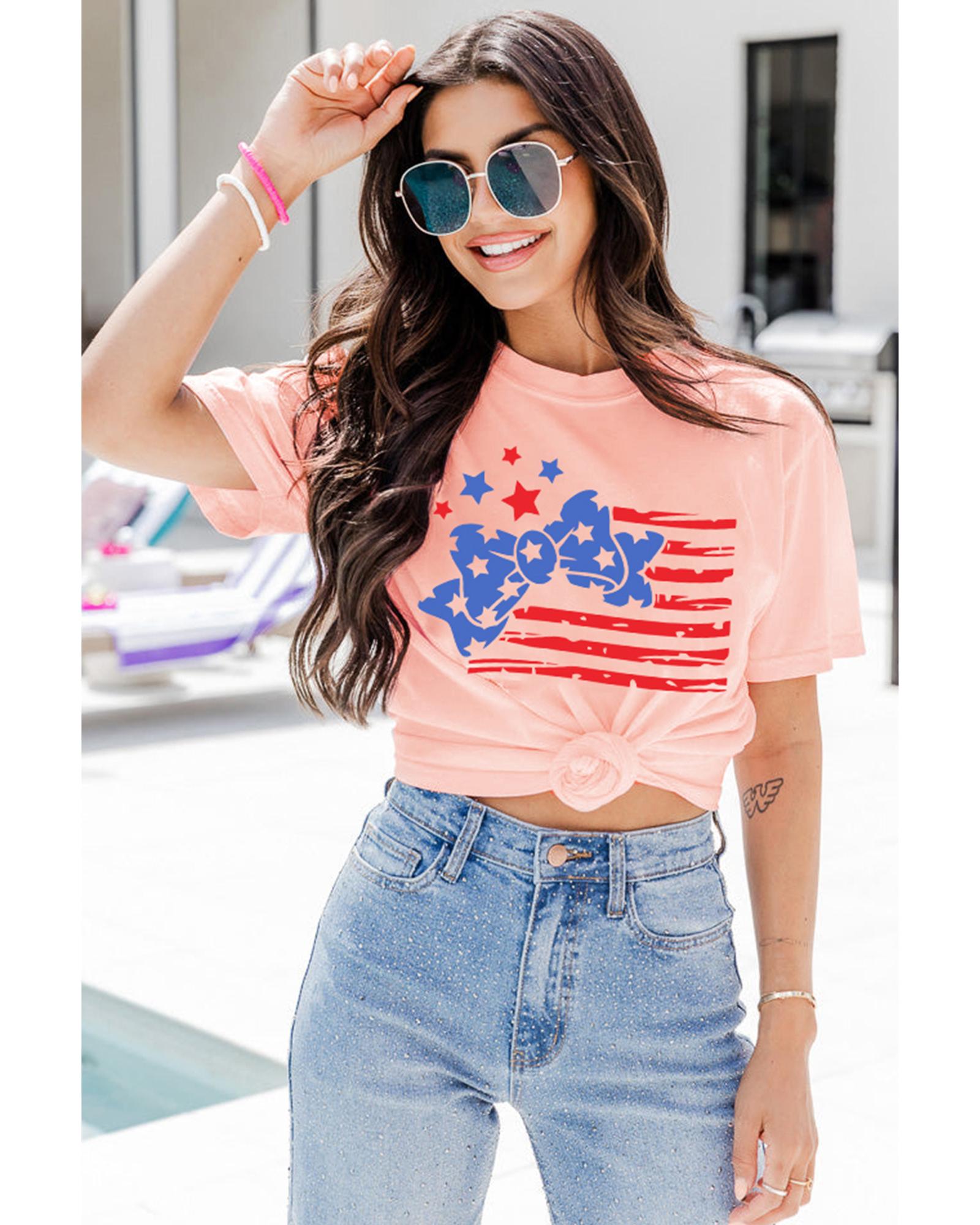 - Pink Stars and Stripes Bow Knot Crew Neck T Shirt