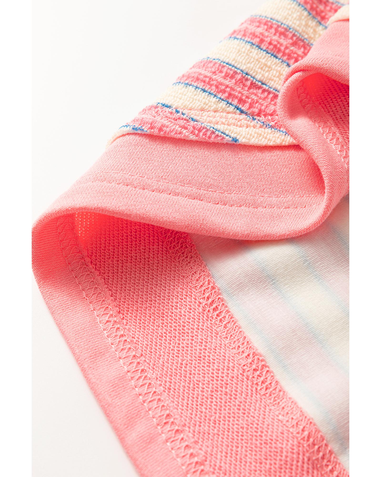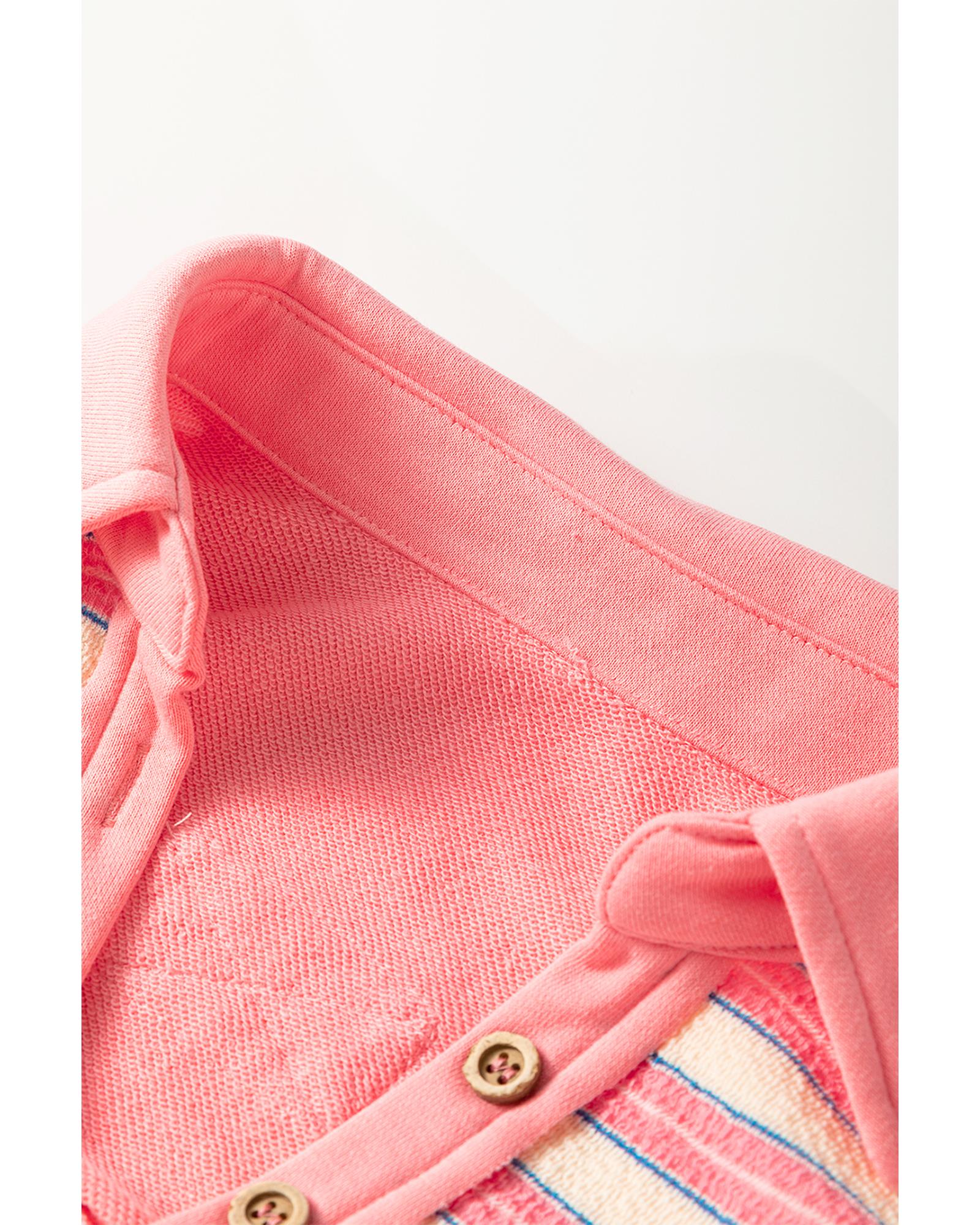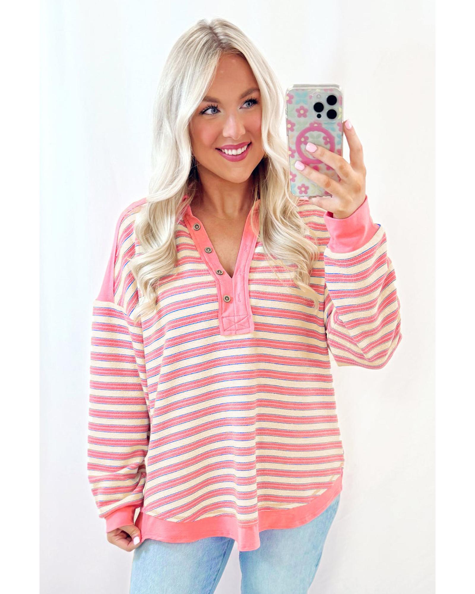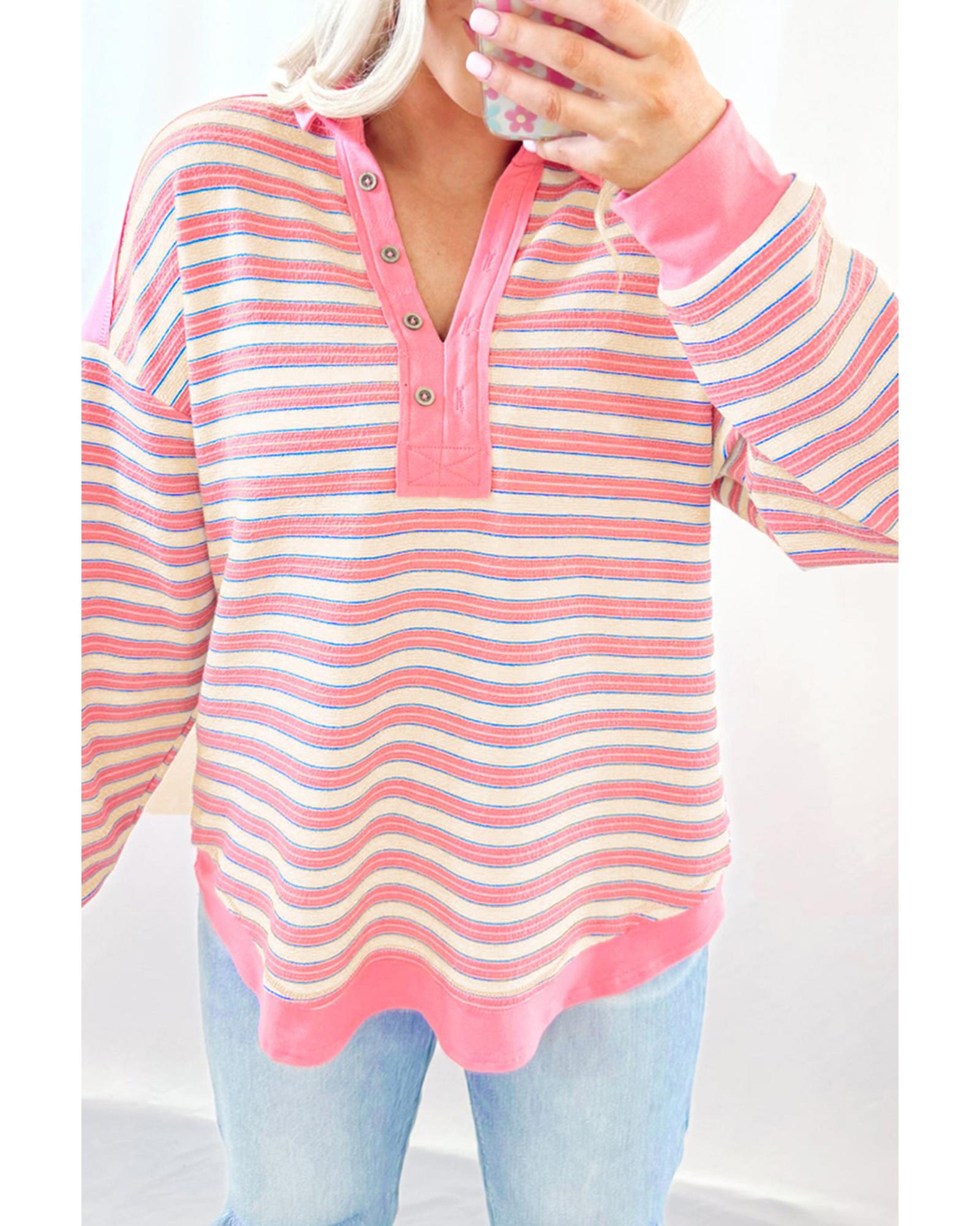 Pink Stripe Buttoned V Neck Collared Drop Shoulder Top – L