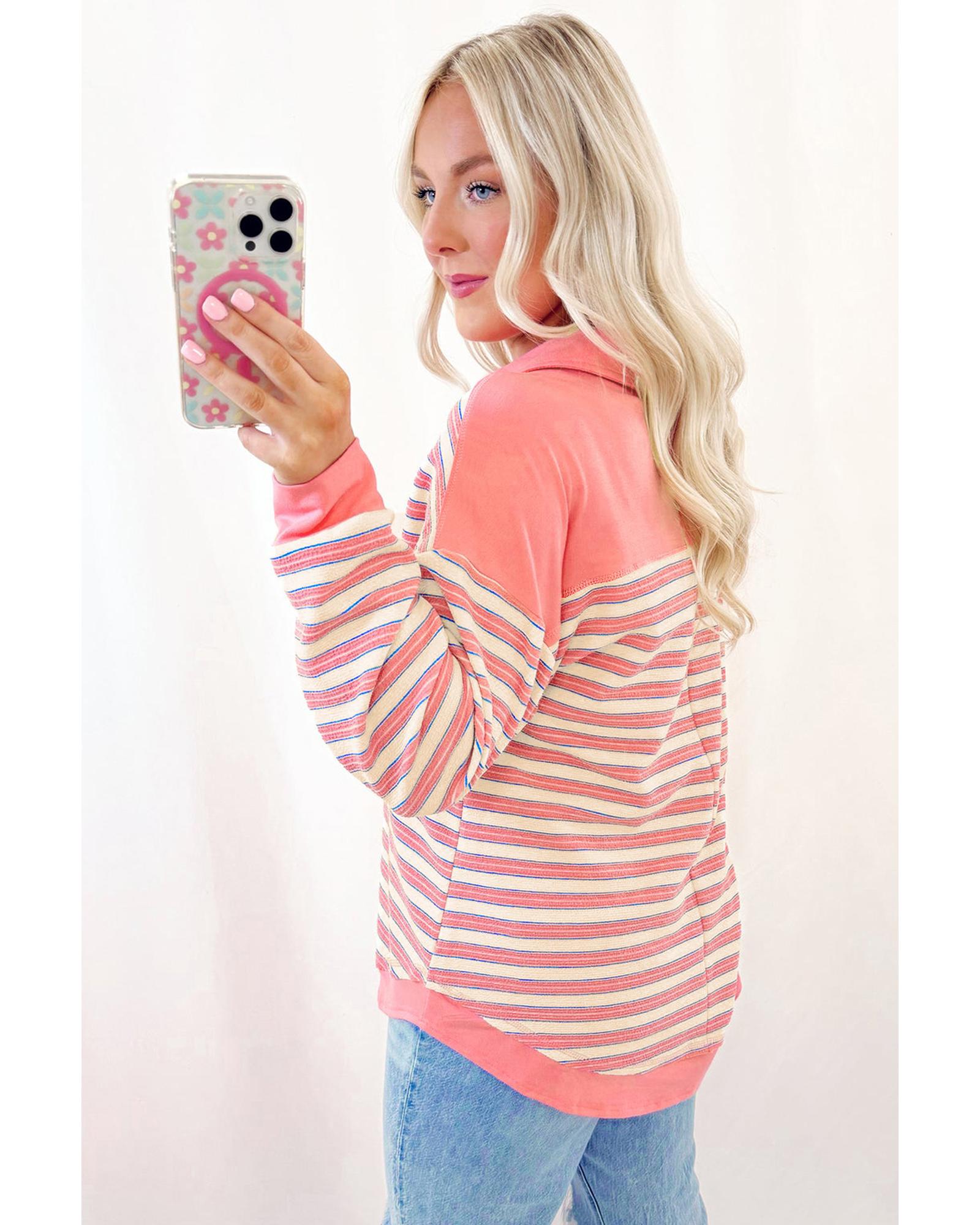 Pink Stripe Buttoned V Neck Collared Drop Shoulder Top – S