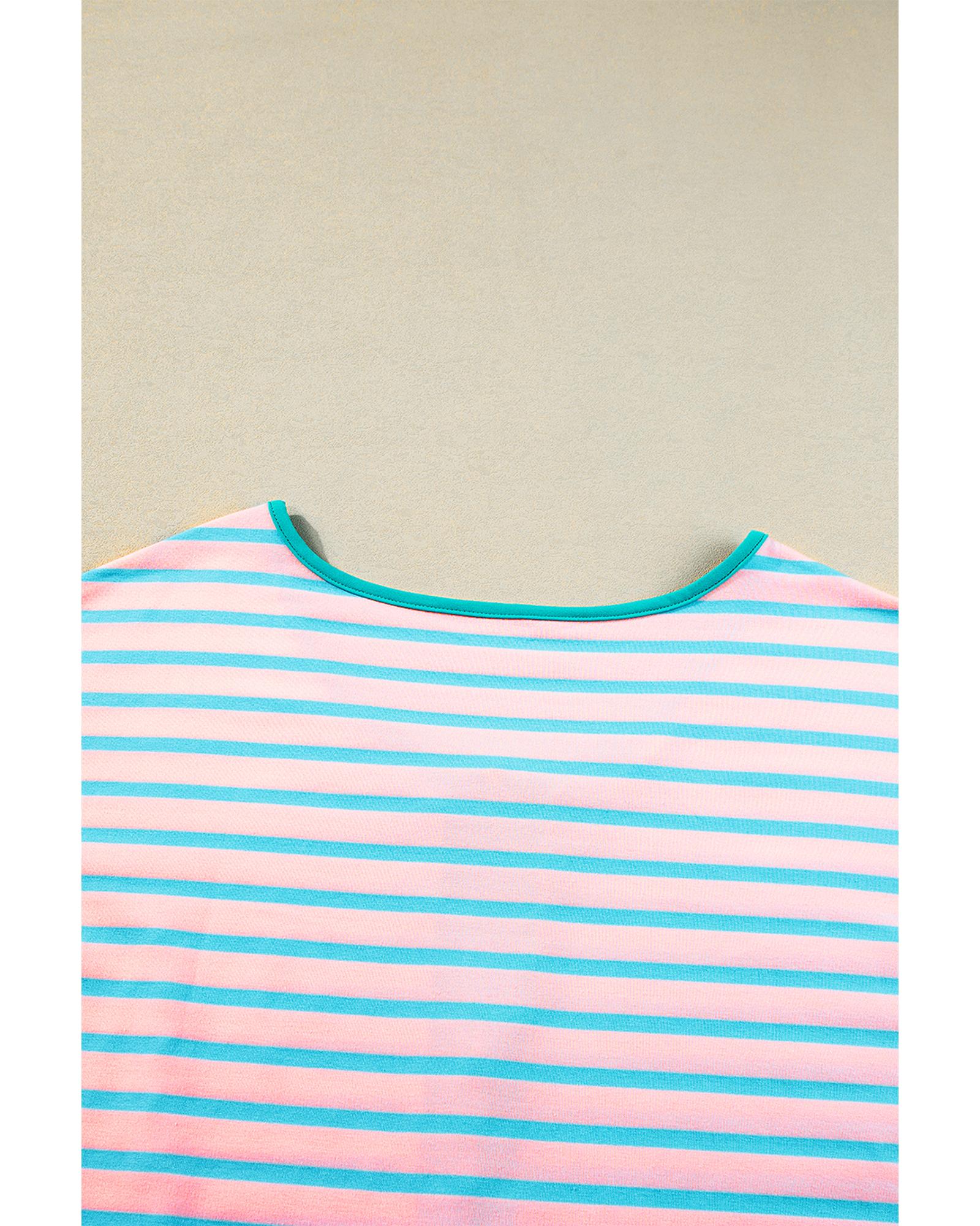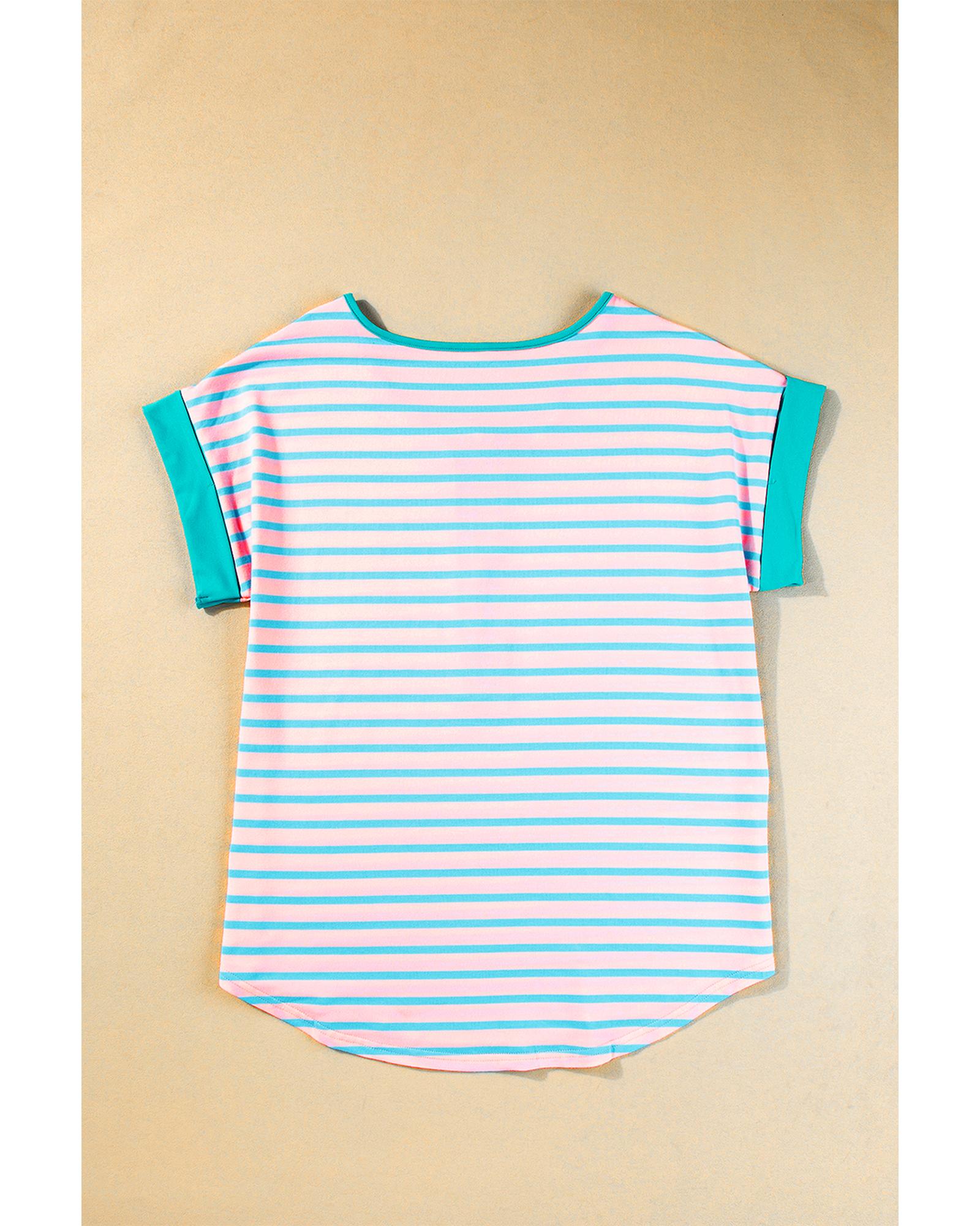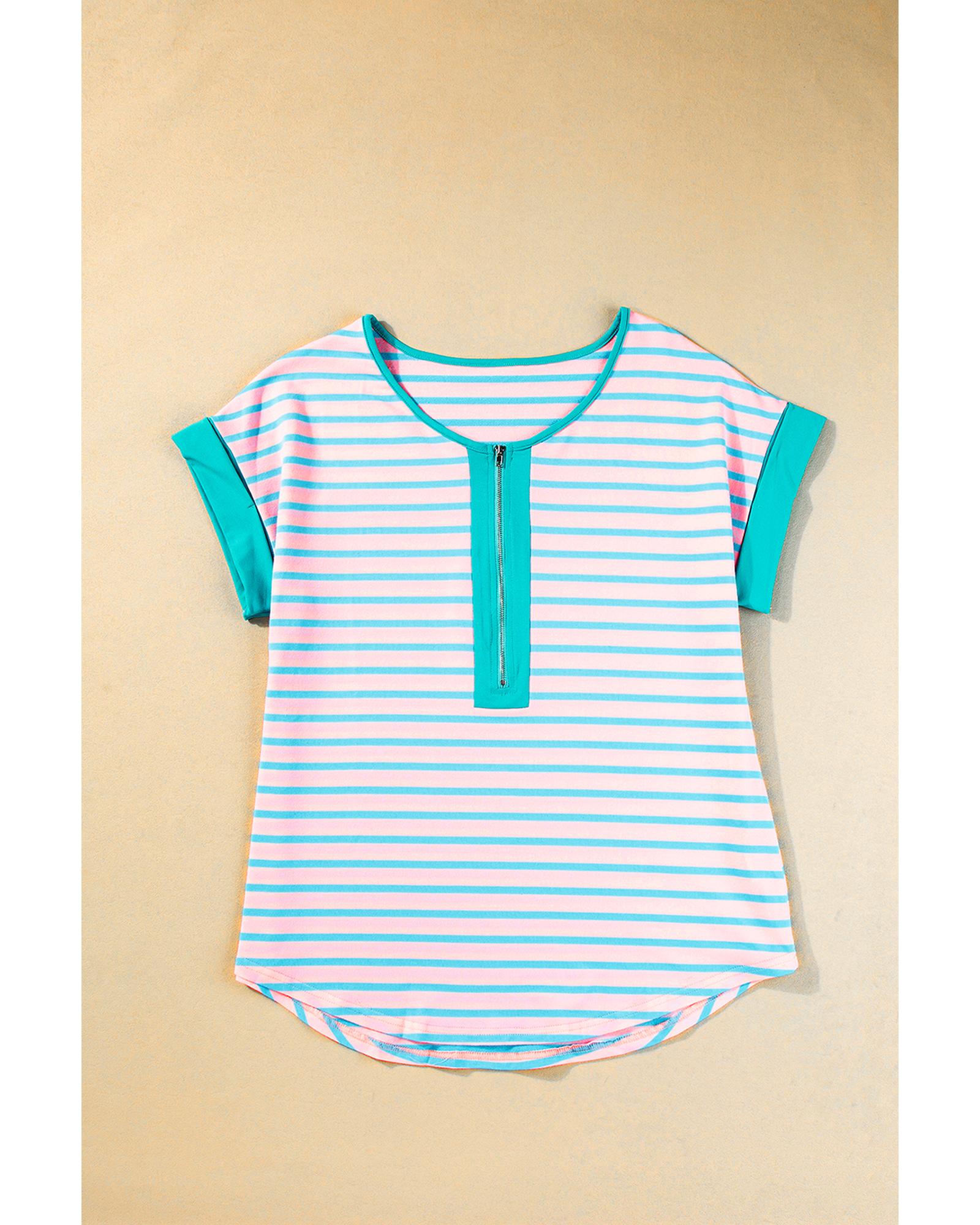 Pink Stripe Contrast Trim Half Zip Short Sleeve Top – L