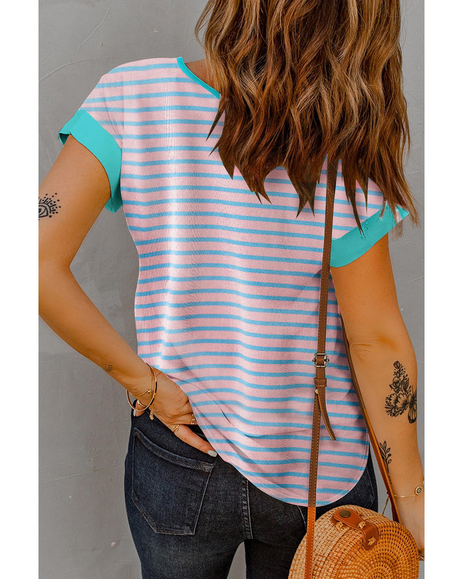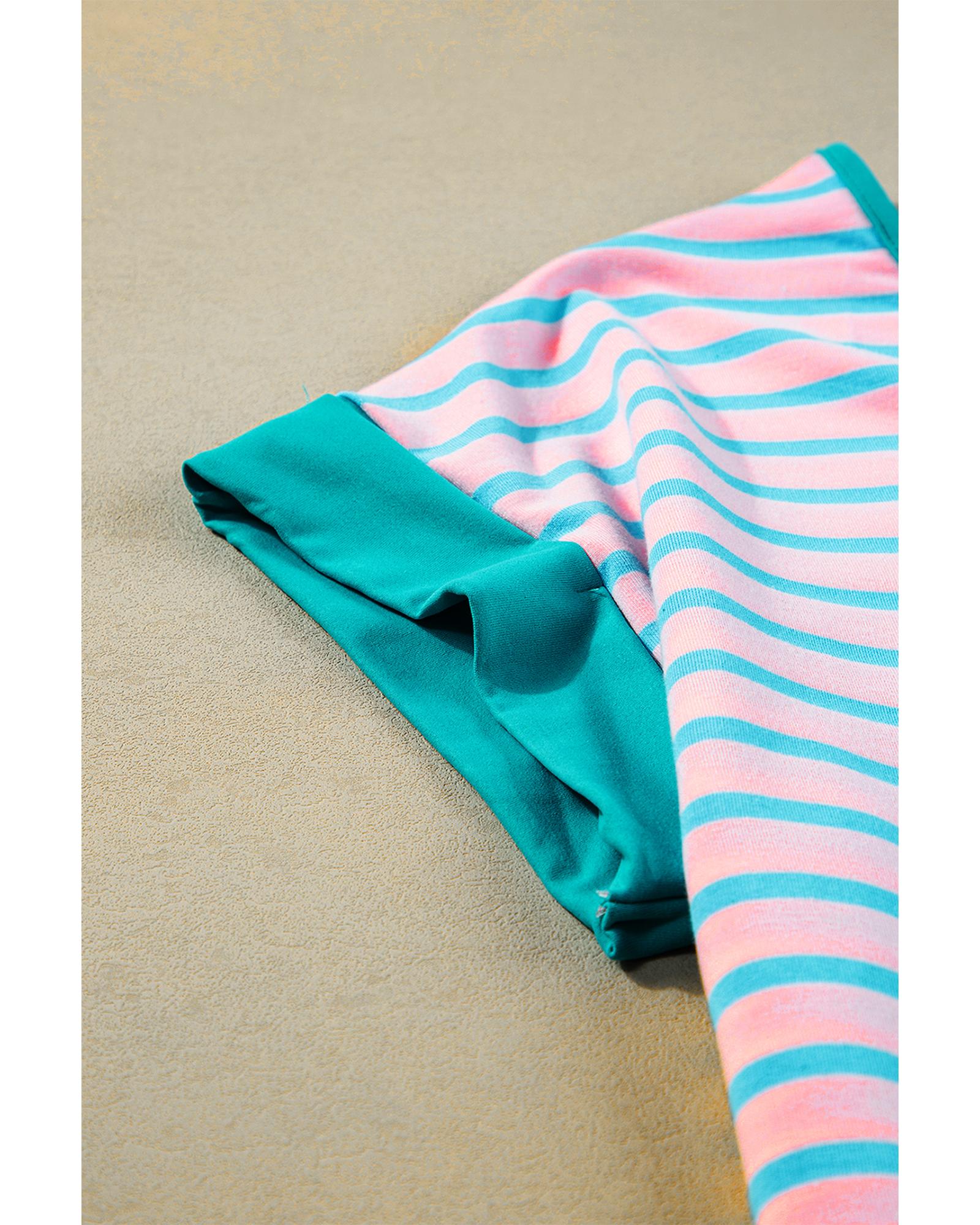 Pink Stripe Contrast Trim Half Zip Short Sleeve Top – M