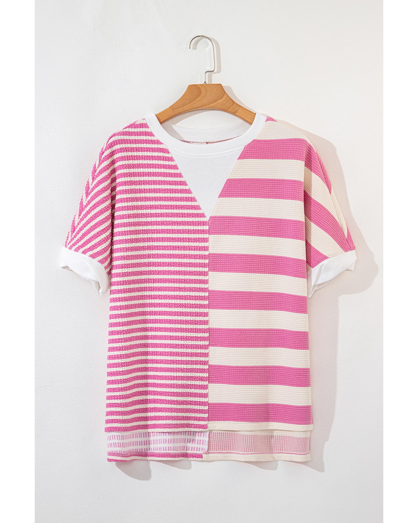 Pink Stripe Patchwork Textured Short Sleeve High Low Loose Top – M