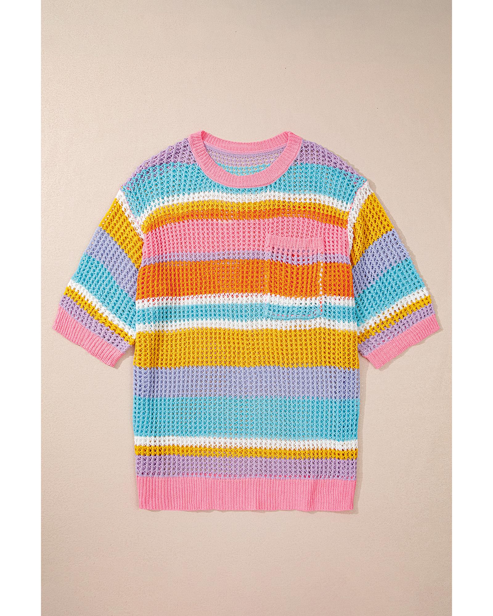 Pink Stripe Plus Size Open Knit Patch Pocket Short Sleeve Sweater – 3X