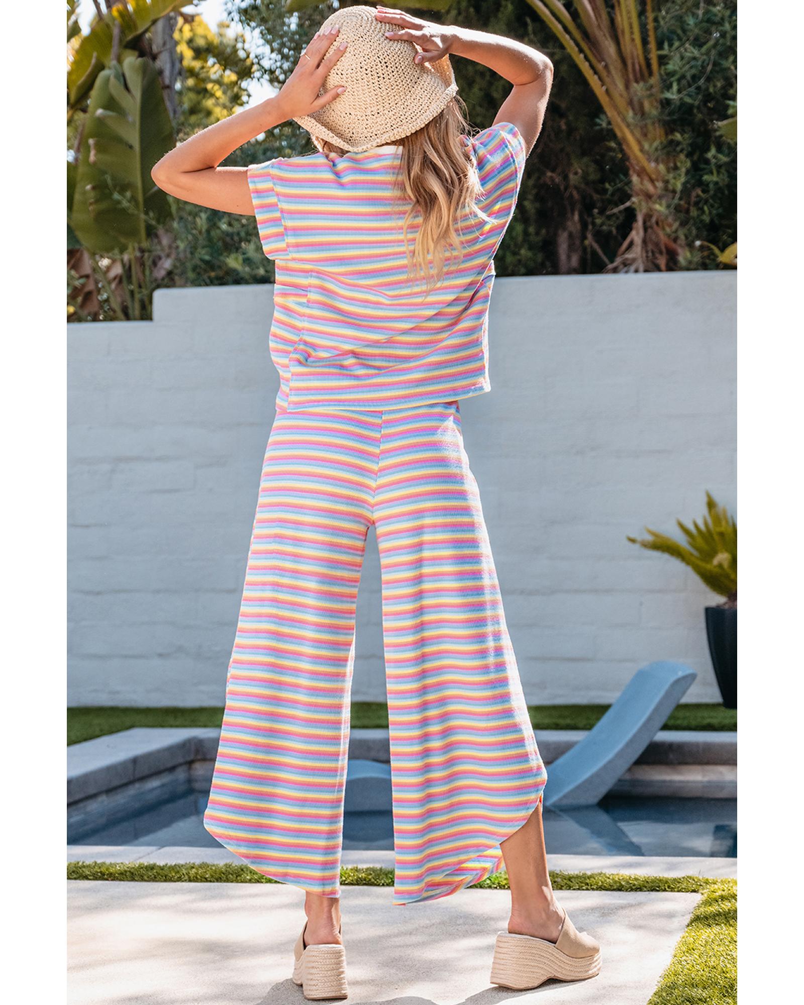 Pink Stripe Rainbow Tee Tasseled String Wide Leg Pants Set - M Original price was: $85.99.Current price is: $46.99.