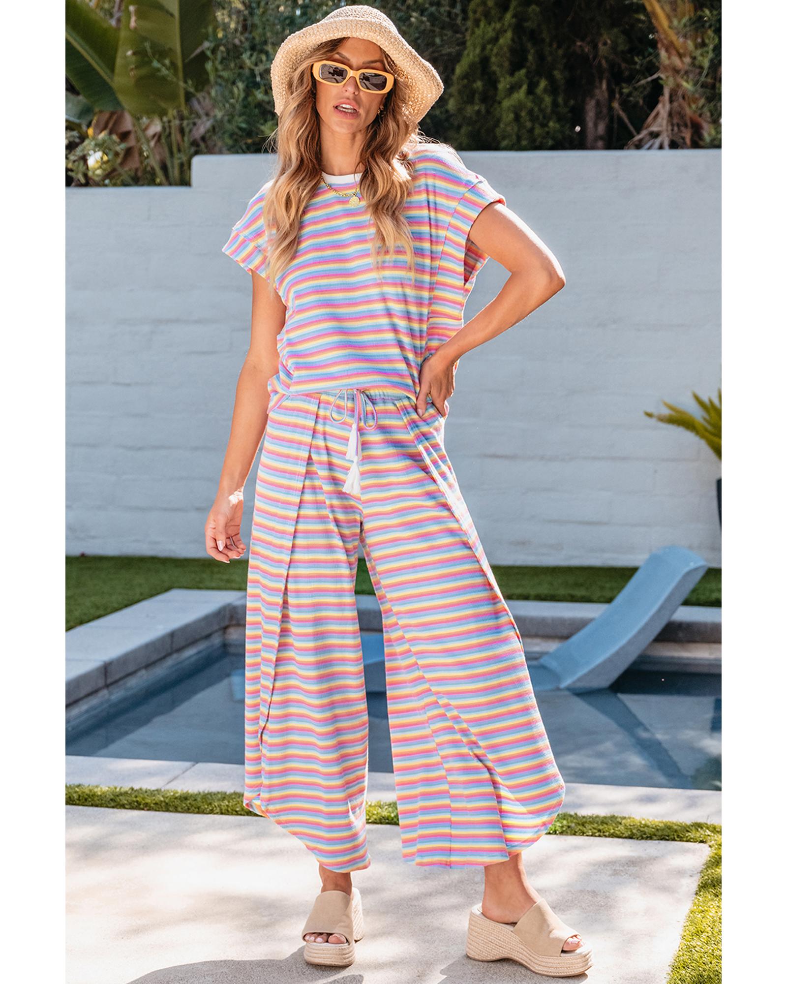 Pink Stripe Rainbow Tee Tasseled String Wide Leg Pants Set – XL
