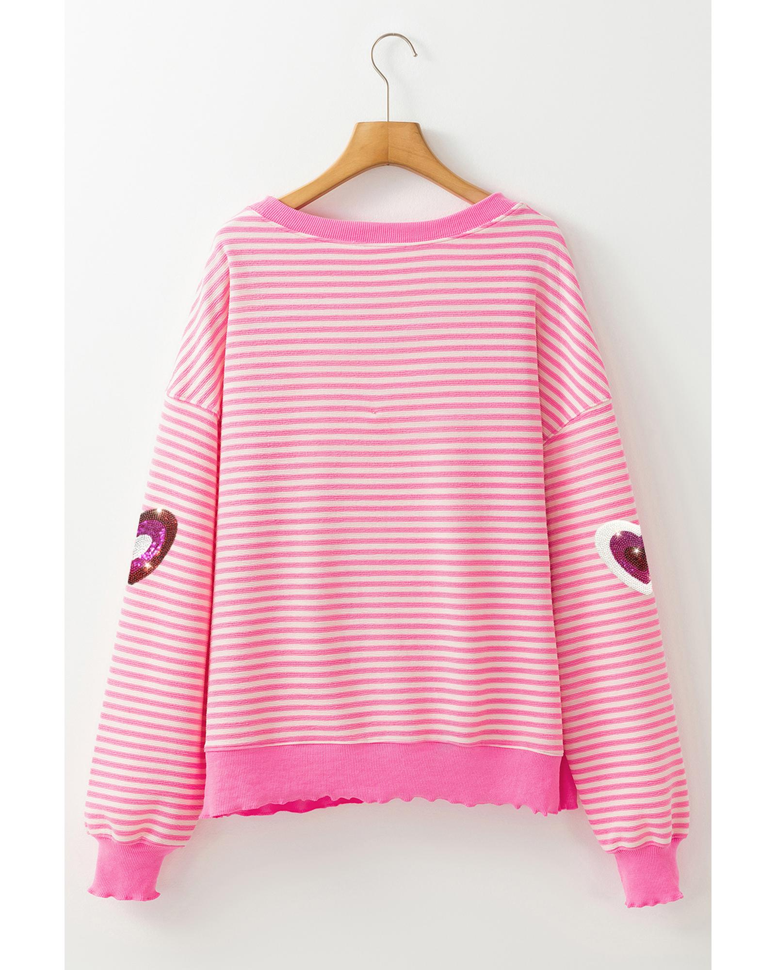 - Pink Stripe Sequin Heart Patched Pattern Long Sleeve Valentines Top