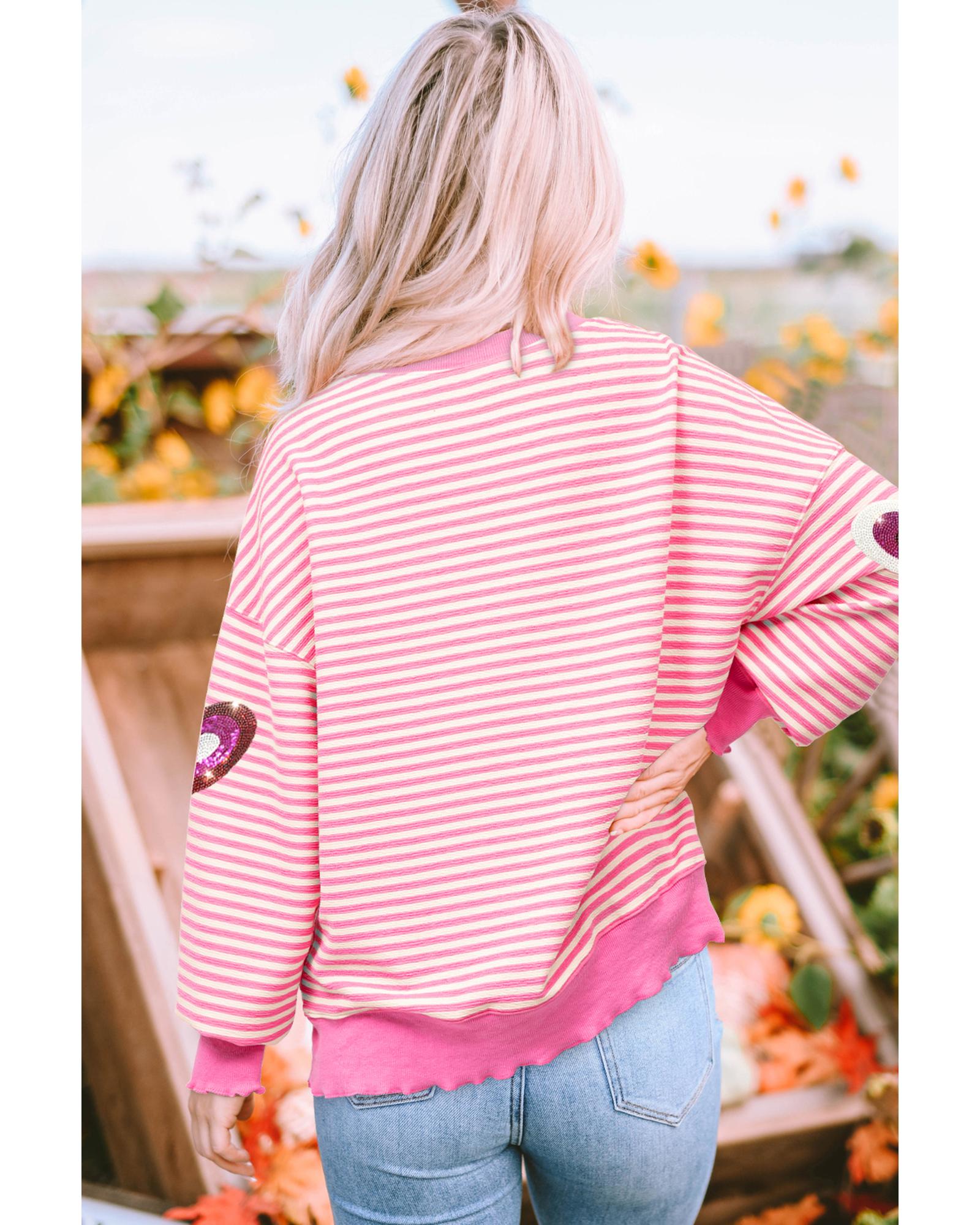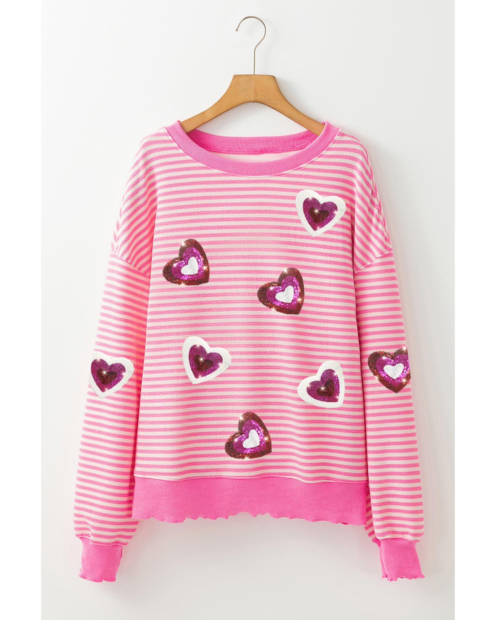 • Pink Stripe Sequin Heart Patched Pattern Long Sleeve Valentines Top