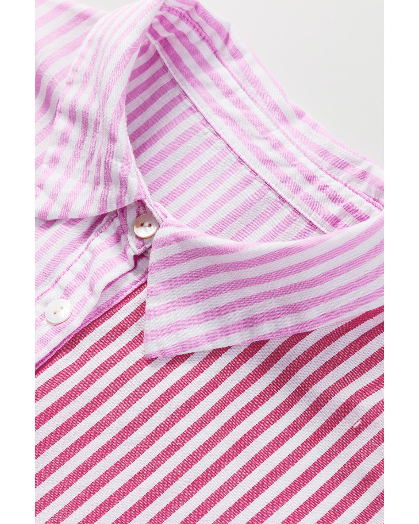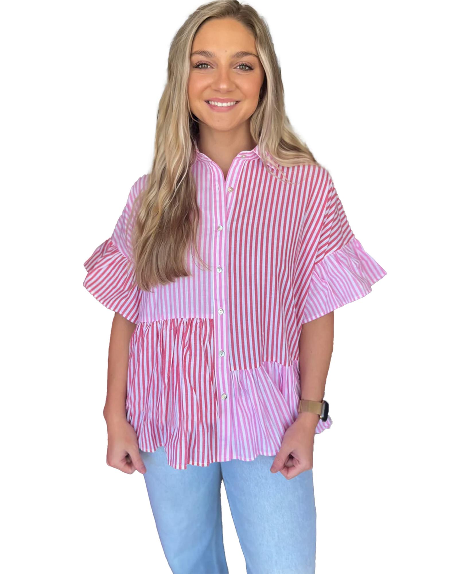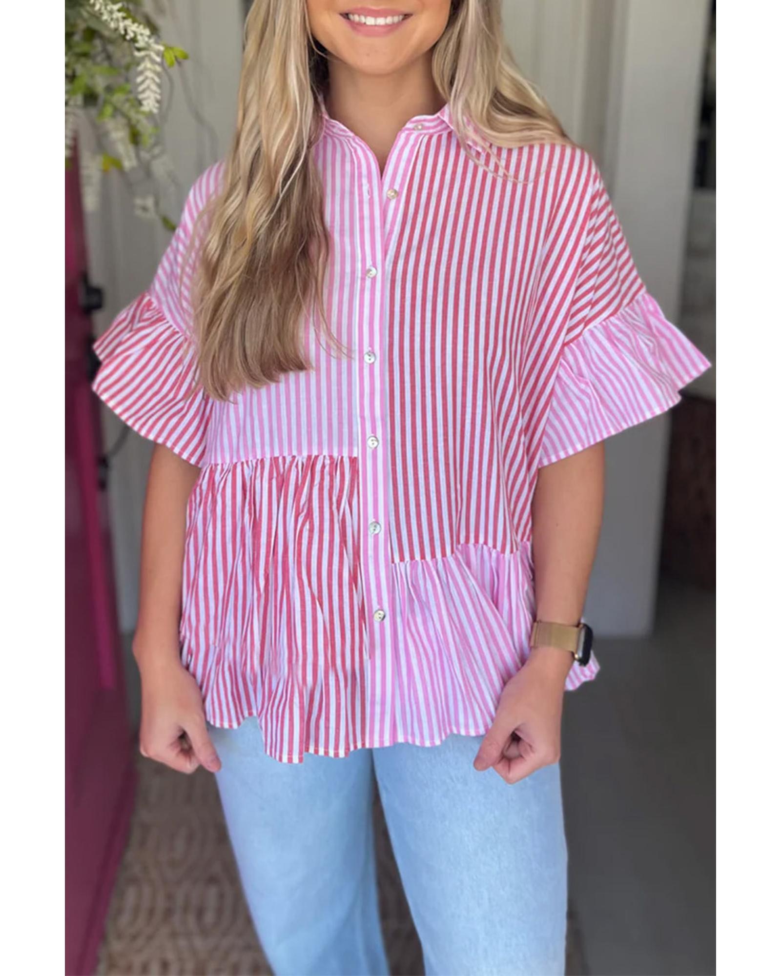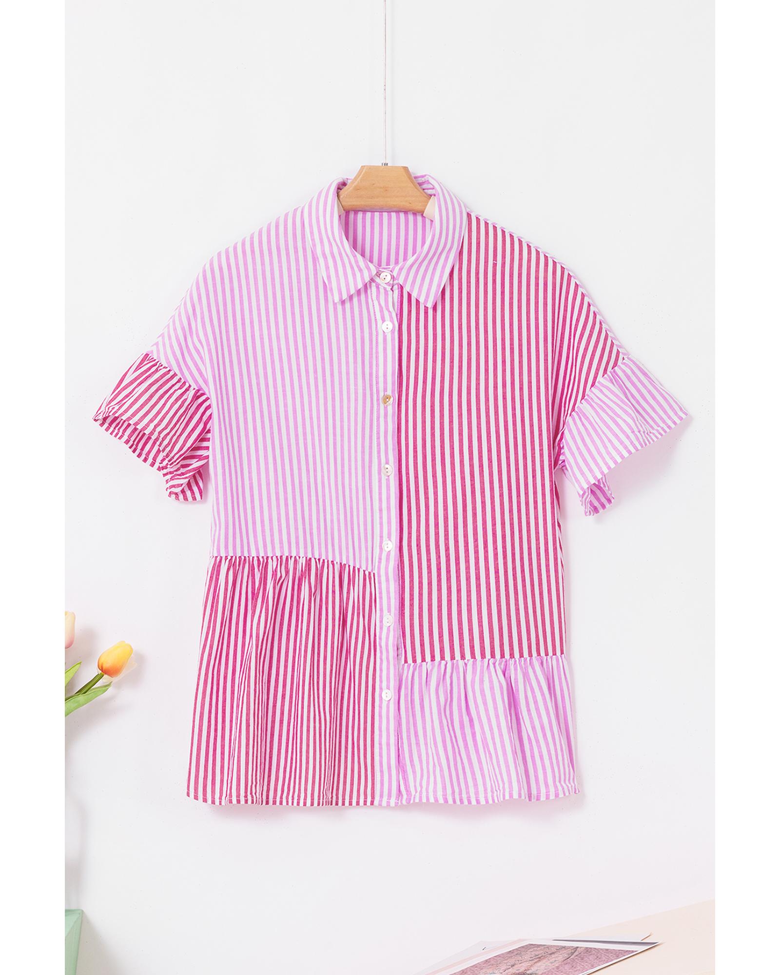 Pink Stripe Striped Patchwork Ruffled Hem Button up Shirt – M