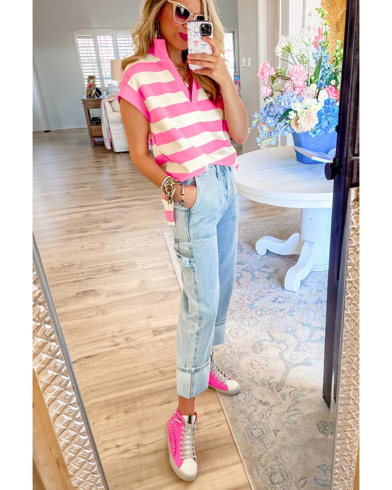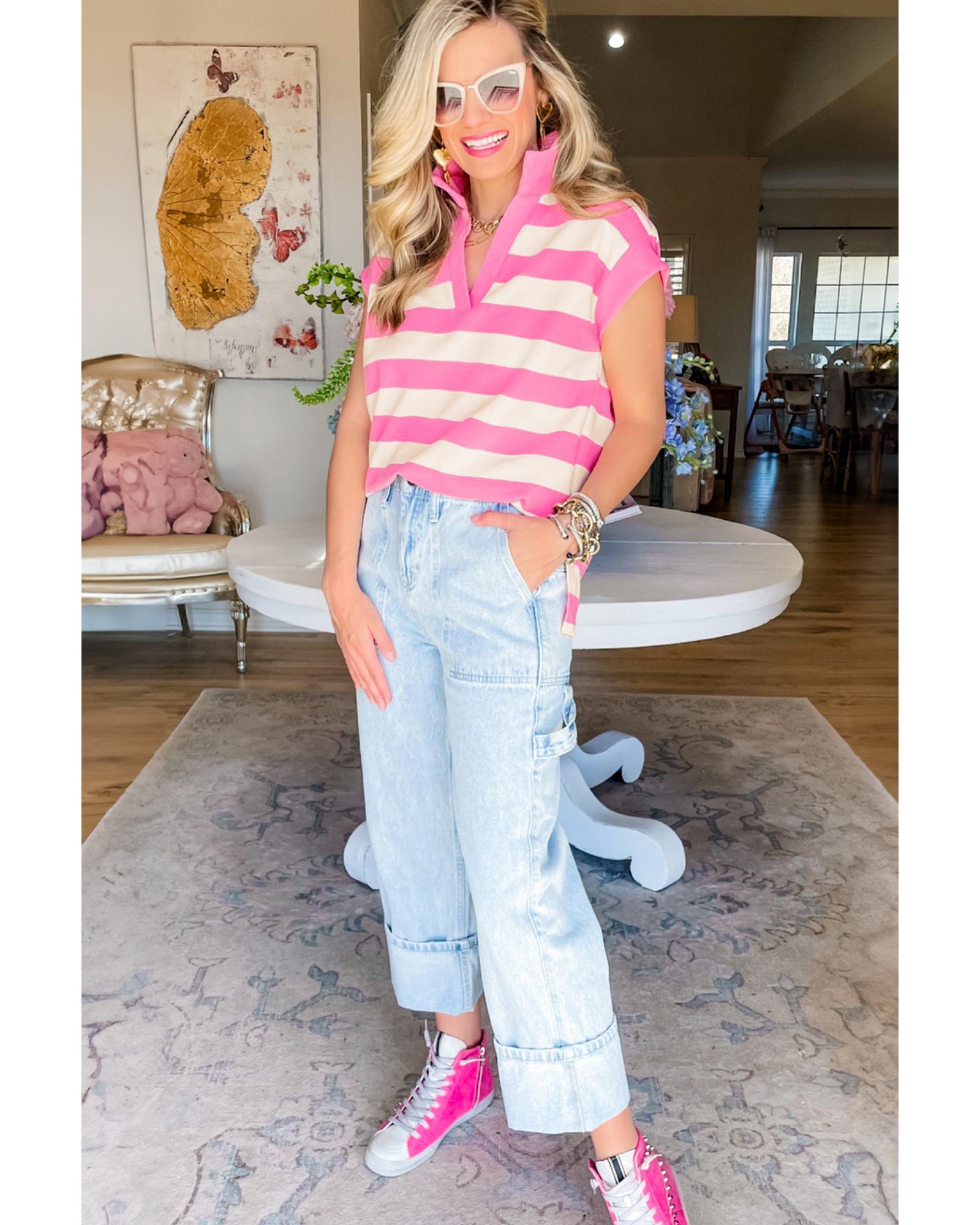 • Pink Stripe V Neck Collared Cap Sleeve Top