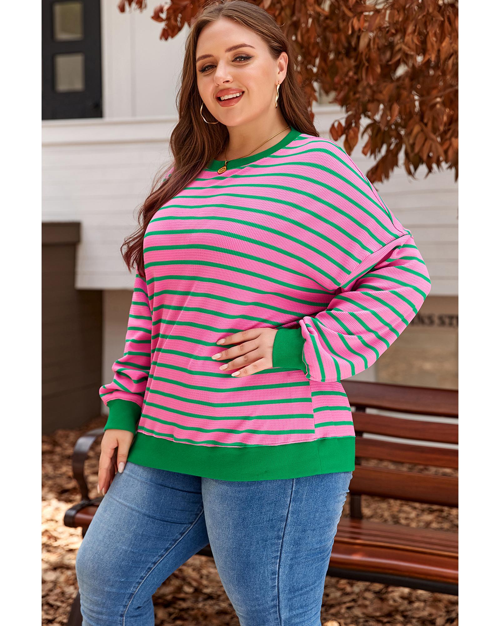 - Pink Stripe Waffle Knit Crew Neck Plus Size Sweatshirt