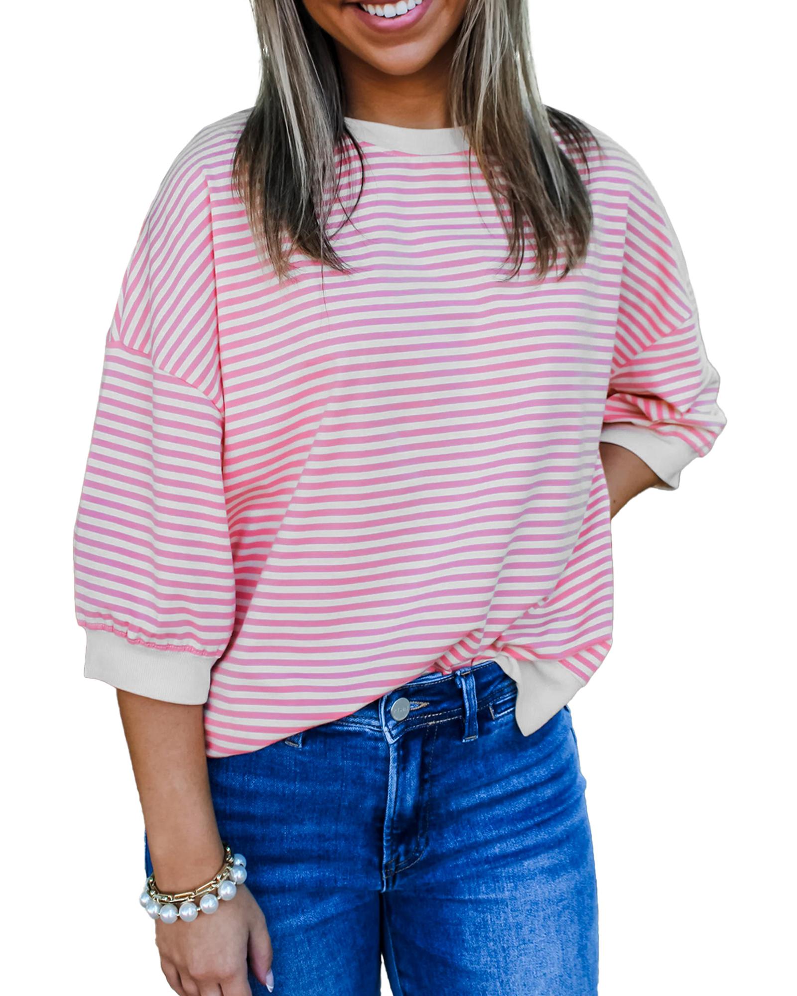 Pink Striped 3/4 Sleeve Drop Shoulder Top – L