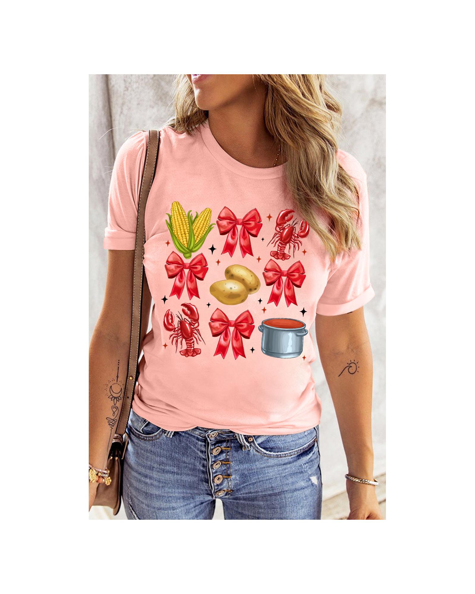 - Pink Summer Food Bow Crawfish Printed T Shirt