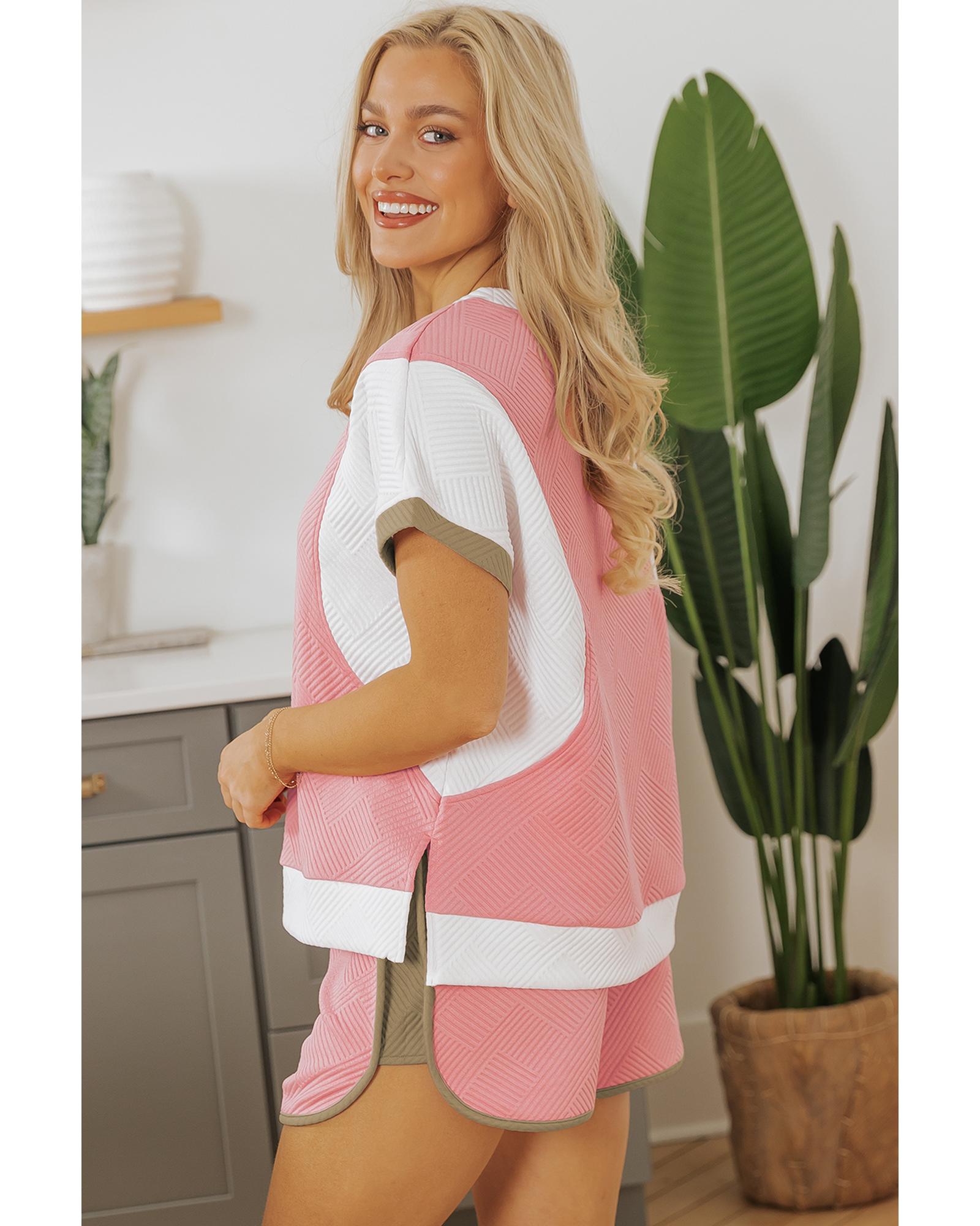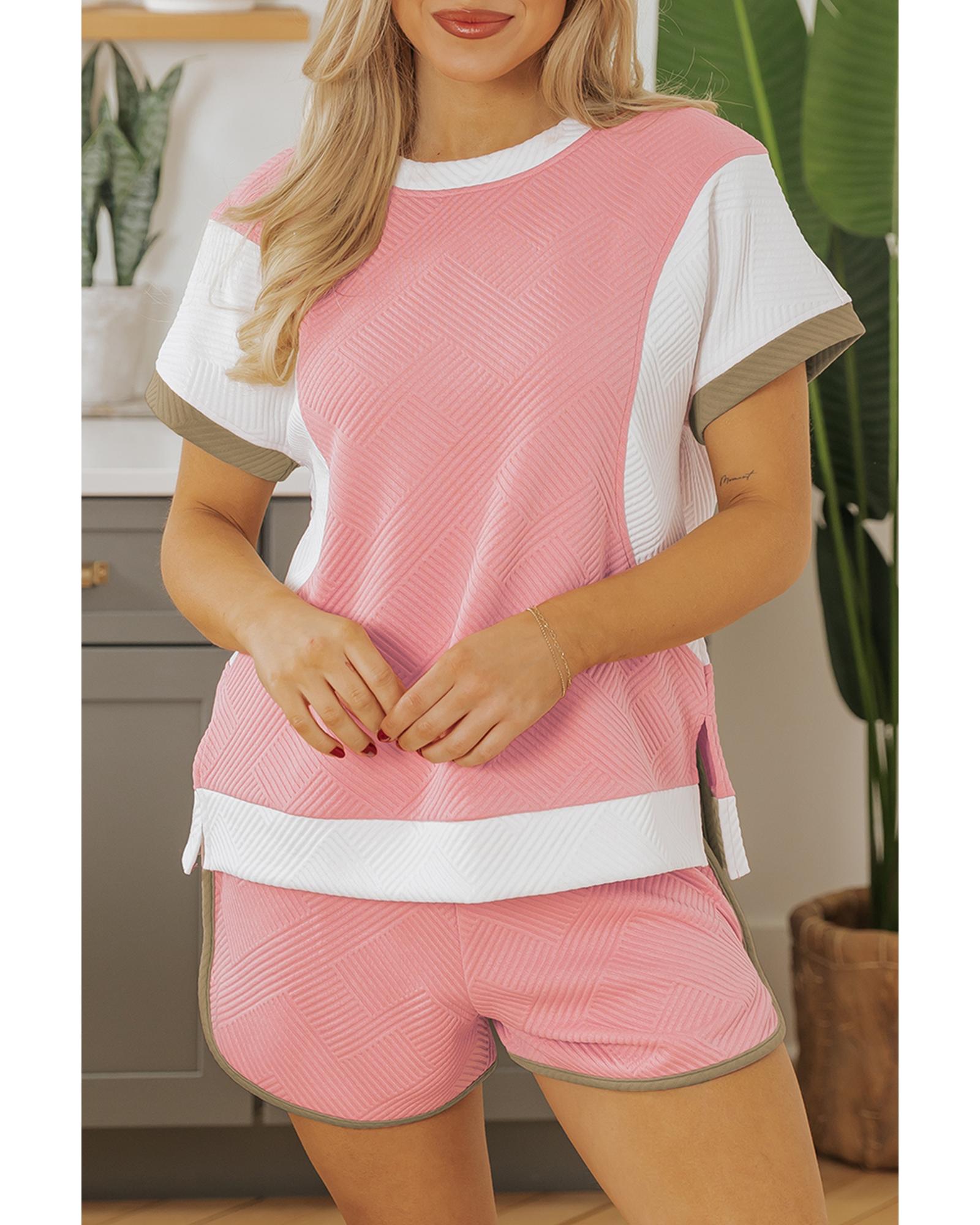 Pink Textured Colorblock Patchwork Tee Two Piece Shorts Set - S