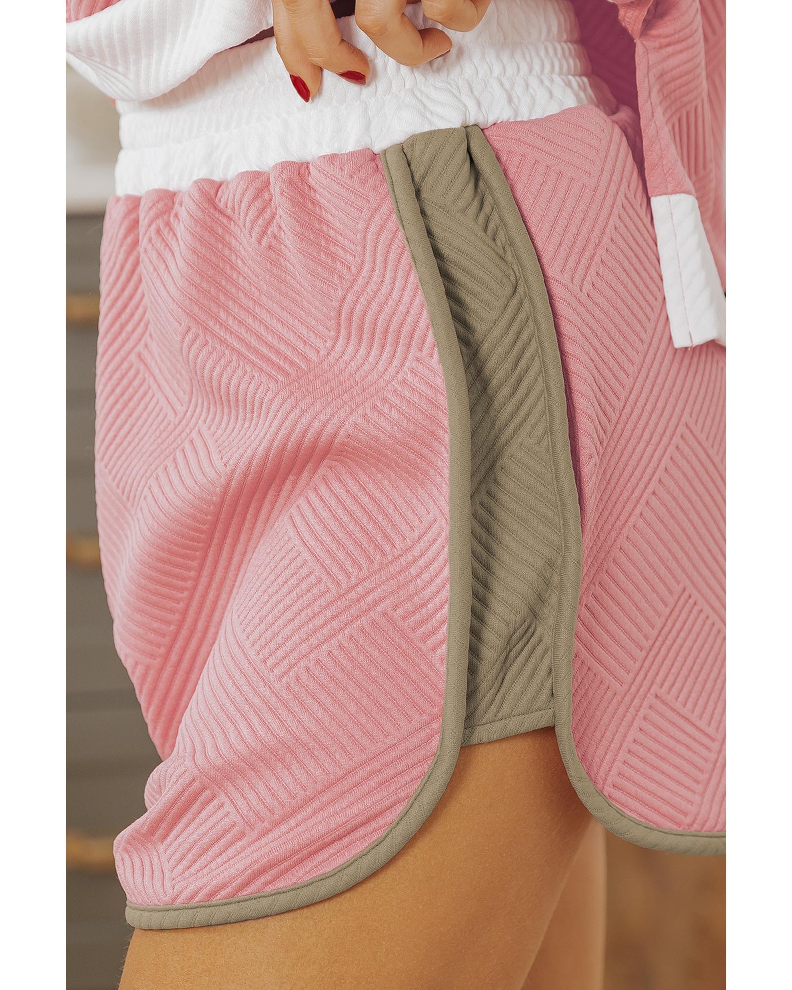 Pink Textured Colorblock Patchwork Tee Two Piece Shorts Set - M